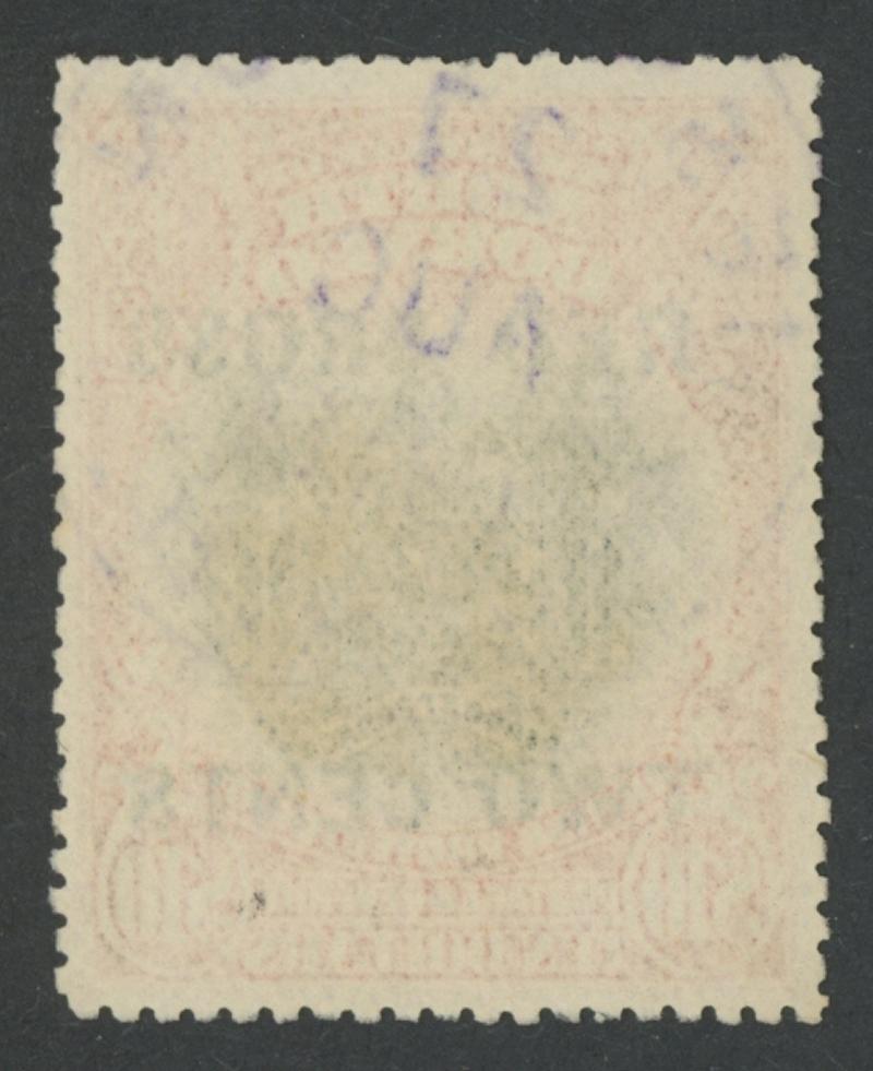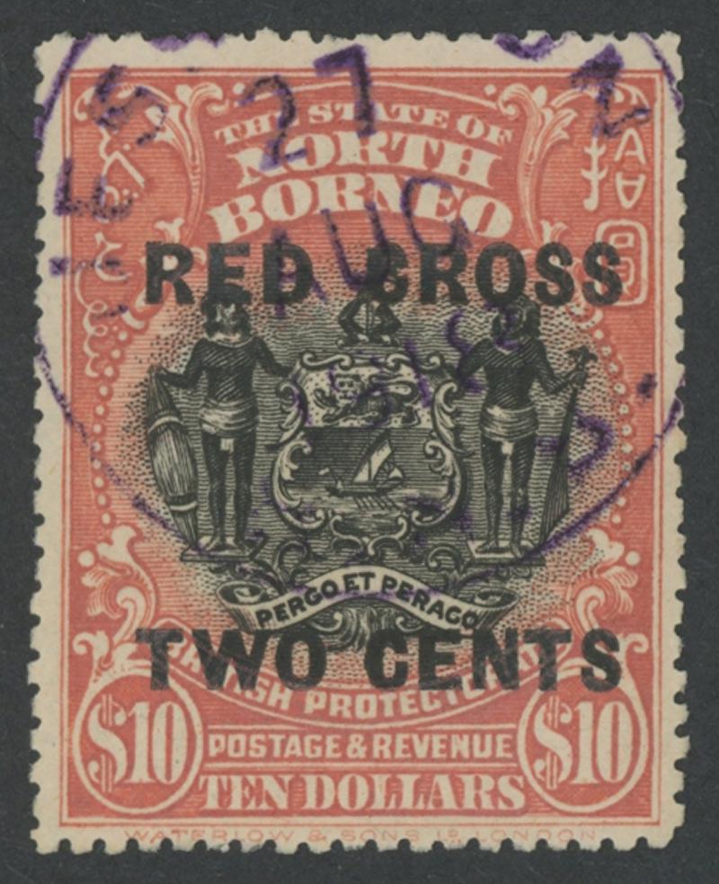 1918 'RED CROSS/TWO CENTS' Charity Surcharges on Arms $10 black & brick-red SG 234, well-centred, large-part 'JESSELTON/27/AUG/18'