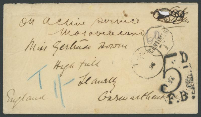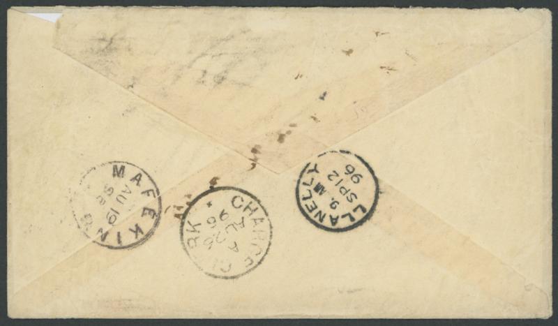 Bechuanaland with 'MAFEKING' transit and 'CHARGE CLERK' (Cape Town) backstamp where '["60"]/CENTIMES/ T '-in-octagon handstamp added, superb '5D/F.B.' handstamp of London, superb 'LLANELLY/SP12/96' arrival backstamp of FE19/94, small fault at