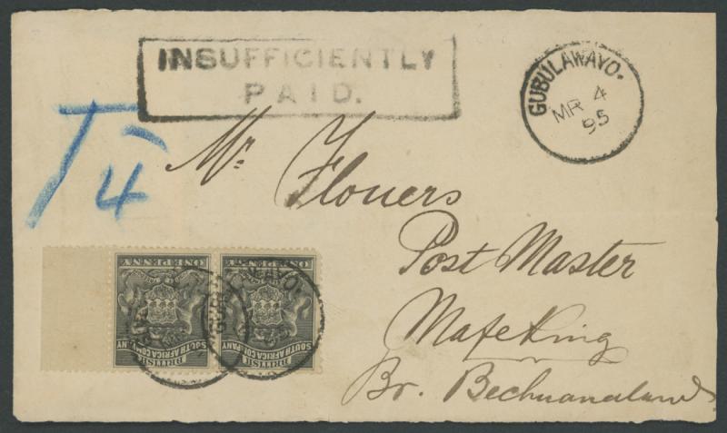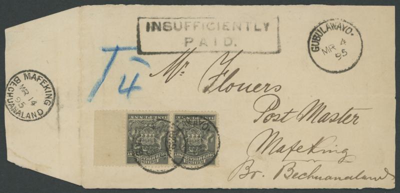 of three very fine strikes of 'GUBULAWAYO/MR4/95' cds, fine boxed 'INSUFFICIENTLY/PAID' handstamp (not recorded by Ted Proud) and "T4d" in blue pencil, superb 'MAFEKING/MR14/95/...' arrival backstamp, light horizontal fold. (Image1) (Image2)