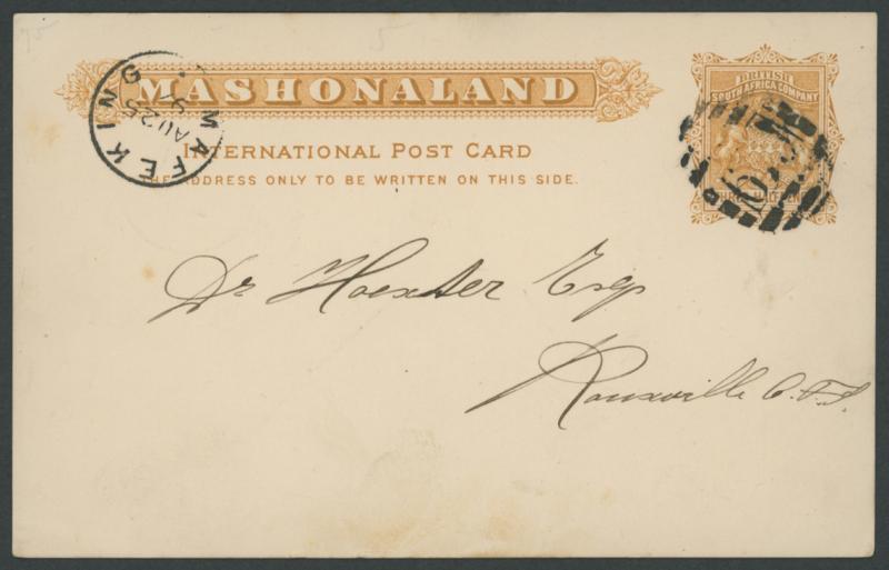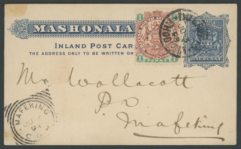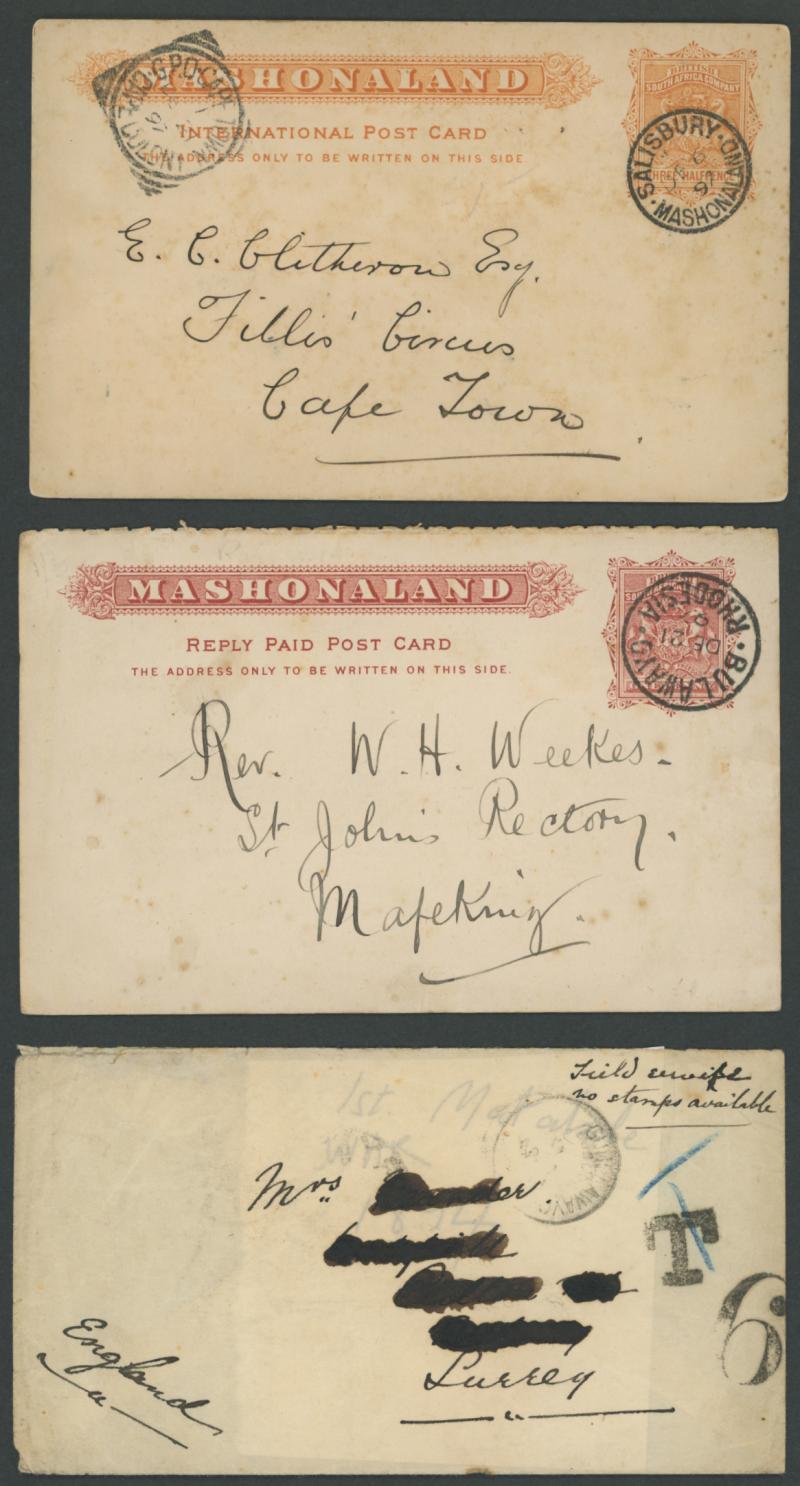 obliterated; commercial/social usages of Postal Cards 1d reply-half Bulawayo to Mafeking, 1½d to Cape Town with superb 'SALISBURY/MASHONALAND' cds (and another philatelically used at Mafeking) and BSAC 1d Bulawayo to Cape Town; 1897 British 1d Postal