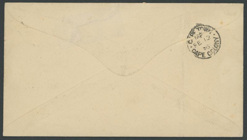 'GUBULAWAYO/JA15/9' (no year slug) cds, sent via Bechuanaland with 'VRYBURG' and 'PALAPYE' transit backstamps, superb '6D' handstamp of Cape Town (?), arrival backstamp of FE19/94, overall soiling and roughly opened. The conflict ran between