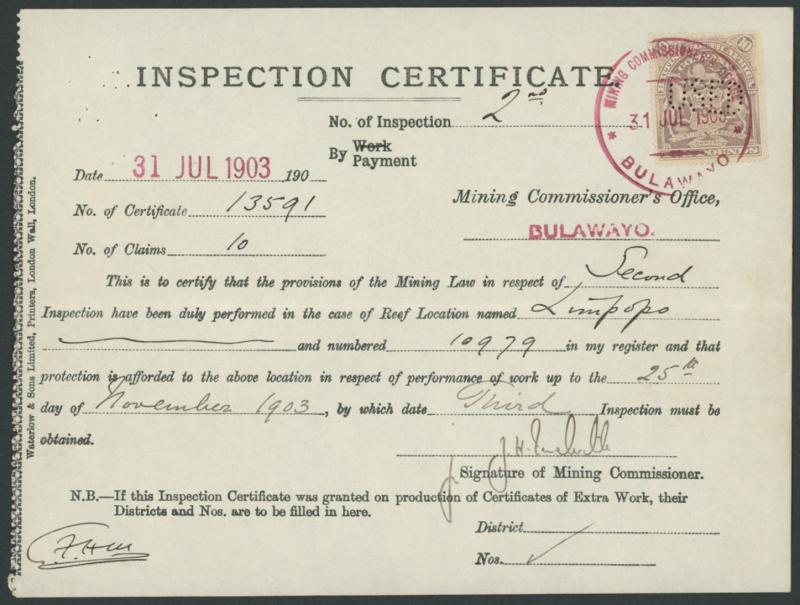 blemishes as should be expected; and 1903 Inspection Certificate with 1898-1908 Arms £10 lilac punctured 'USED' through the document & tied by 'MINING COMMISSIONERS OFFICE/31JUL1903/BULAWAYO' cachet in red-violet, very fine.