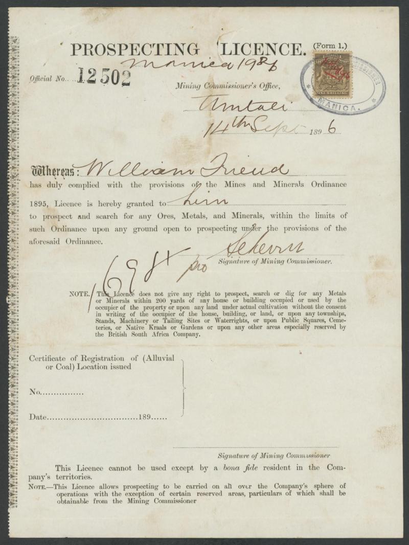 REVENUES: 1896 Prospecting Licence with 1892-93 1/- brown tied by oval 'MINING COMMISSIONER/ MANICA' cachet in violet, minor