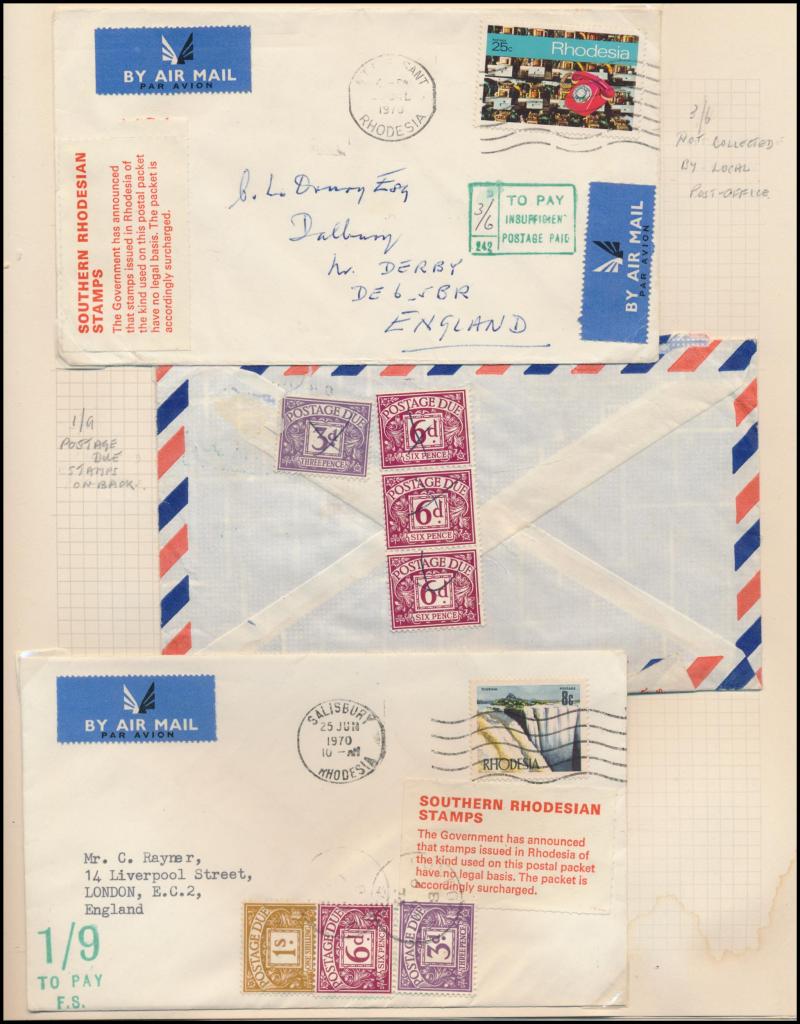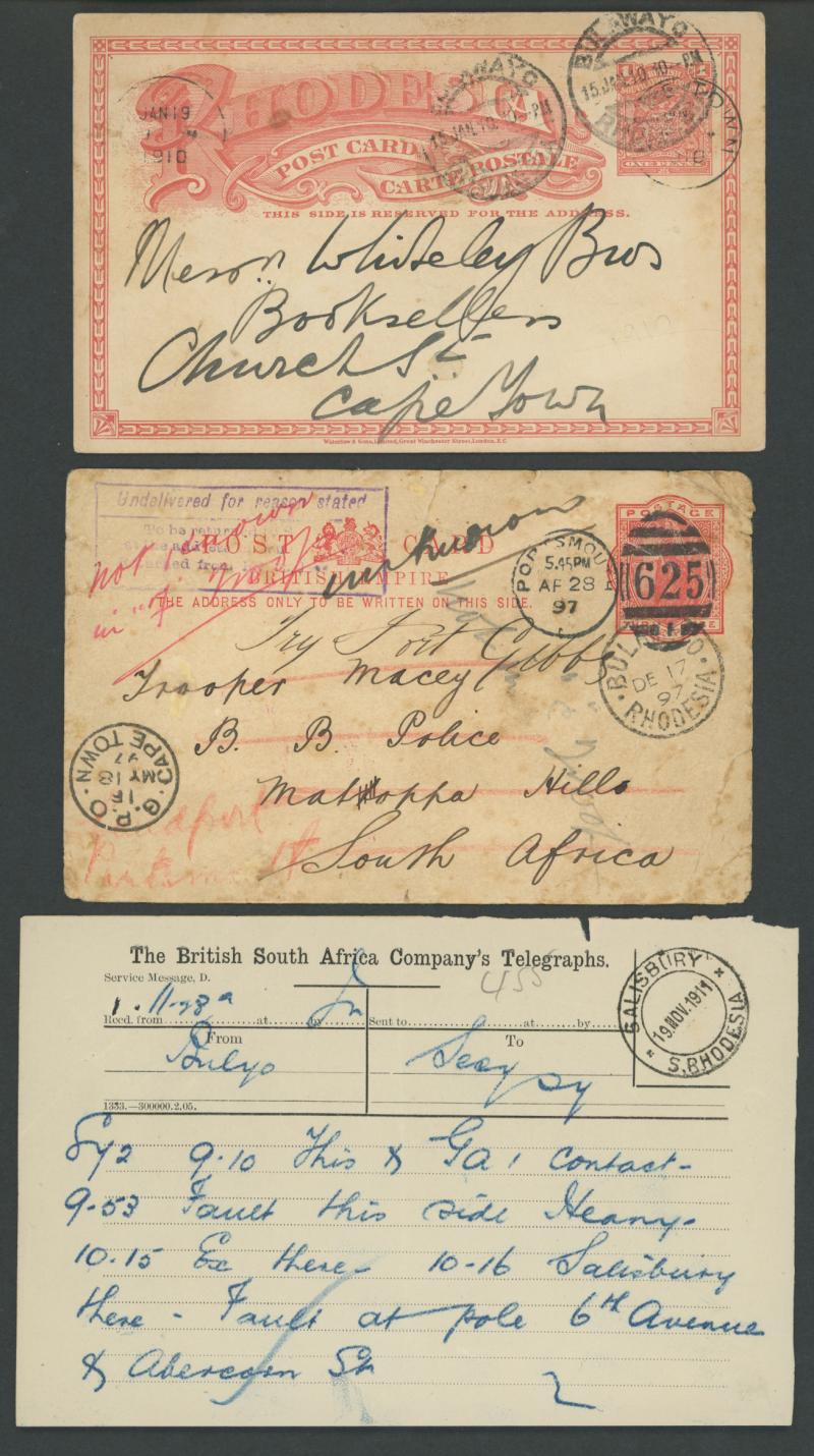 Card to "BB Police/Mattapoppa Hills/South Africa" twice redirected with Bulawayo transit and endorsed "not known/in F Troop", Cape Town cds and RLB backstamp, faults; and 1911 small BSAC telegram with superb 'SALISBURY/S.RHODESIA' cds; mixed