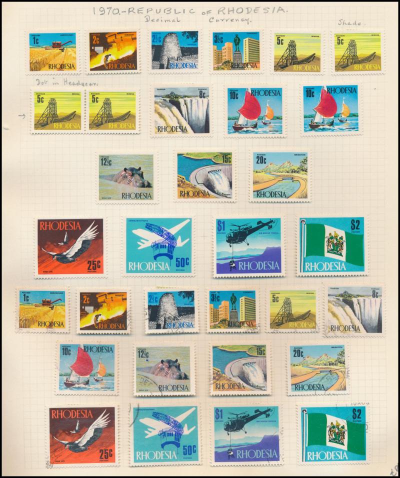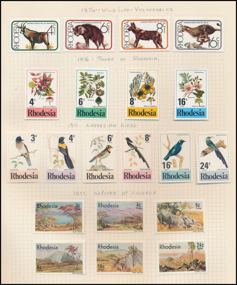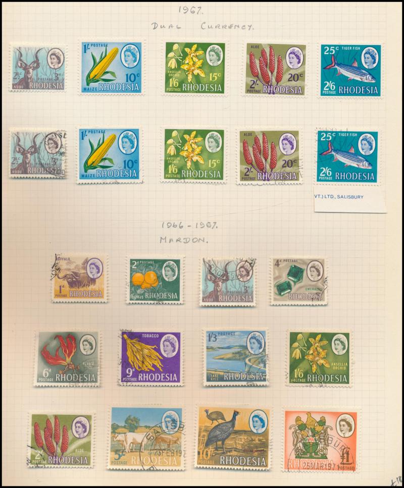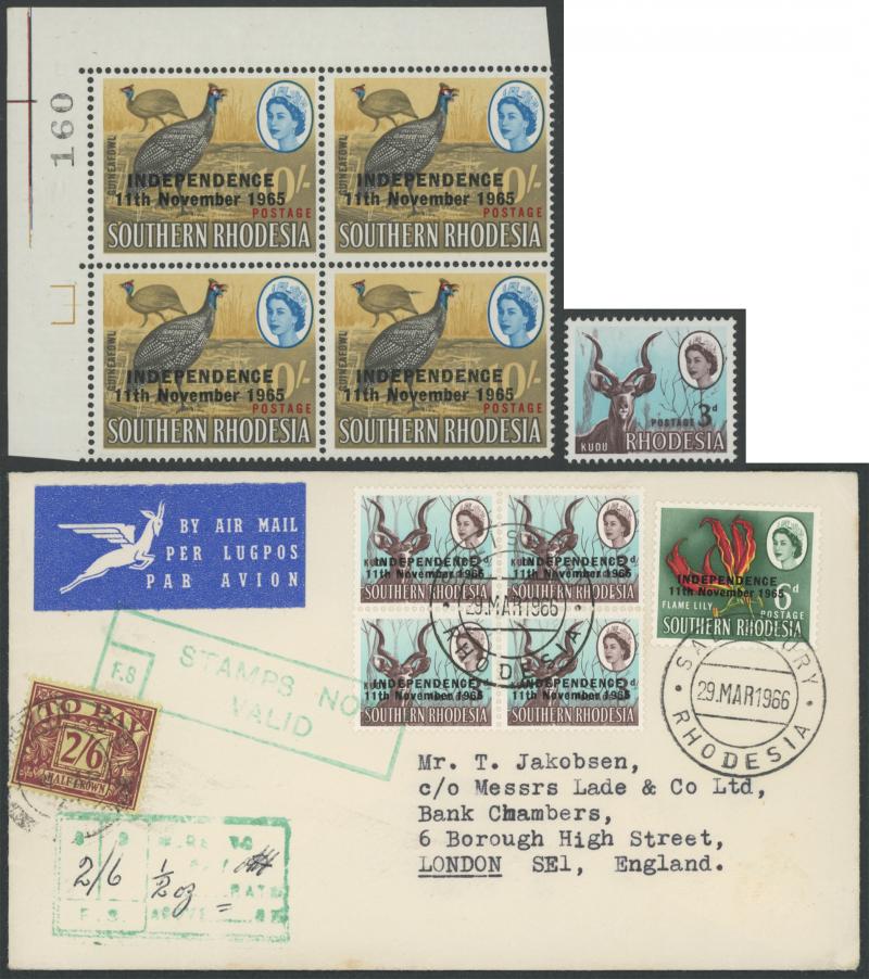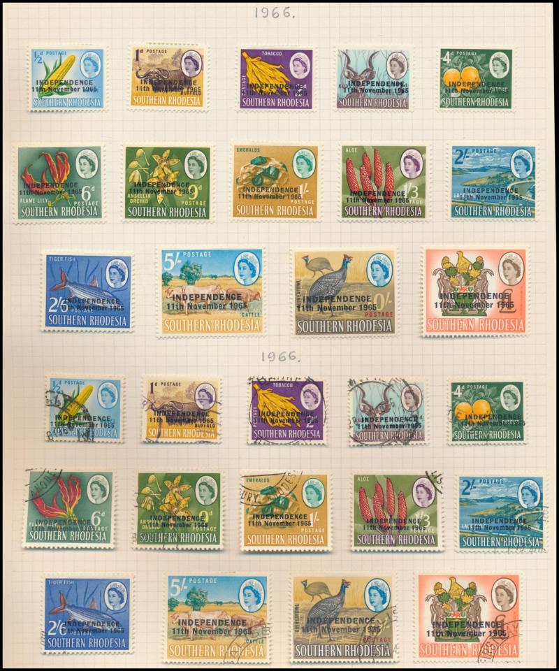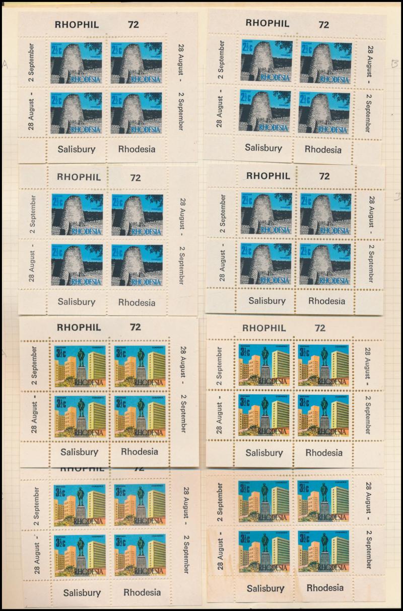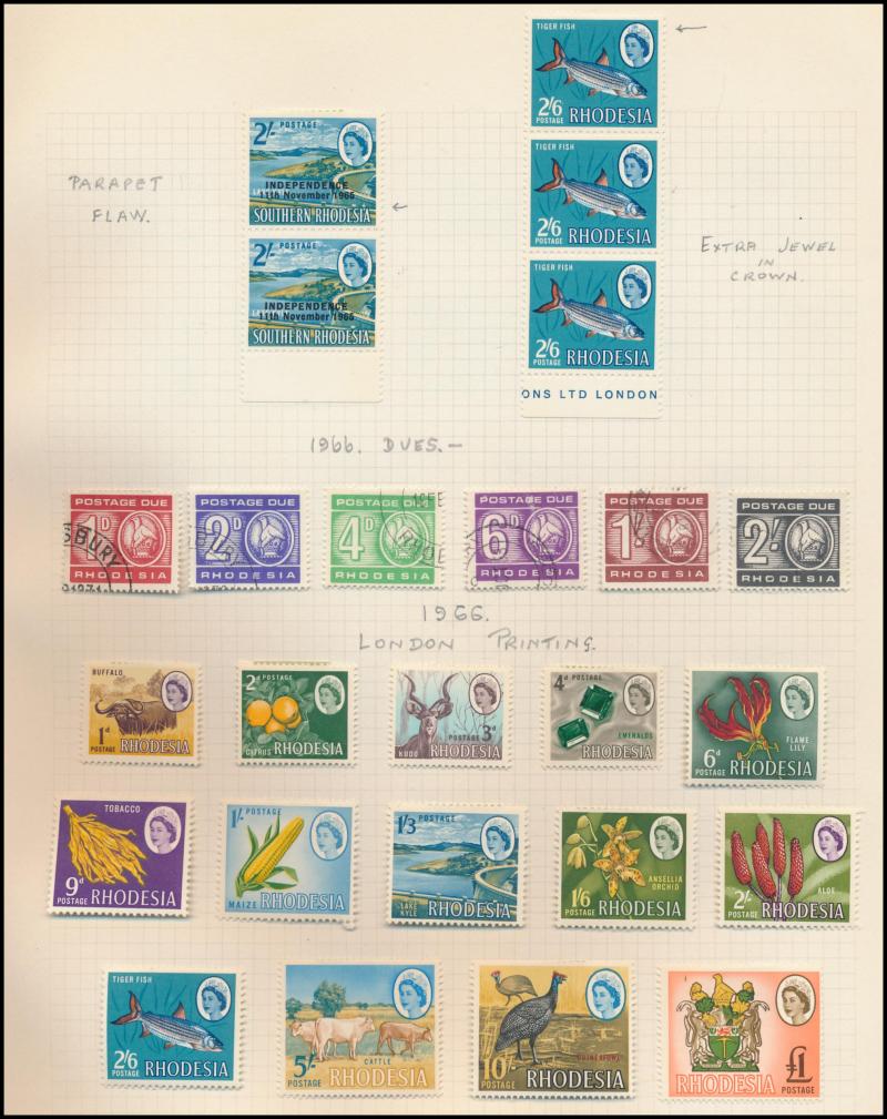 CTO) to 1976 including lots of extras noted 1966 Overprints on Southern Rhodesia Pictorials 10/- block of 4 from the upper-left corner of the sheet the lower-right unit with Extra Feather, various offsets of the overprints, 1966 Rhodesia Pictorials