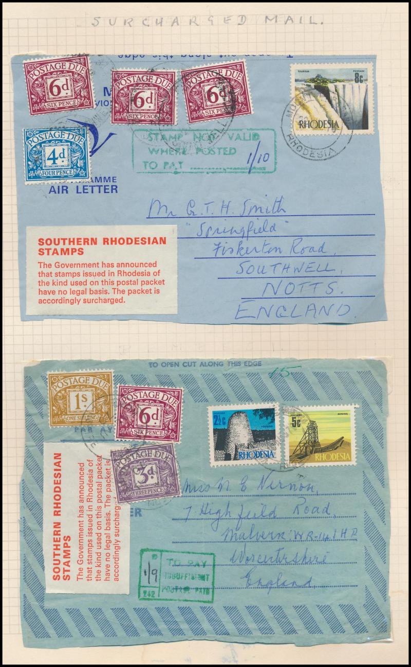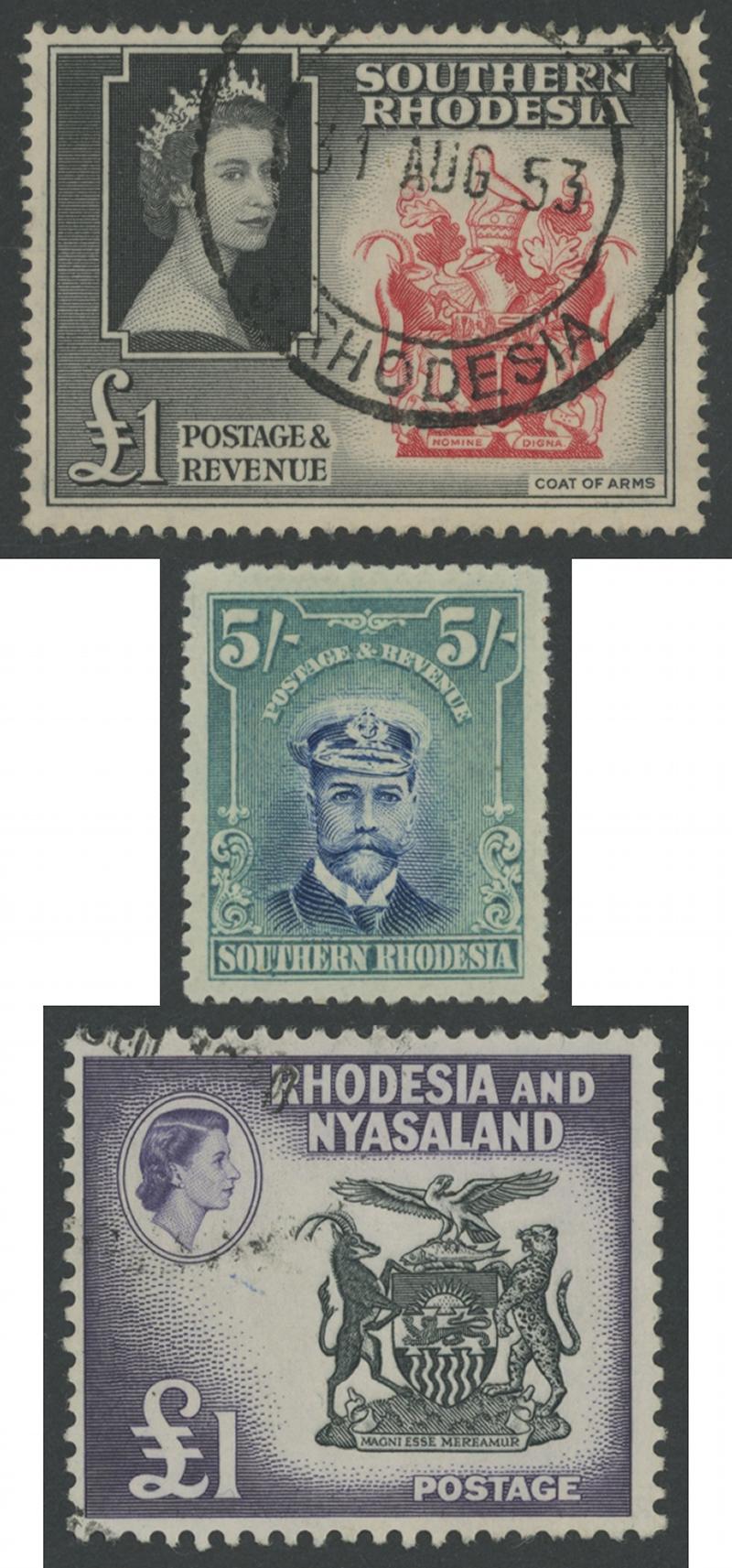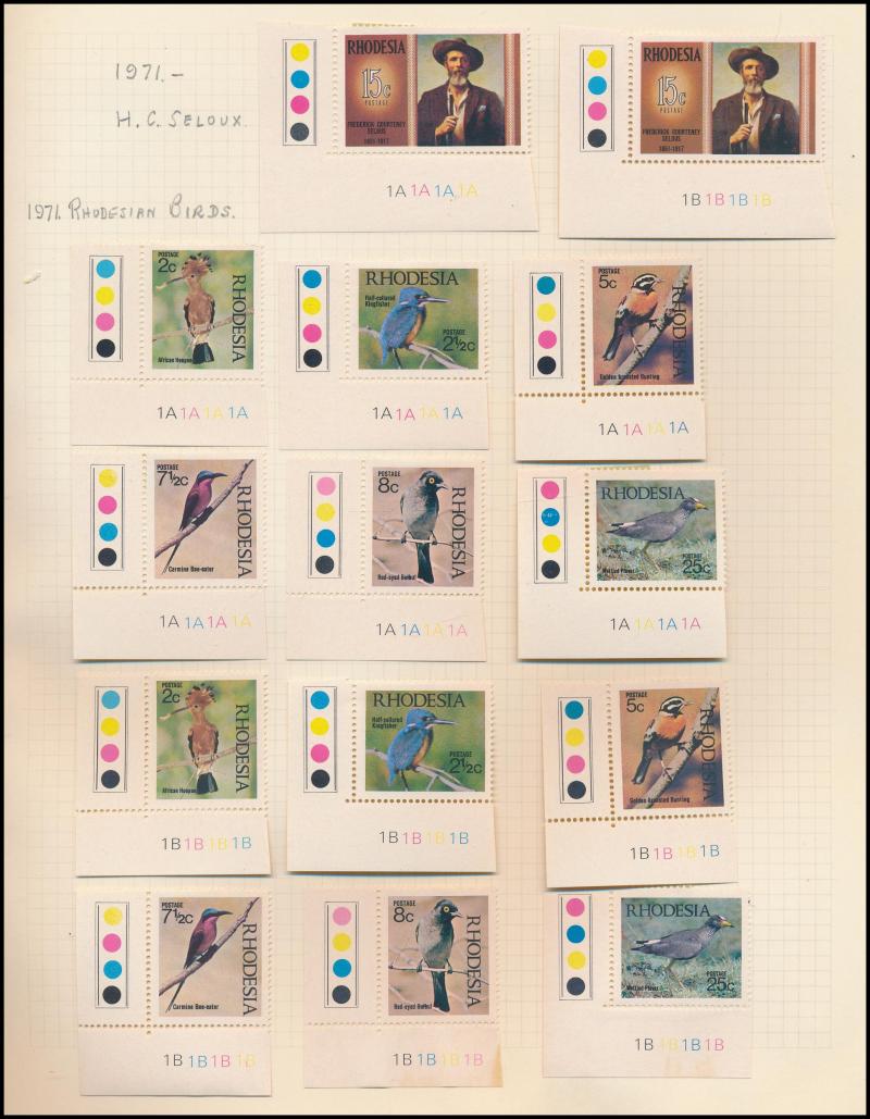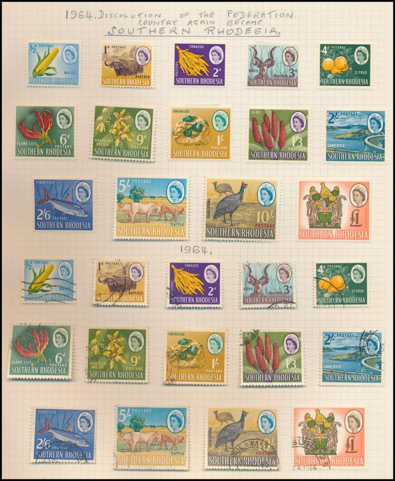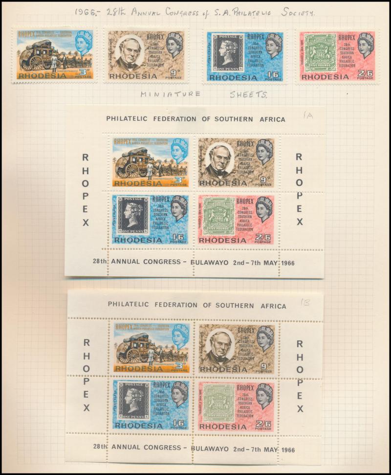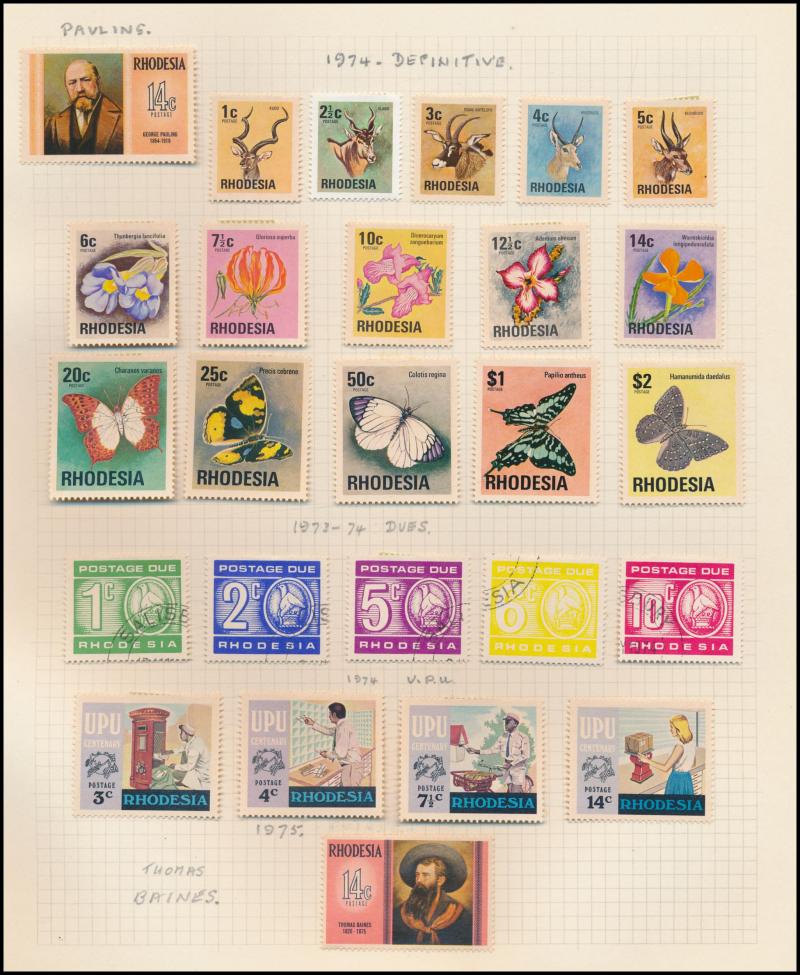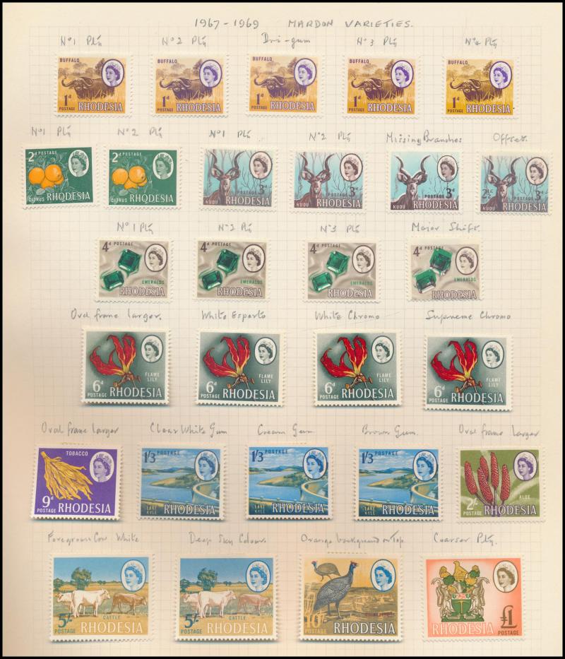 CTO) to 1976 including lots of extras noted 1966 Overprints on Southern Rhodesia Pictorials 10/- block of 4 from the upper-left corner of the sheet the lower-right unit with Extra Feather, various offsets of the overprints, 1966 Rhodesia Pictorials
