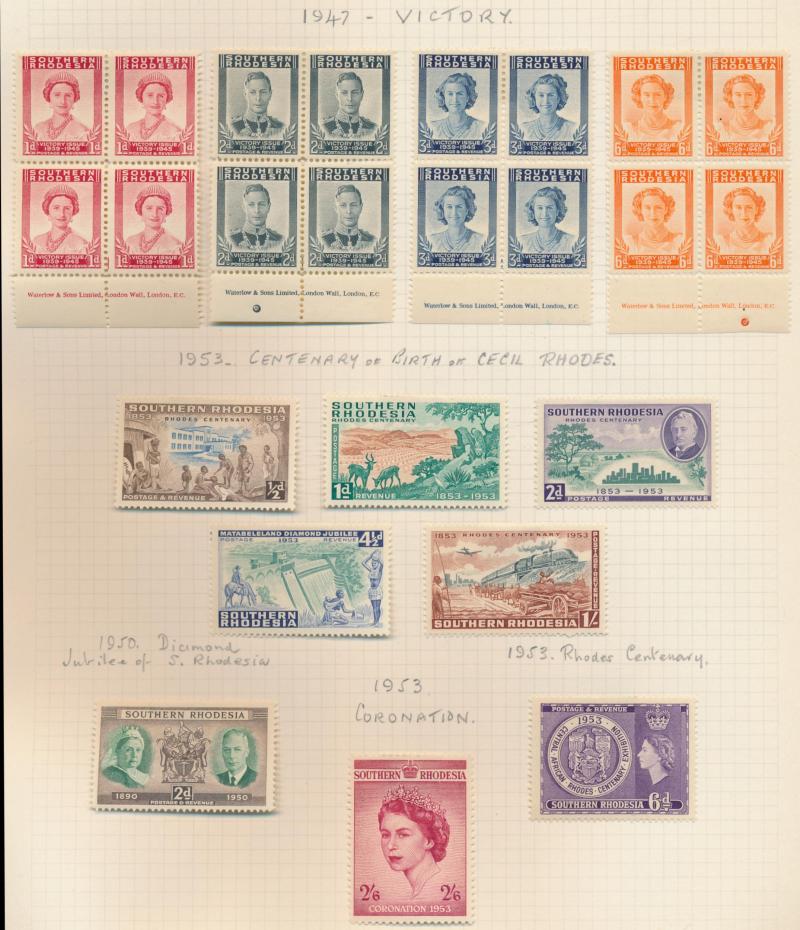 coil join pairs, 1847 Victory Waterlow & Sons Imprint blocks of 4, 1953 & 1964 QEII Pictorials sets * & used plus 10/- Guineafowl 'Extra Feather' flaw ** in pair with normal, 1966 Independence overprints QEII Pictorials set * & used and 'RHODESIA'