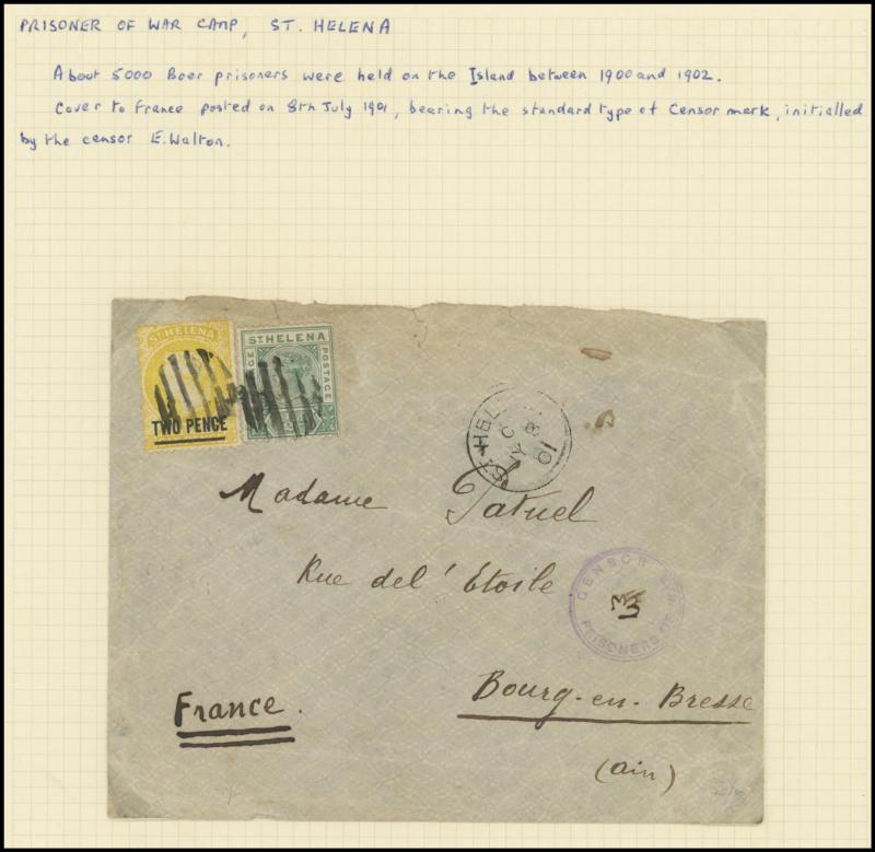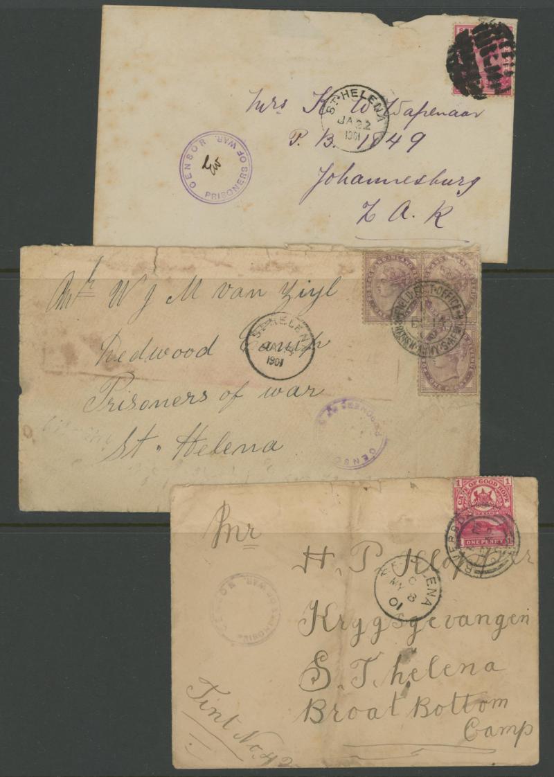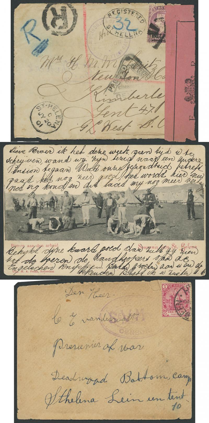 CAMP' & oval 'REGISTERED/ST HELENA', cover with the censor cachet & "EW", censor cover to France with Keyplate ½d & 'TWO PENCE' on 6d yellow, cover to Transvaal with 'CENSOR/("JMHB")/PRISONER OF WAR' & '2½d' on 6d blue, covers from South Africa to