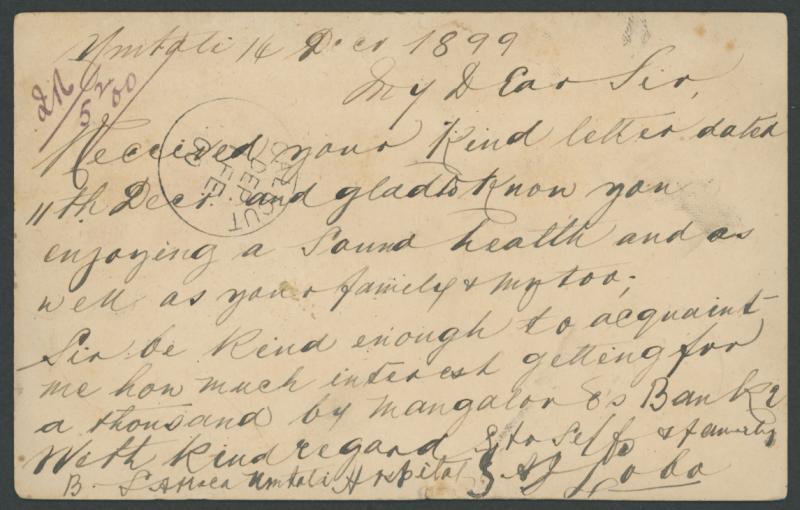 various Indian cds of 'TUTICORIN', 'CALICUT' and 'MANGALORE' plus boxed Postage Due handstamp all on the face, the message from an Indian doctor at "Umtali Hospital" asks about bank interest rates, minor blemishes. (Image1) (Image2)