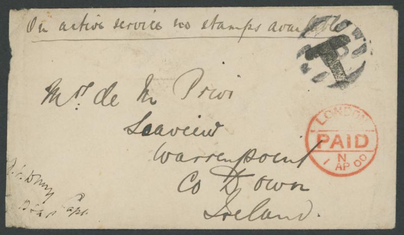 "Warrenpoint/Co Down/Ireland" with 'BULAWAYO/RHODESIA' backstamp and bold 'T' handstamp (Proud UP1) overstruck with 'FB'-in-bars with 'LONDON/PAID/1AP00' (April Fools Day) in red below, minor imperfections. (Image1) (Image2)