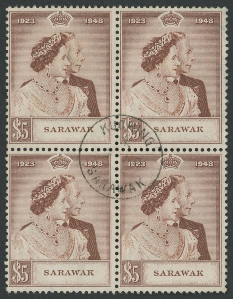 1948-49 Royal Silver Wedding $5 brown SG 166 block of 4 with neat central Kuching cds cancel, Cat £260+. (Image1) (Image2)