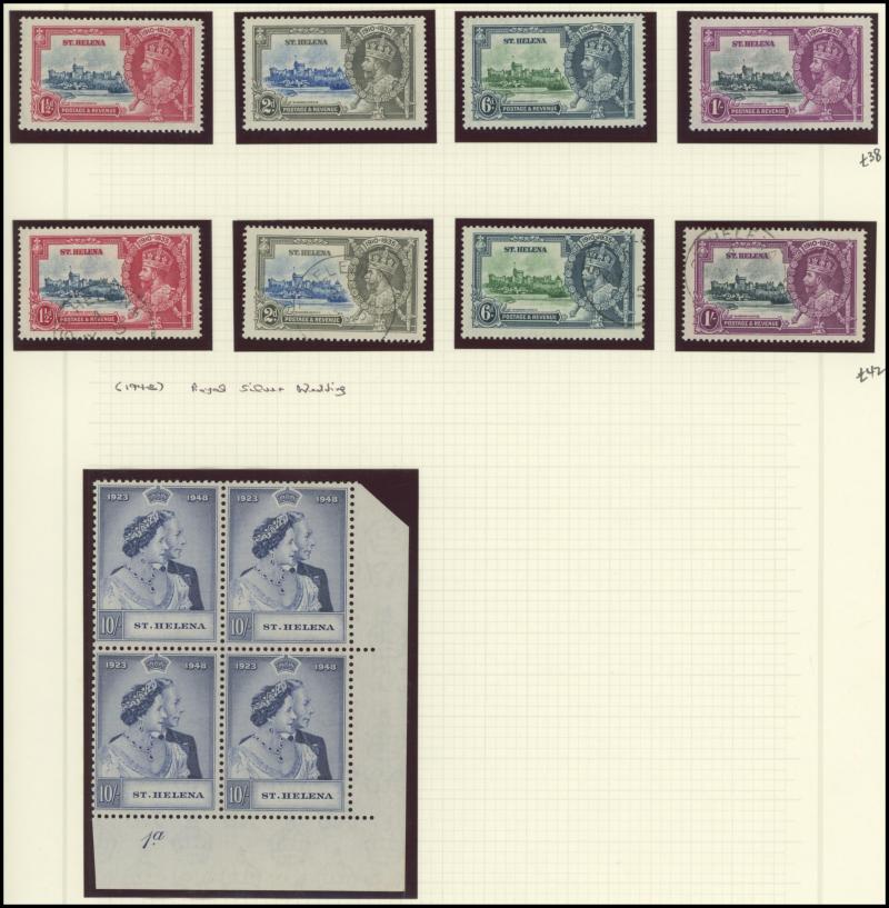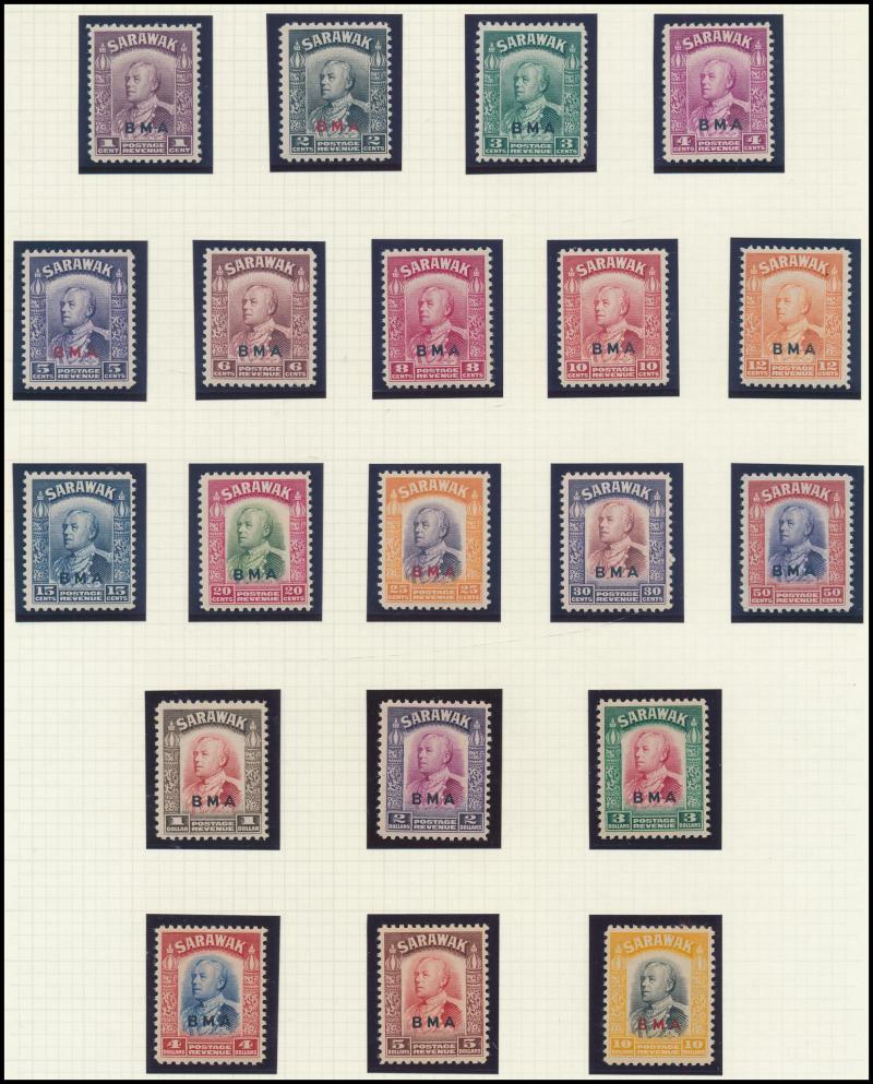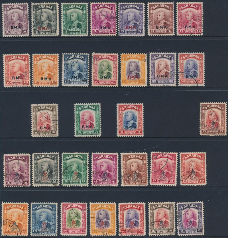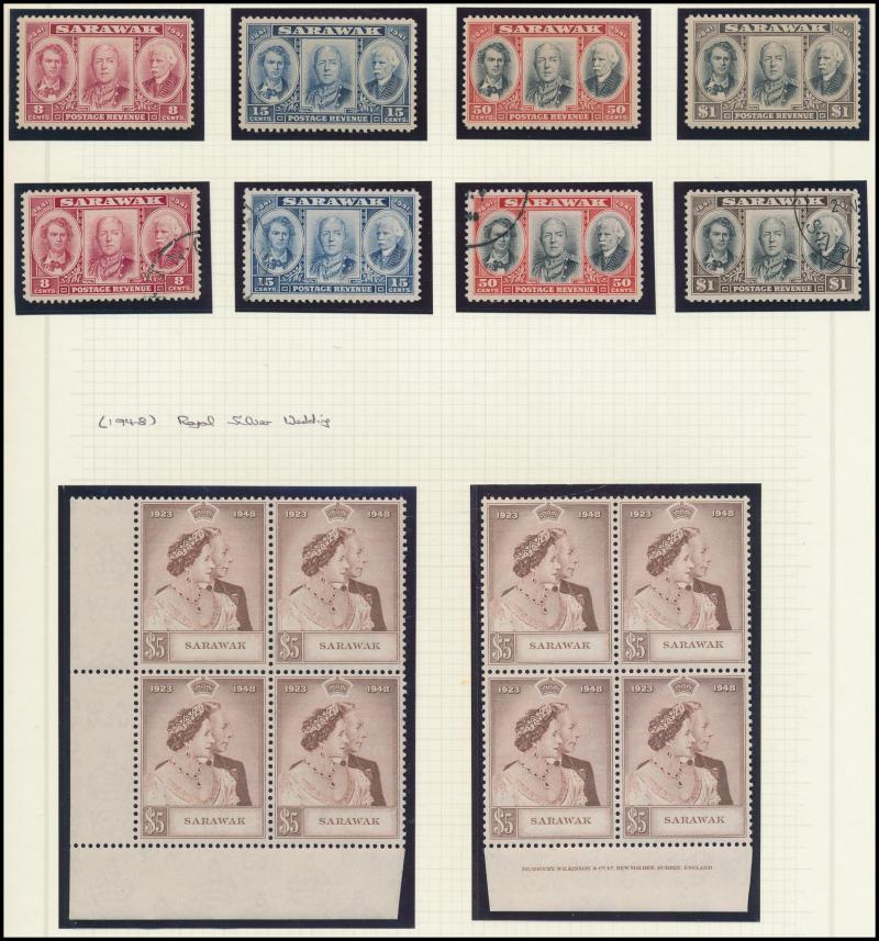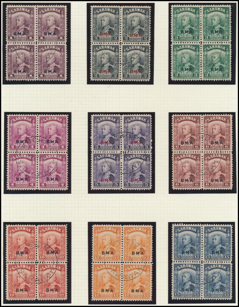 then 1945 'B.M.A.' Overprints set ** and used/CTO (ex $2 & $5) plus 1c to 15c in blocks of 4 CTO, 1946 Centenary set * & used, 1947 Cypher Overprints set ** & used, 1948 Silver Wedding Bradbury Wilkinson Imprint block of 4 ** plus another corner