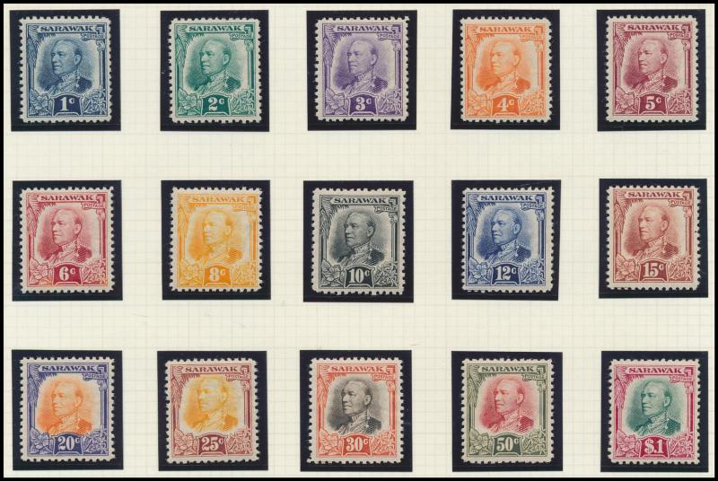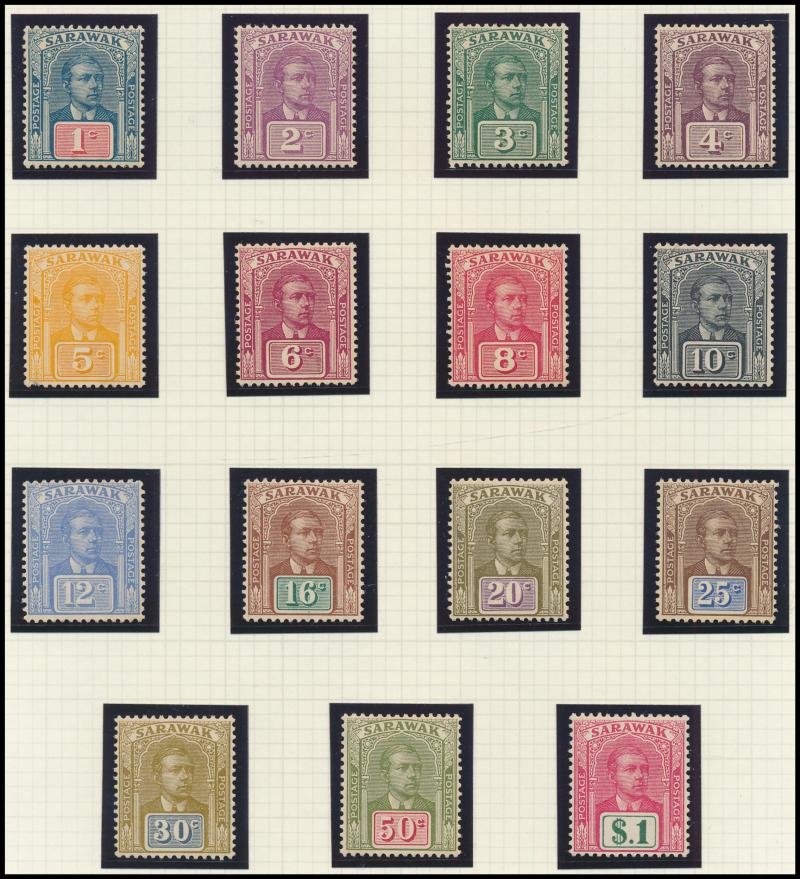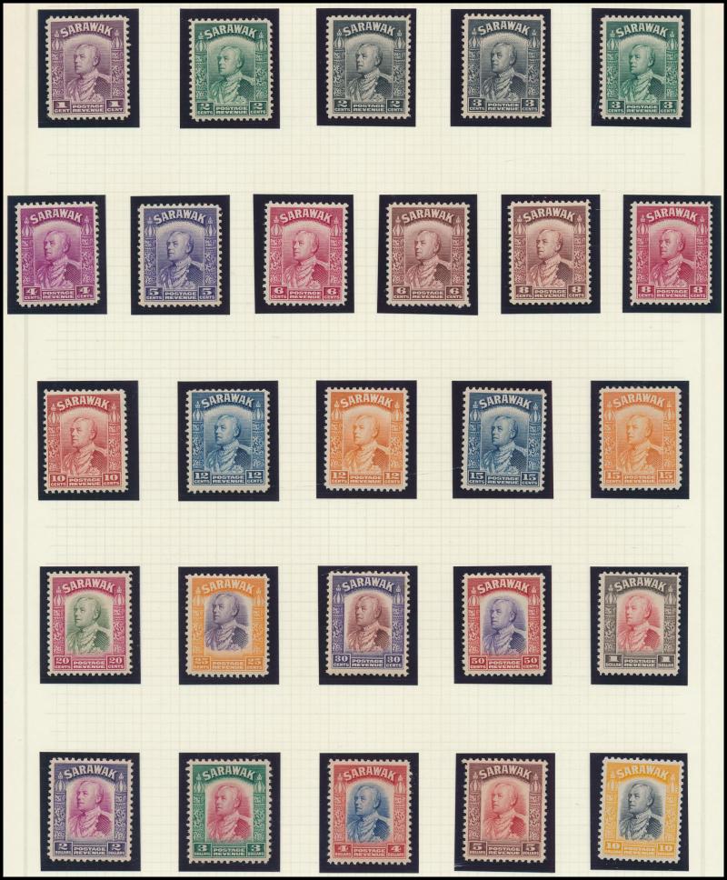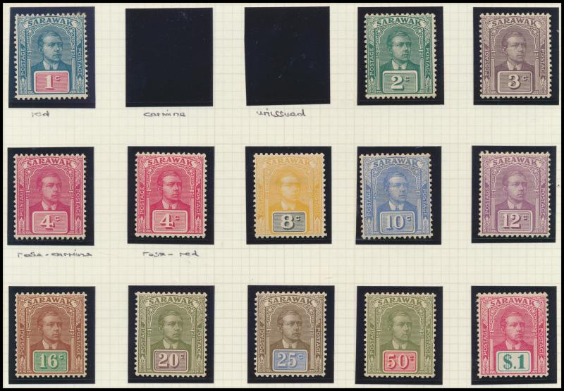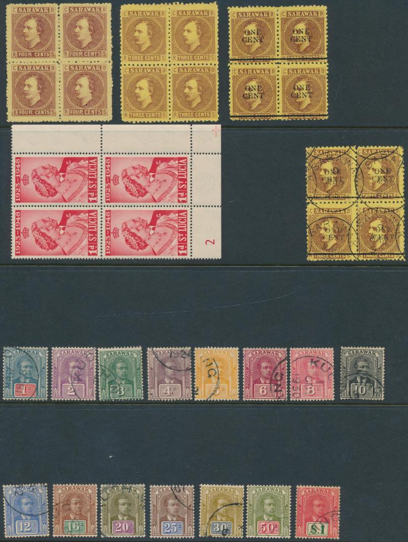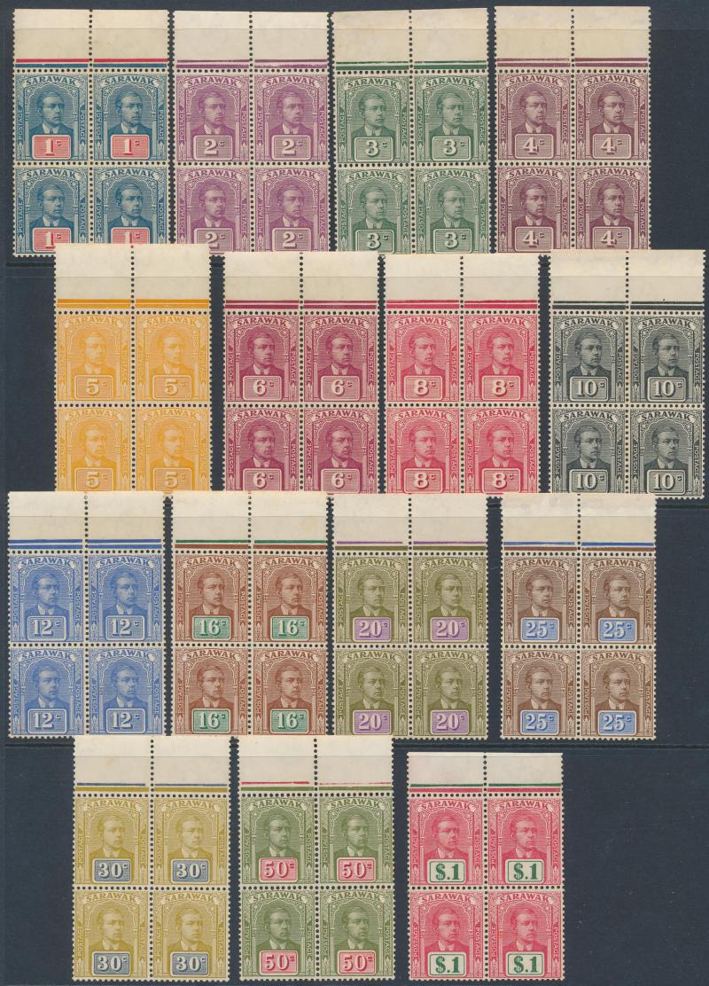 rosine & pale green plus other shades and 2c Rosettes Wmk, 1918 Sir Charles Vyner Brooke & 1922-23 New Colours sets * & used (the 12c blue used only) plus 1c to $1 range ** in marginal blocks of 4 x15 different values (some minor aging marks; the 20c