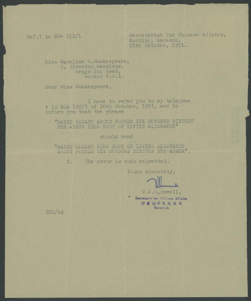 typed message from the "Secretariat of Chinese Affairs" announcing that the cost of living allowance is included in the remuneration for an offered position, not additional as previously advised (no doubt a great disappointment to the applicant),