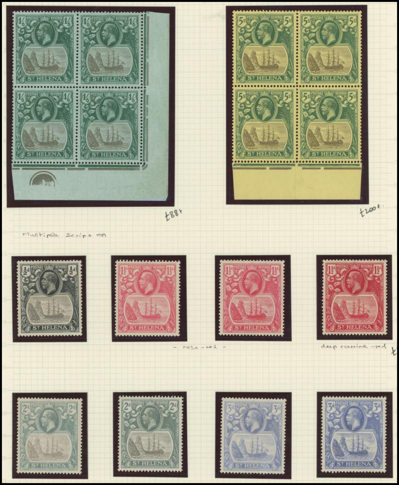KGV Badge Multiple Crown CA Wmk set * plus 1/6d & 5/- blocks of 4 ** (the former with Control Number '1') & Multiple Script CA set to 10/- * with extra shades including 1½d deep carmine-red, used to 1/6d including 1½d deep carmine-red plus 7/6d, and