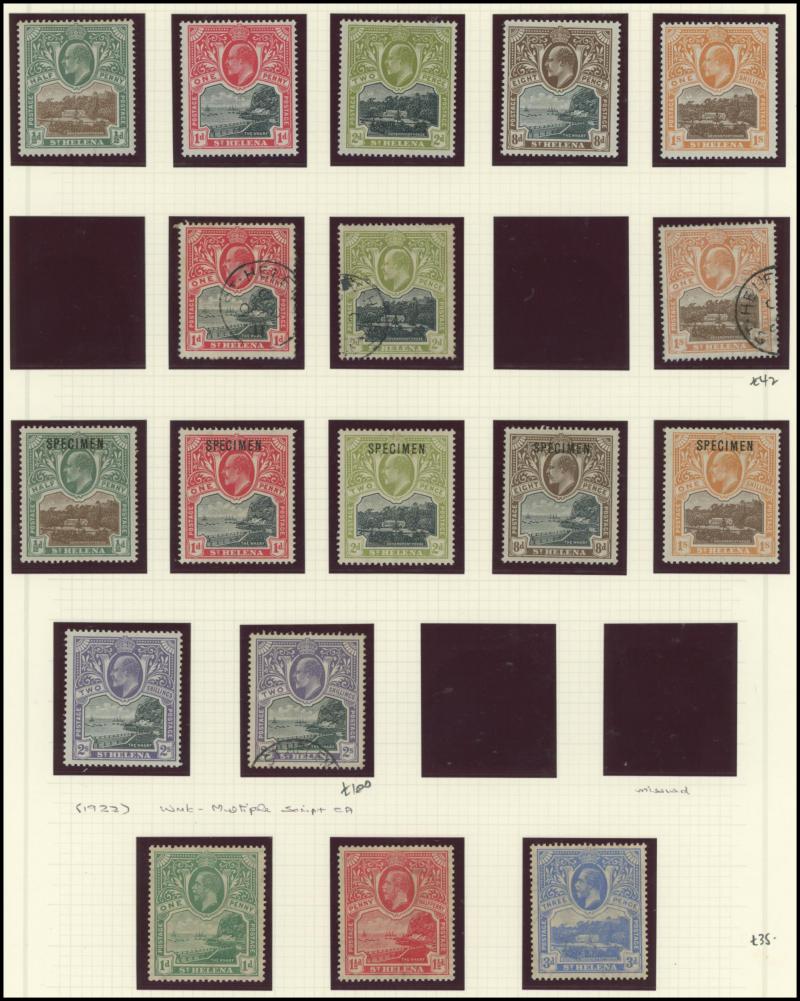 Wmk set * plus extra shades, 5/- block of 4 */** and used range, then 1890-97 QV Keyplates set * plus 10d used, 1902-11 KEVII Keyplates set * plus 1d & 4d blocks of 4 ** and 10/- 'SPECIMEN' overprint, 1903 KEVII Pictorials set * & 'SPECIMEN'