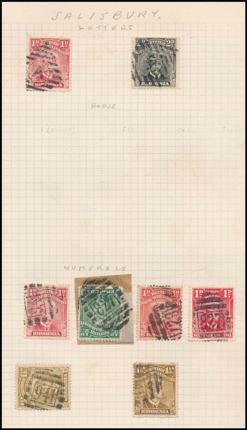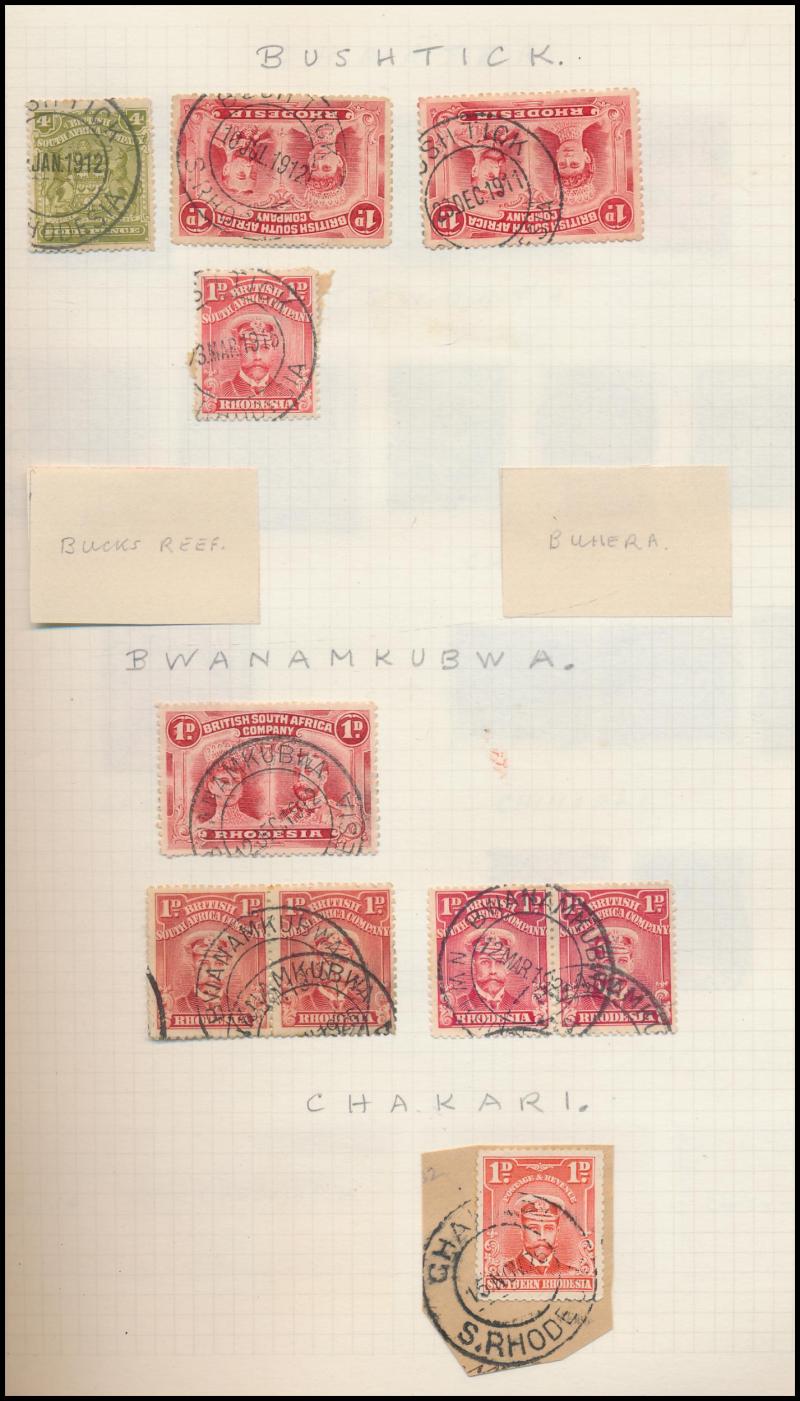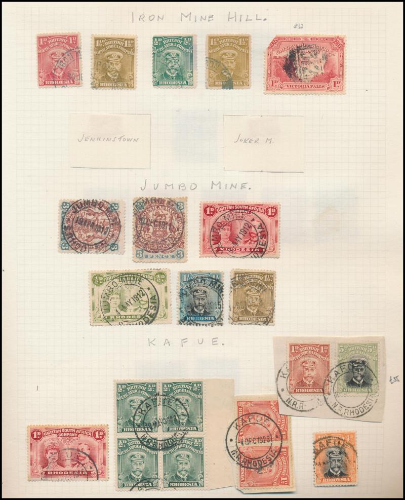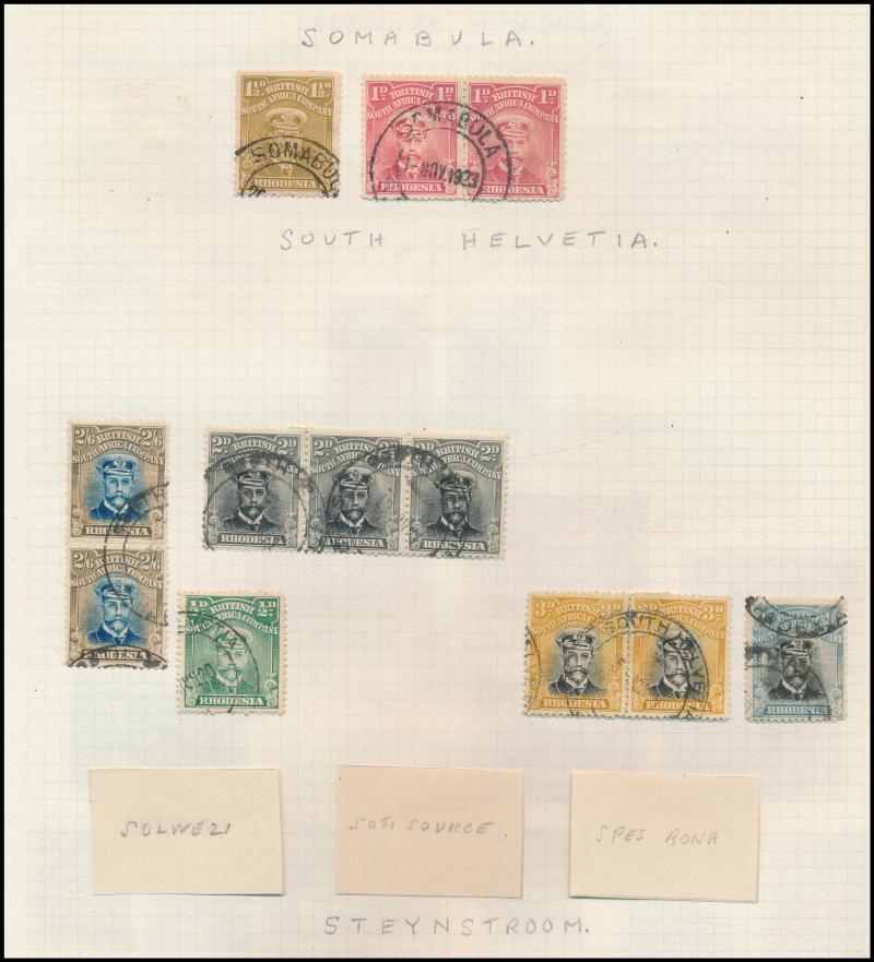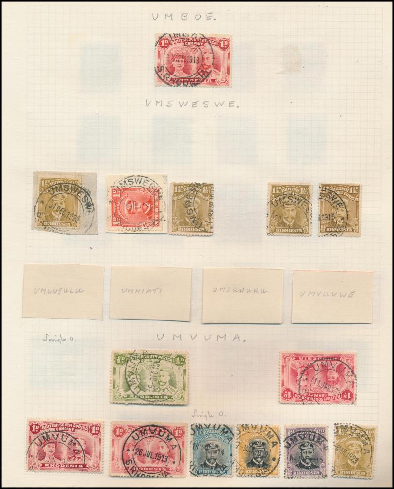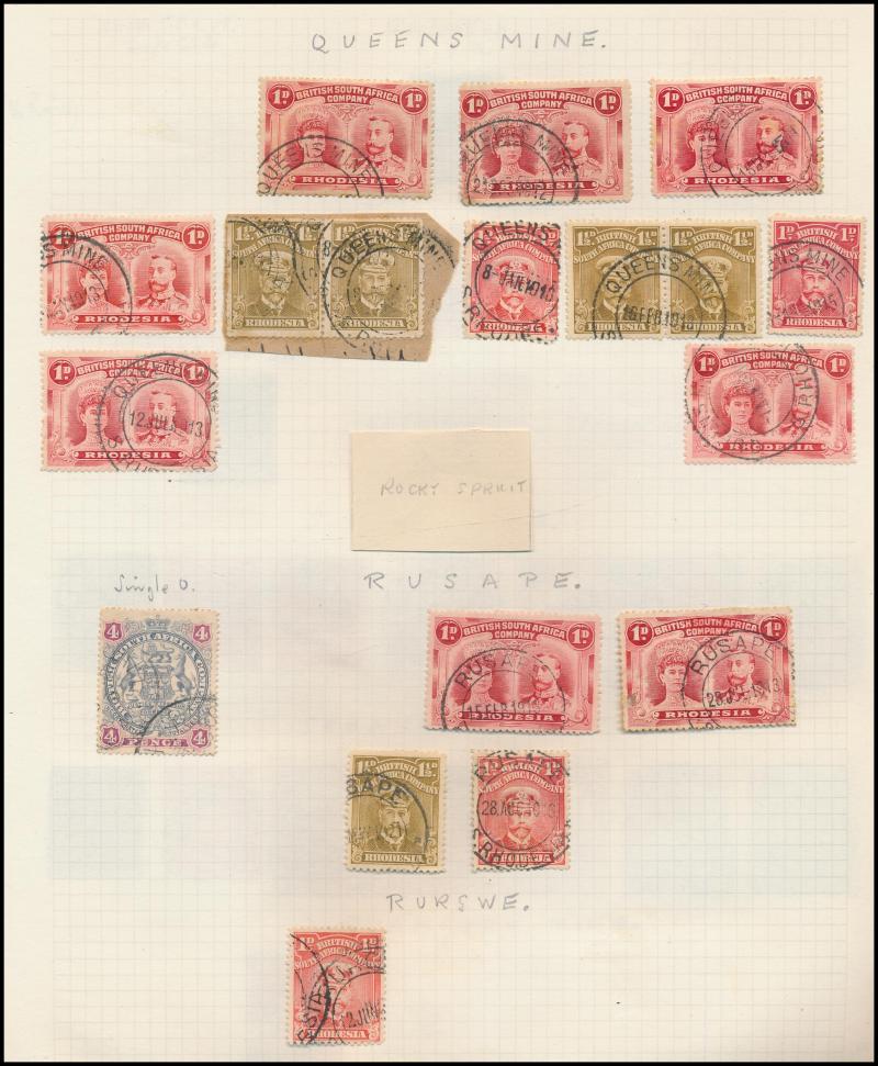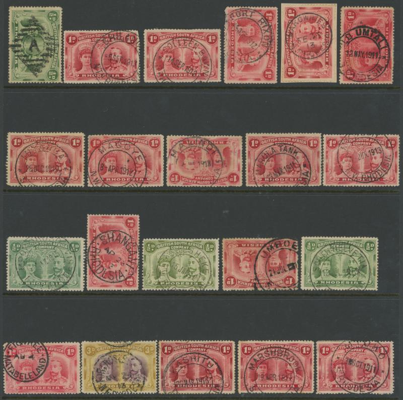 complete on 2½d blue and 'GWANDA' on 1/- green, on Double Heads 'A'-in-diamond of Salisbury on ½d and 'B'-in-bars on Bulawayo on 6d, 'FORT ROSEBERY' single-circle, 'LEALUI', 'MAKWIRO', 'UMBOE', on Admirals 'BEATRICE MINE', 'BROMLEY', 'DAISYFIELD',