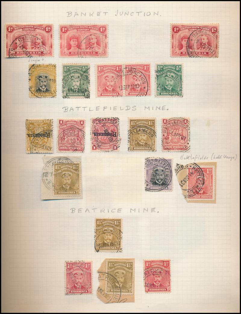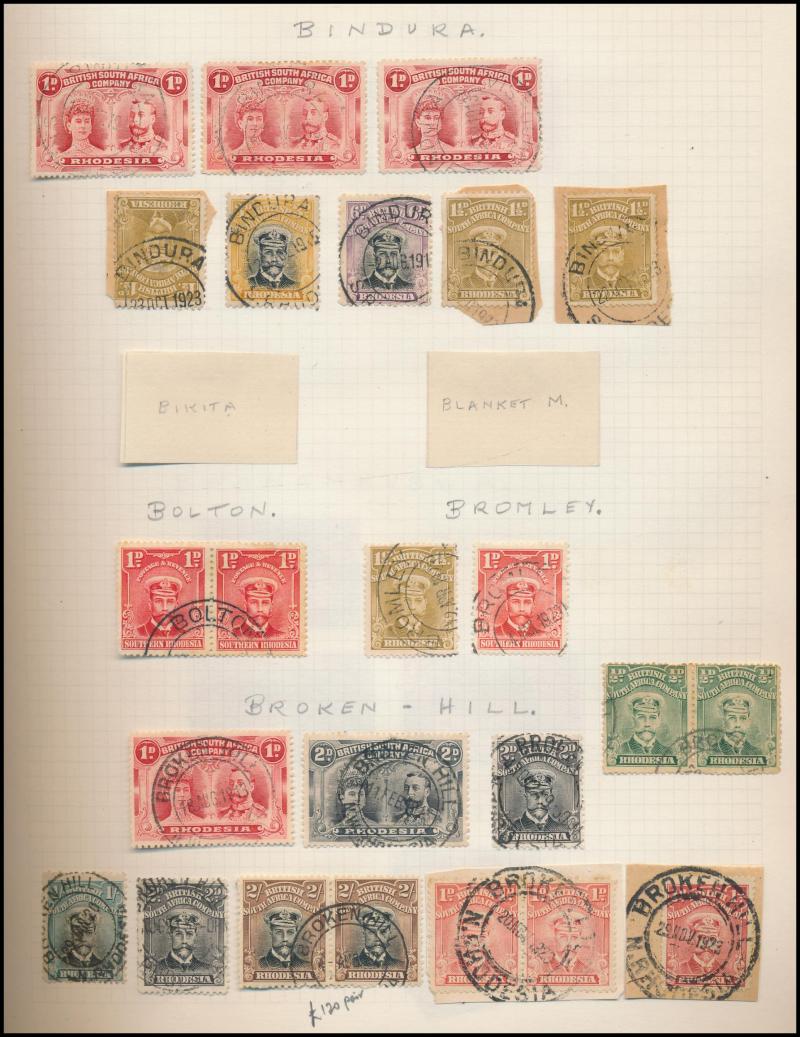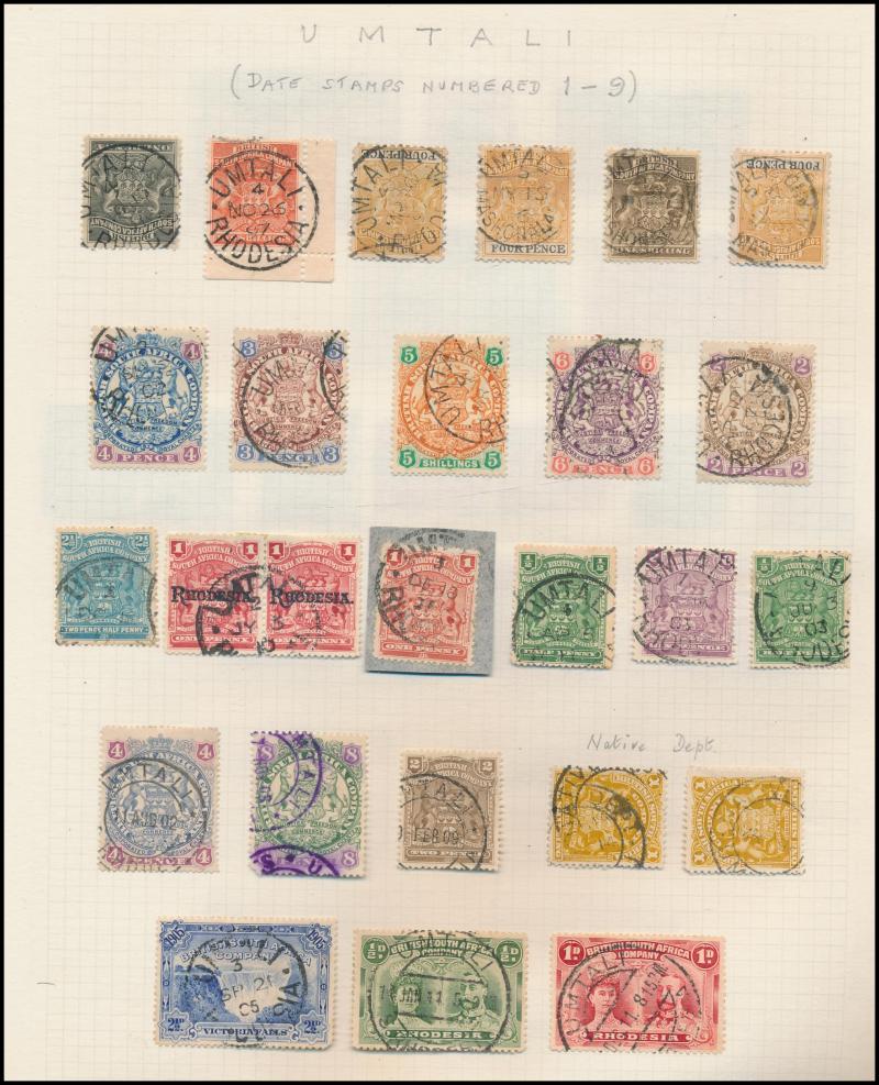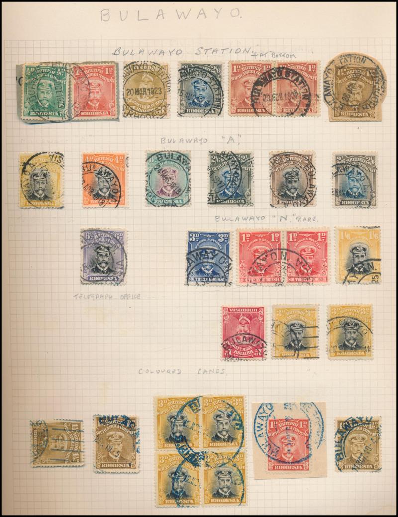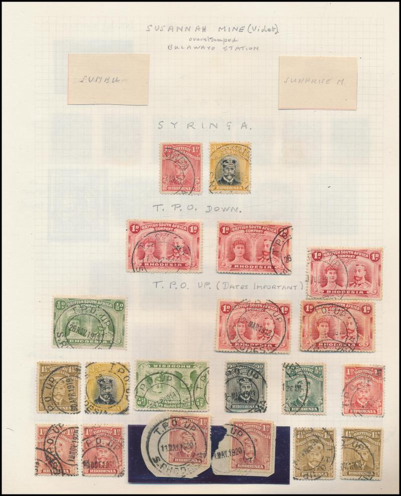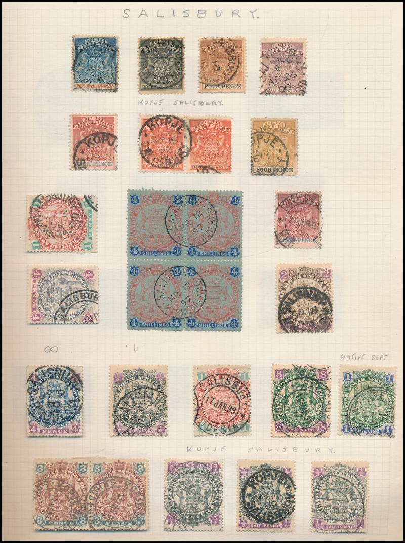 complete on 2½d blue and 'GWANDA' on 1/- green, on Double Heads 'A'-in-diamond of Salisbury on ½d and 'B'-in-bars on Bulawayo on 6d, 'FORT ROSEBERY' single-circle, 'LEALUI', 'MAKWIRO', 'UMBOE', on Admirals 'BEATRICE MINE', 'BROMLEY', 'DAISYFIELD',