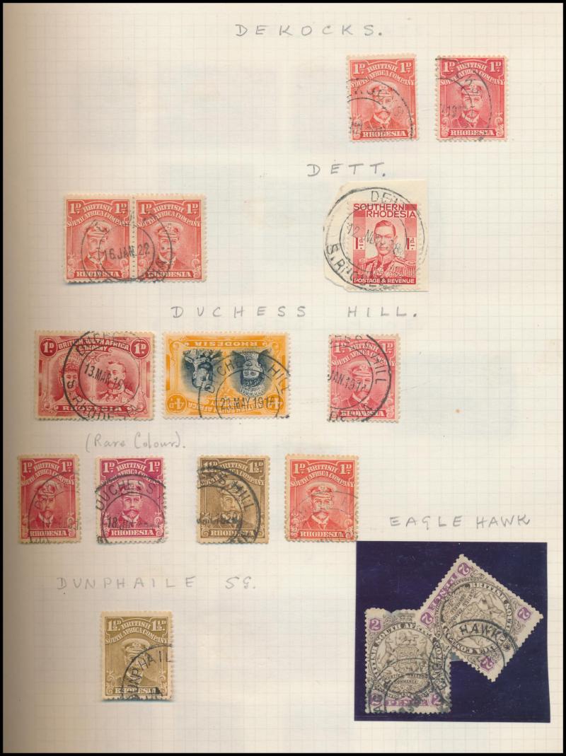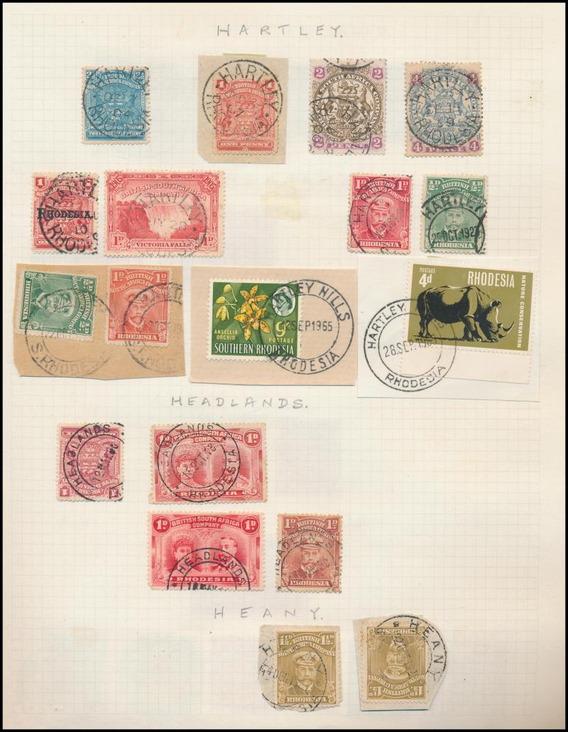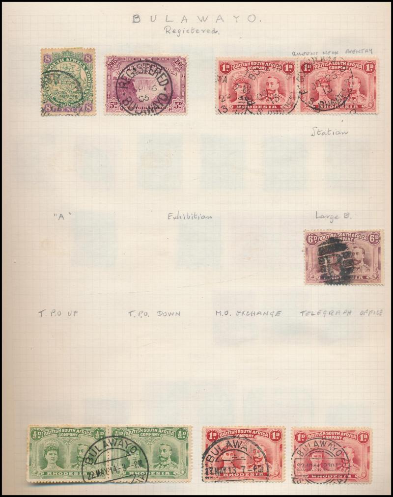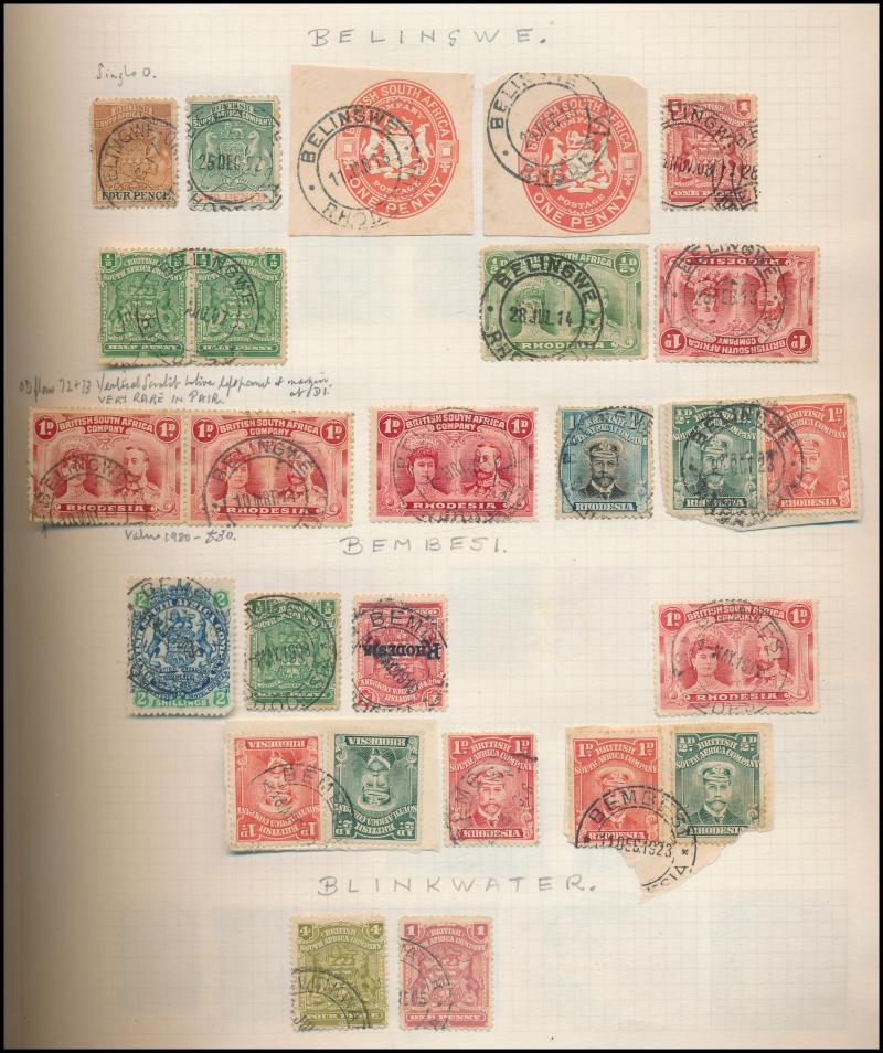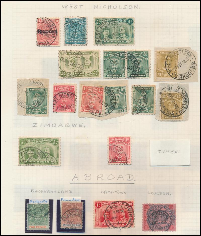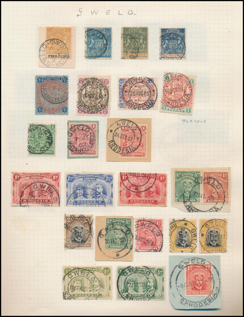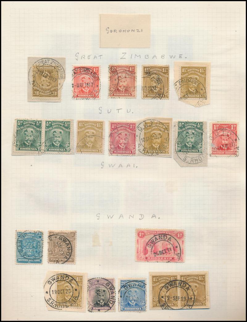 complete on 2½d blue and 'GWANDA' on 1/- green, on Double Heads 'A'-in-diamond of Salisbury on ½d and 'B'-in-bars on Bulawayo on 6d, 'FORT ROSEBERY' single-circle, 'LEALUI', 'MAKWIRO', 'UMBOE', on Admirals 'BEATRICE MINE', 'BROMLEY', 'DAISYFIELD',