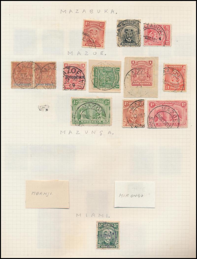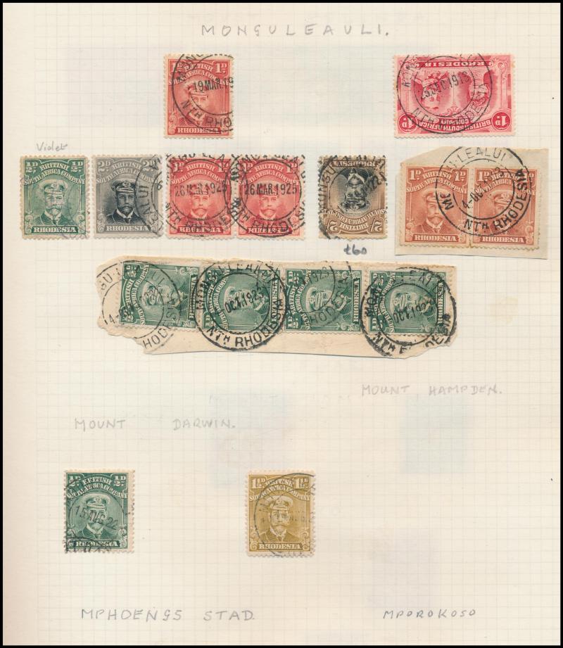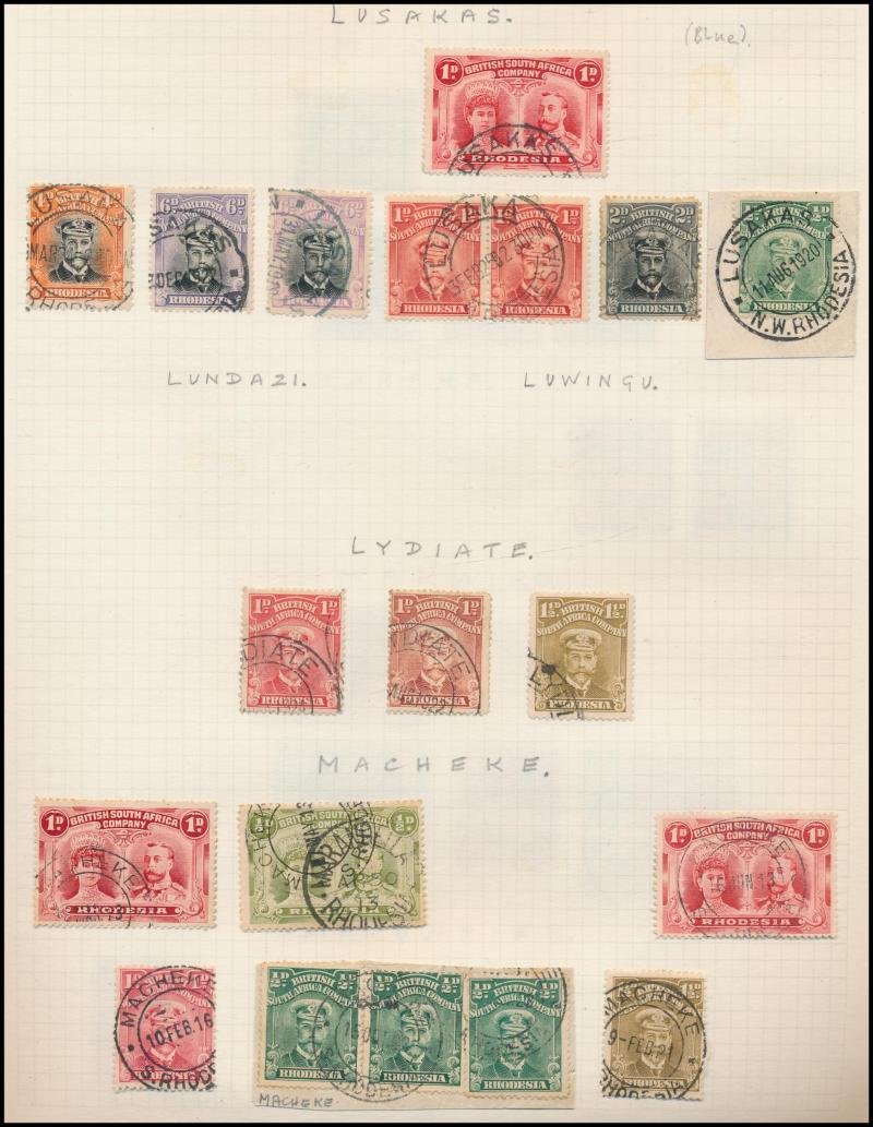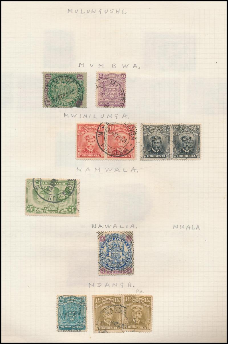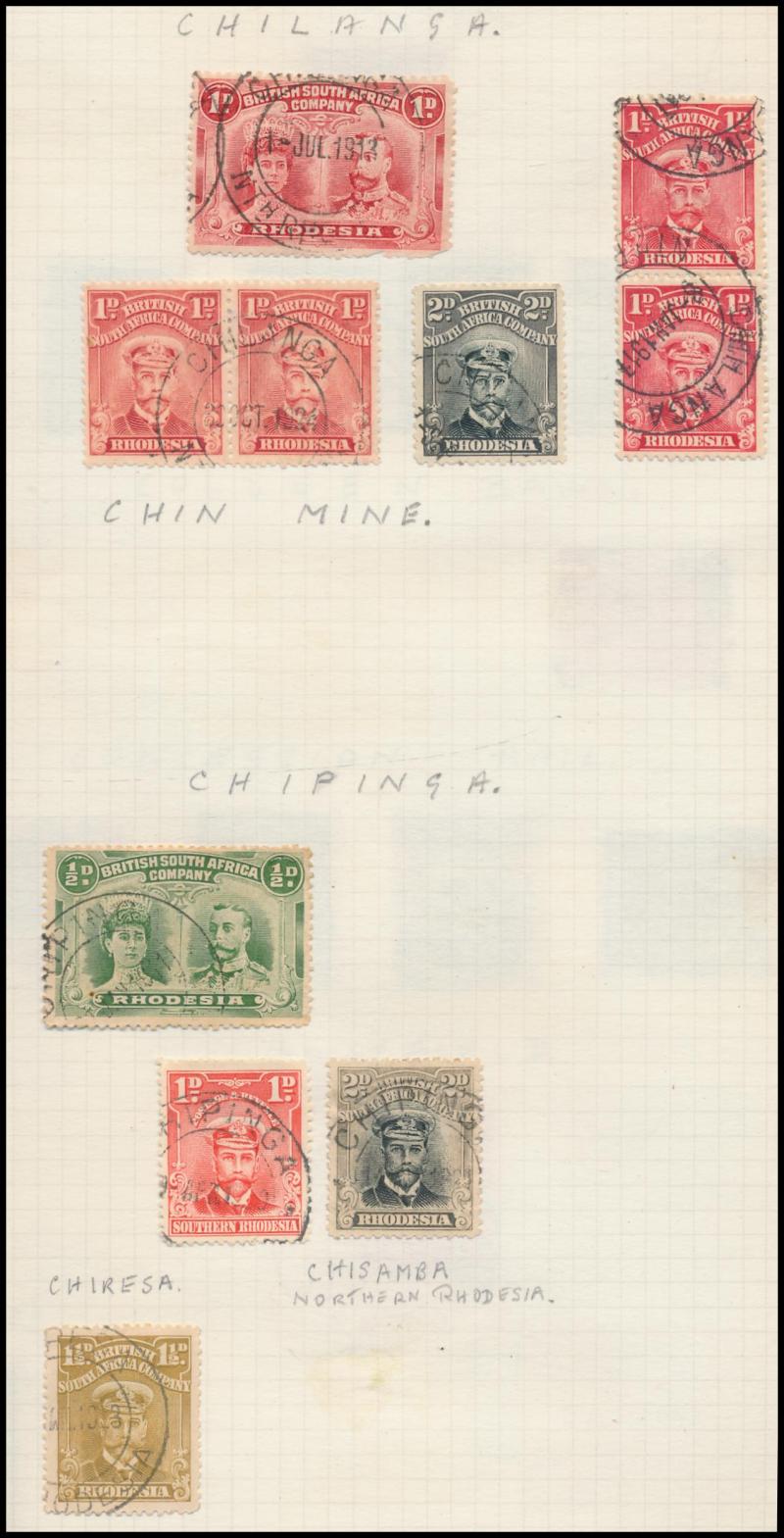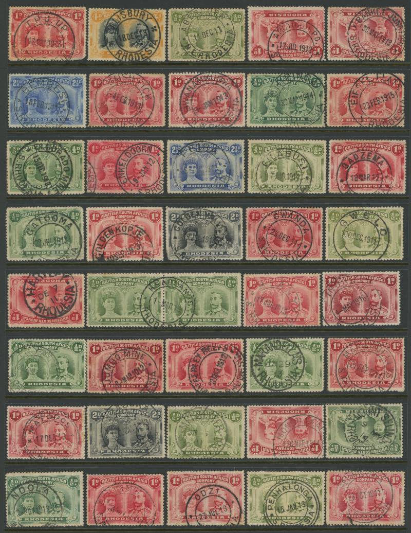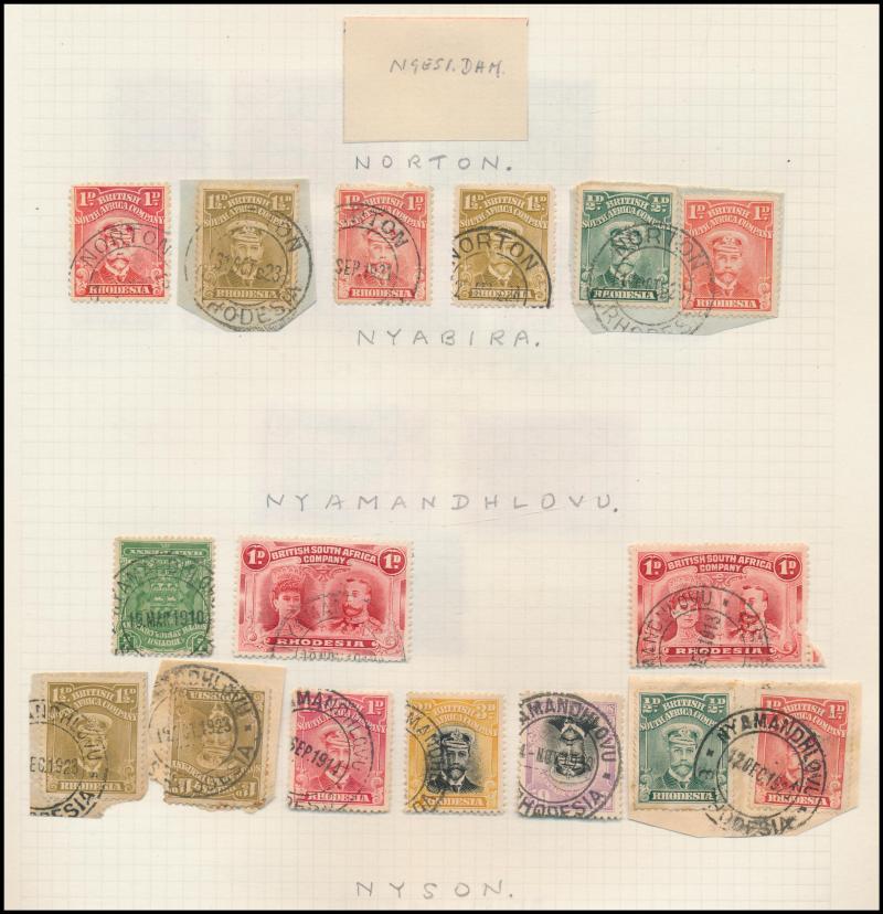 'FILABUSI' in blue, 'GATOOMA' complete on-piece, 'GOLDEN KOPJE', 'GWAAI', 'INYAZURA', 'KALEYA', 'LUNDAZI', 'MAKOWRIES', 'MKUSHI', 'MONZE', 'MOUNT DARWIN', 'MUMBWA', 'NAMWALA' on 6d black & lilac, 'NELLY MINE', 'SALISBURY N' on 1/- black & blue (used