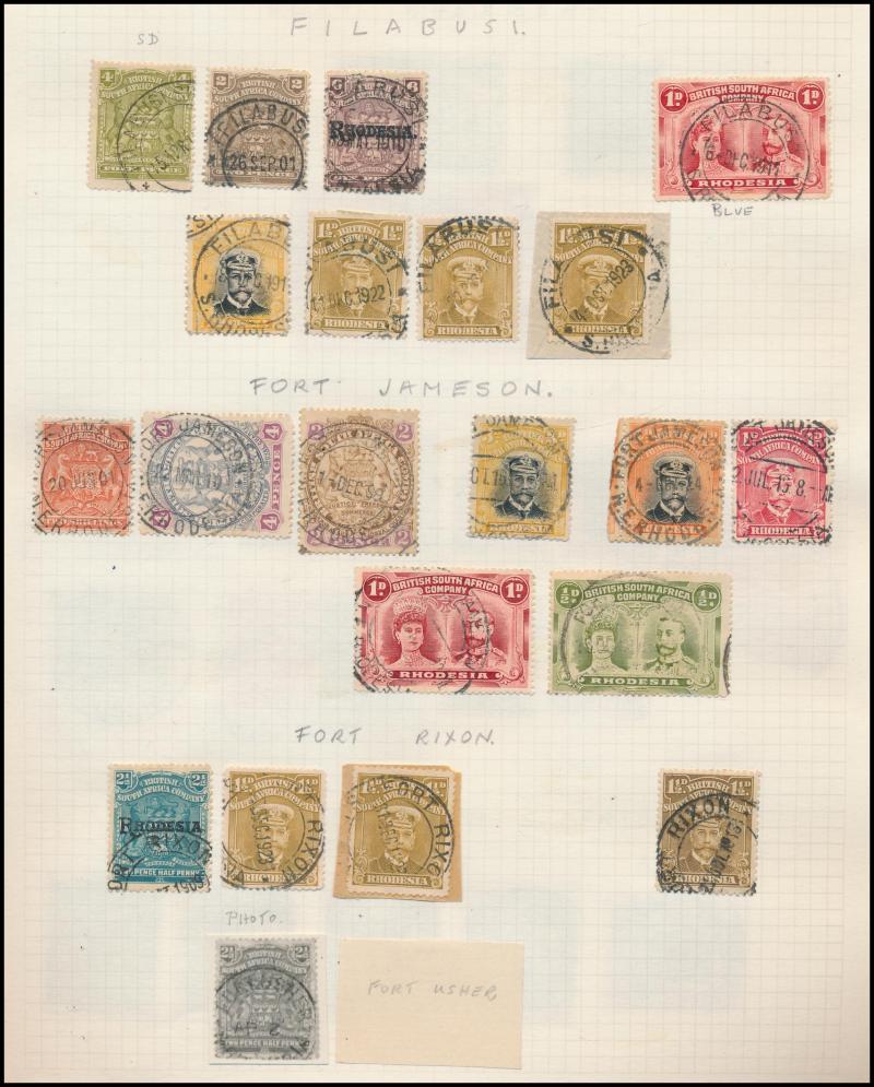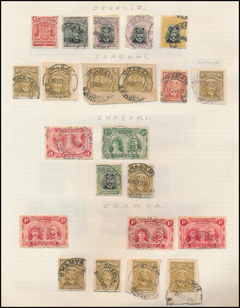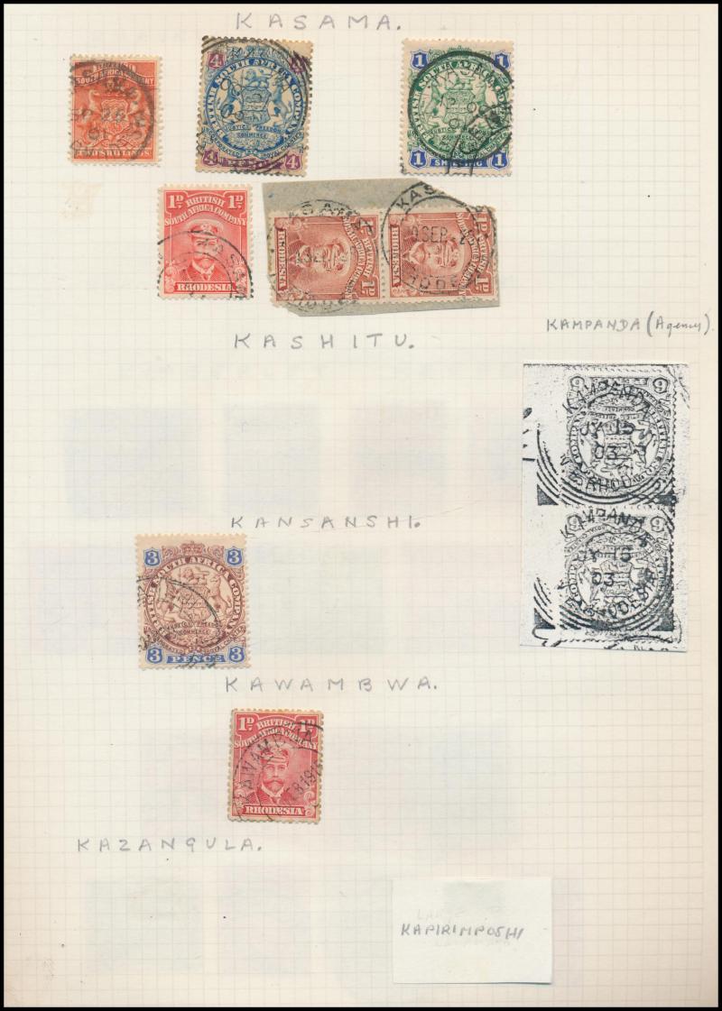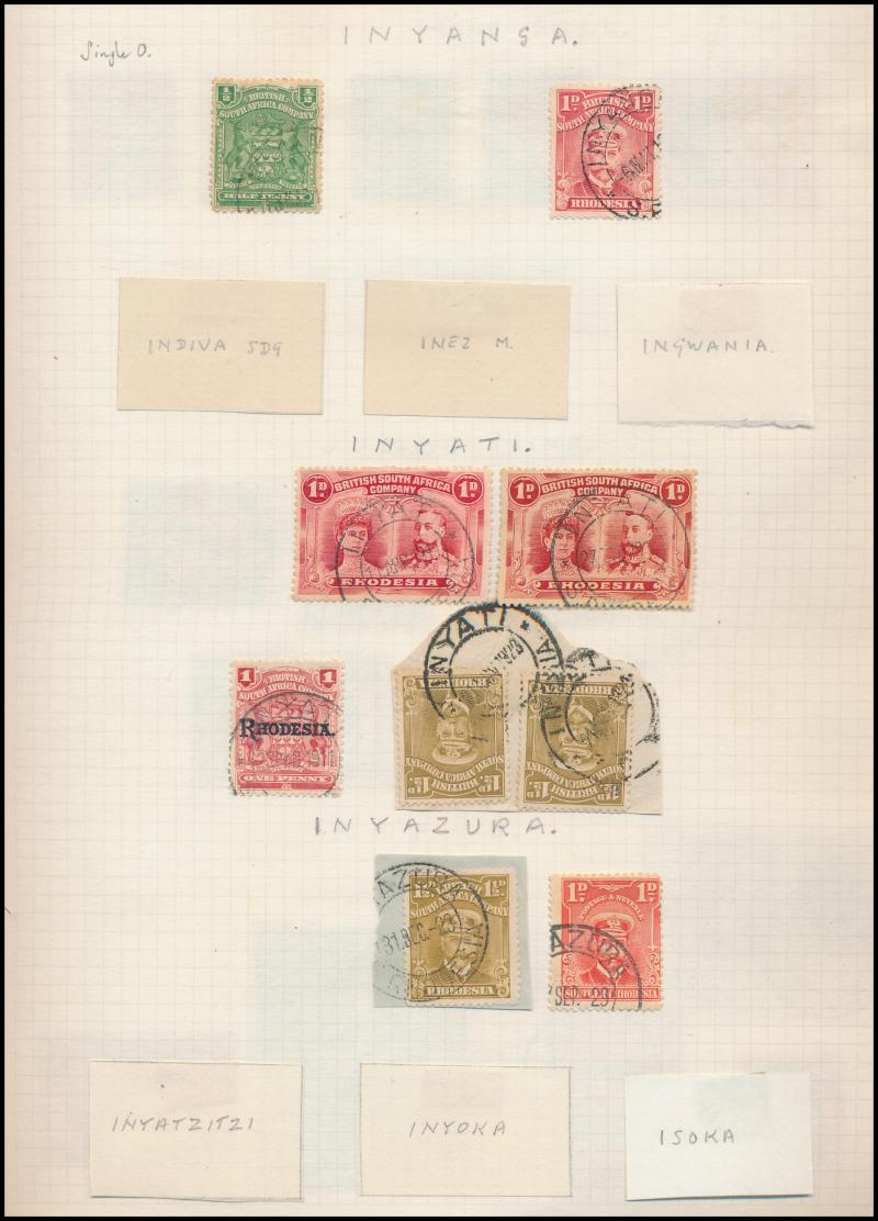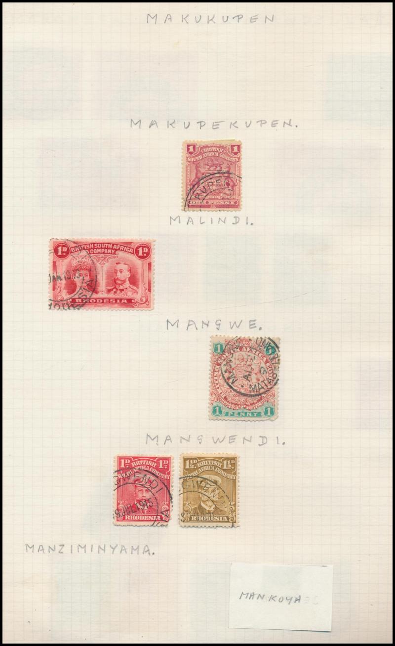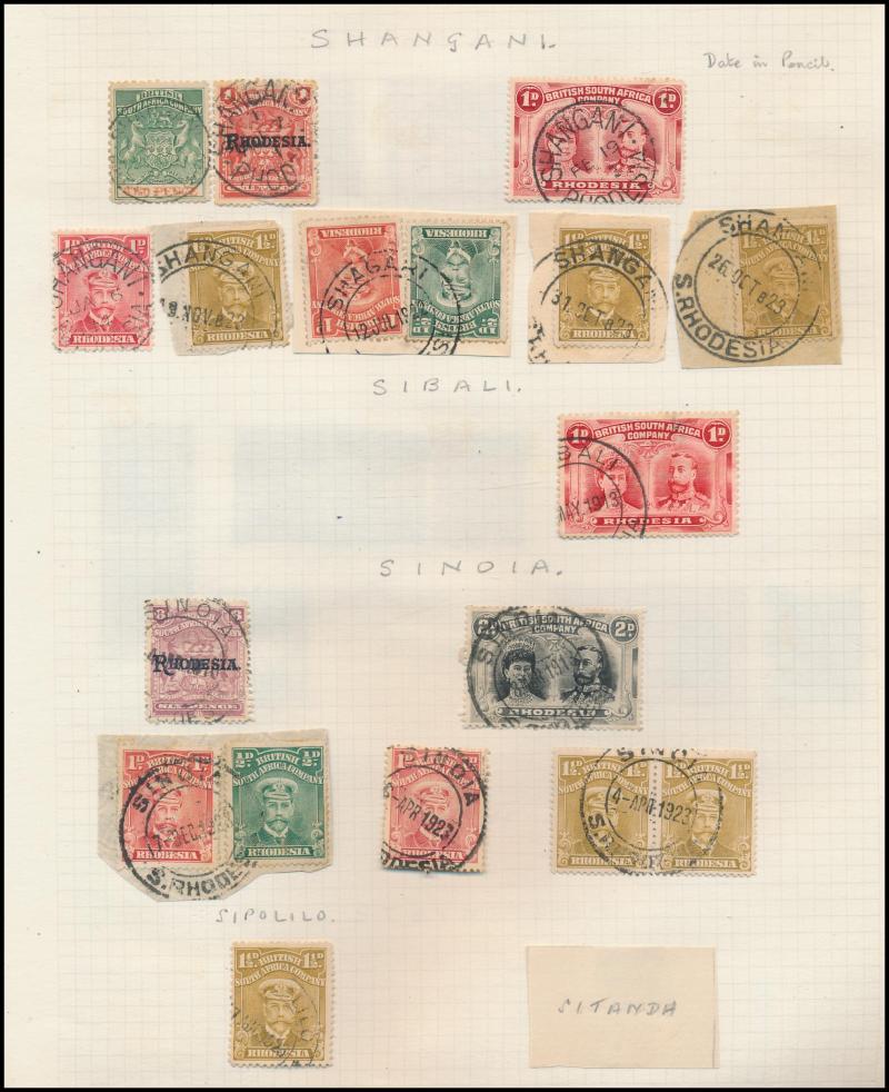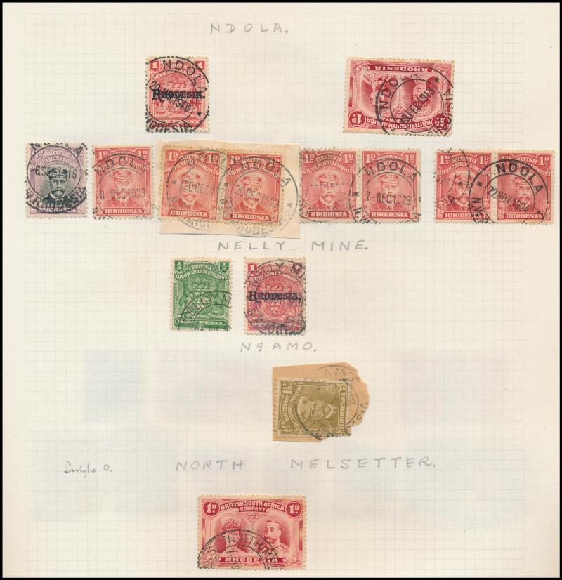 'FILABUSI' in blue, 'GATOOMA' complete on-piece, 'GOLDEN KOPJE', 'GWAAI', 'INYAZURA', 'KALEYA', 'LUNDAZI', 'MAKOWRIES', 'MKUSHI', 'MONZE', 'MOUNT DARWIN', 'MUMBWA', 'NAMWALA' on 6d black & lilac, 'NELLY MINE', 'SALISBURY N' on 1/- black & blue (used