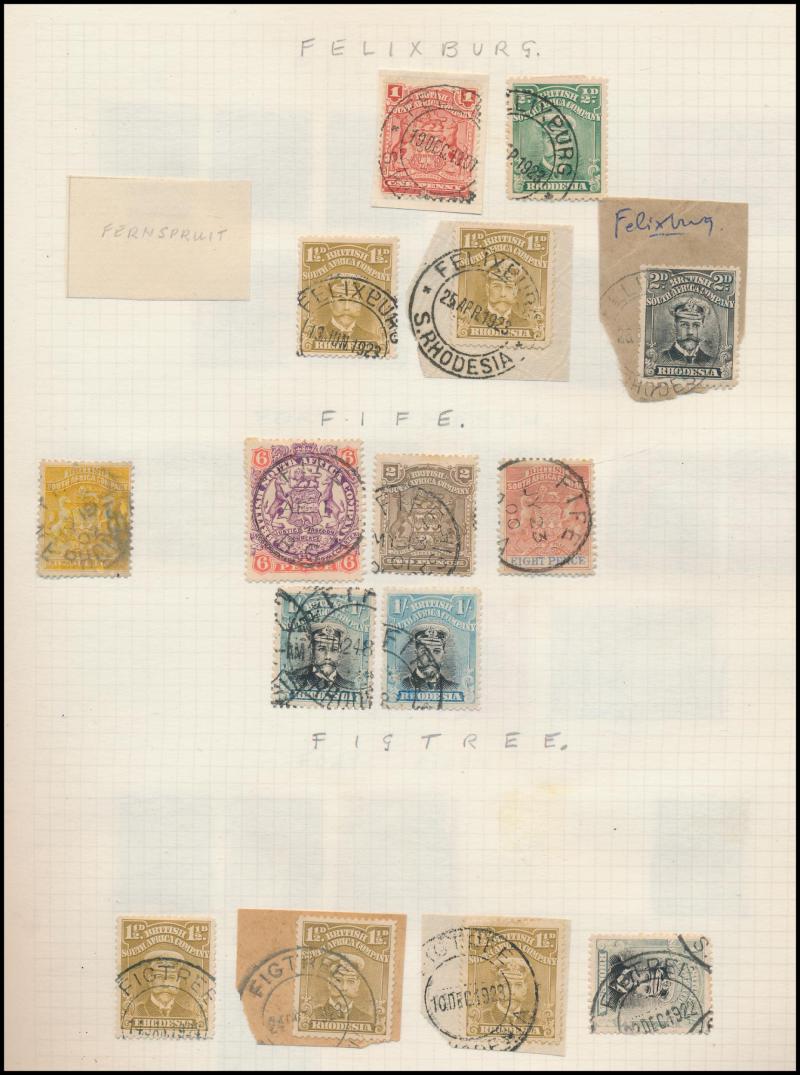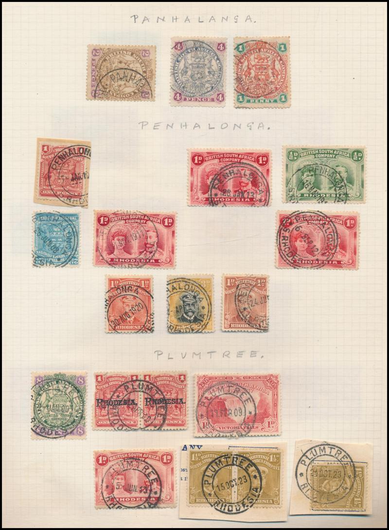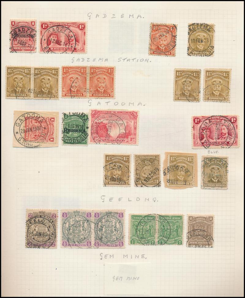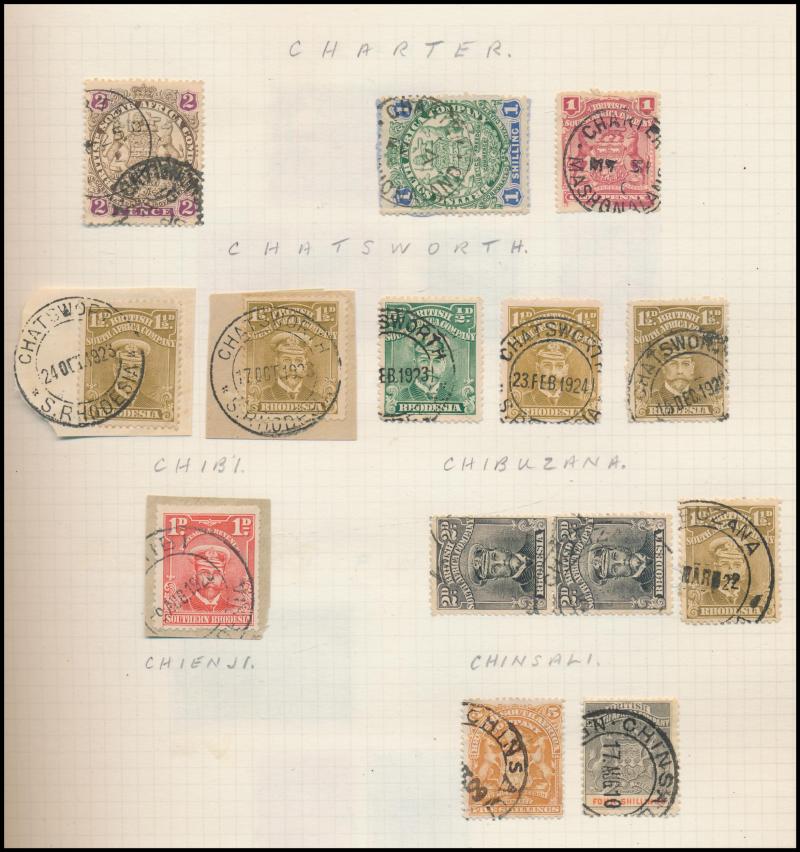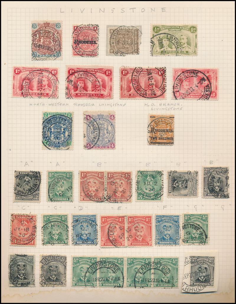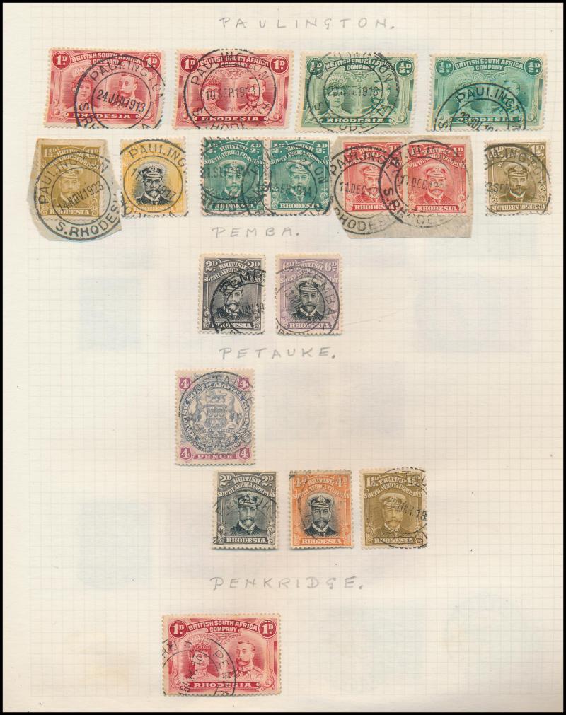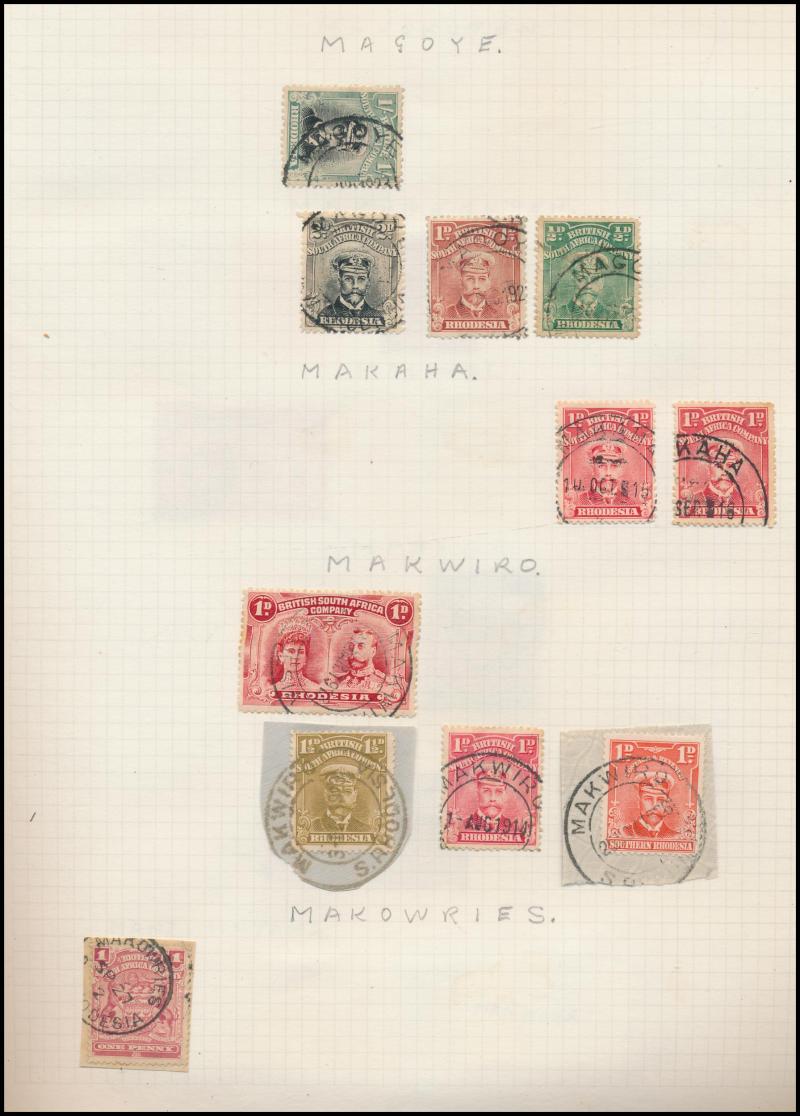 'FILABUSI' in blue, 'GATOOMA' complete on-piece, 'GOLDEN KOPJE', 'GWAAI', 'INYAZURA', 'KALEYA', 'LUNDAZI', 'MAKOWRIES', 'MKUSHI', 'MONZE', 'MOUNT DARWIN', 'MUMBWA', 'NAMWALA' on 6d black & lilac, 'NELLY MINE', 'SALISBURY N' on 1/- black & blue (used