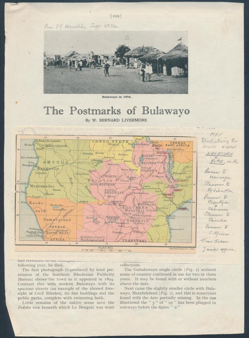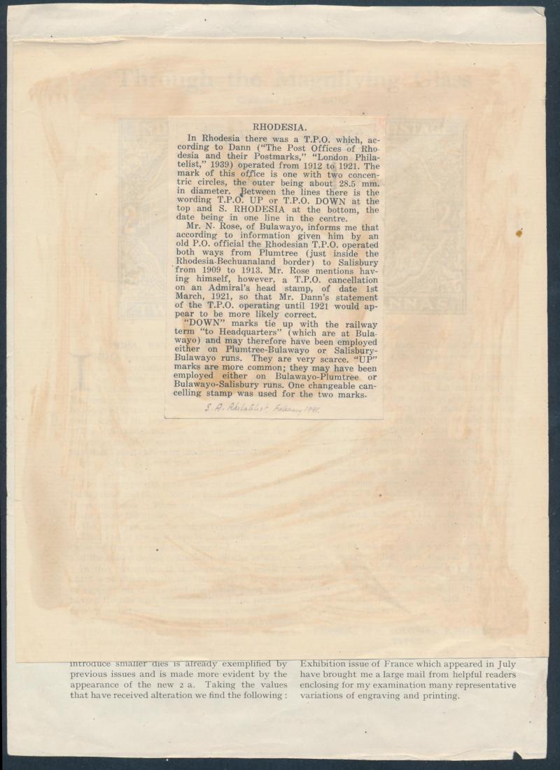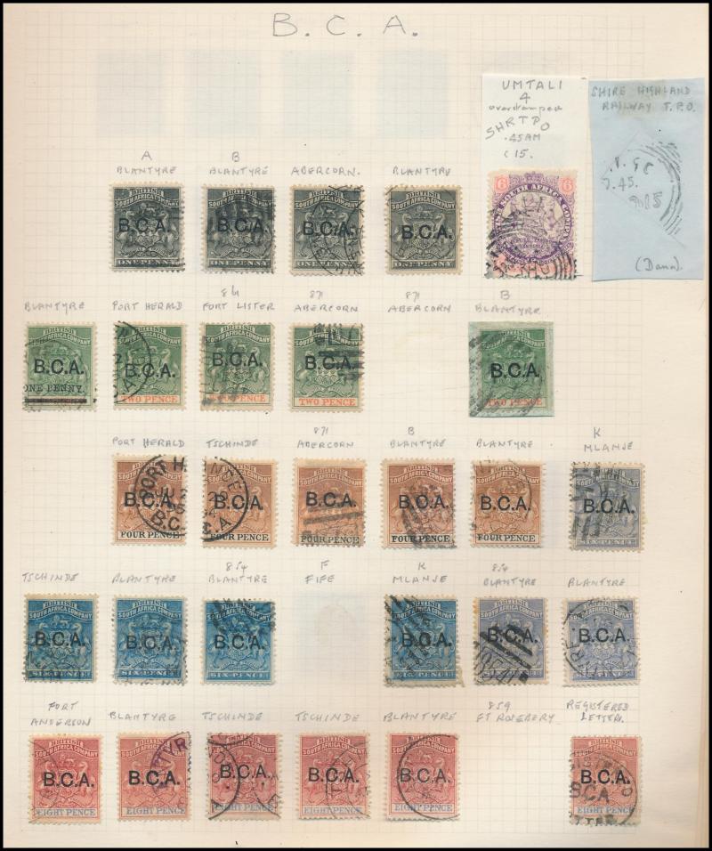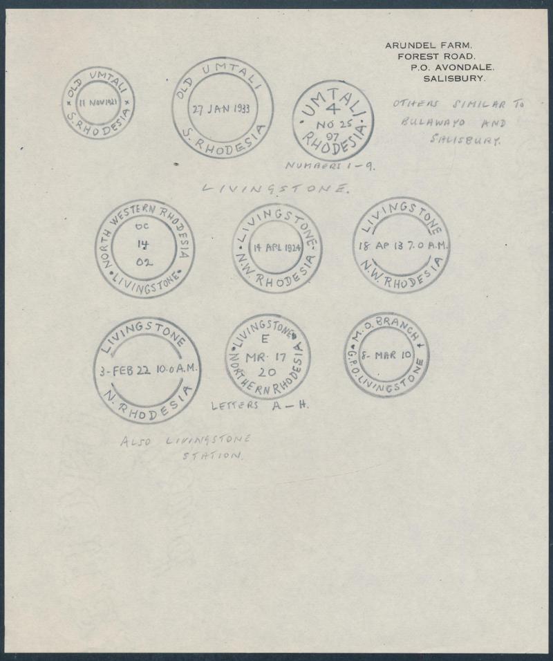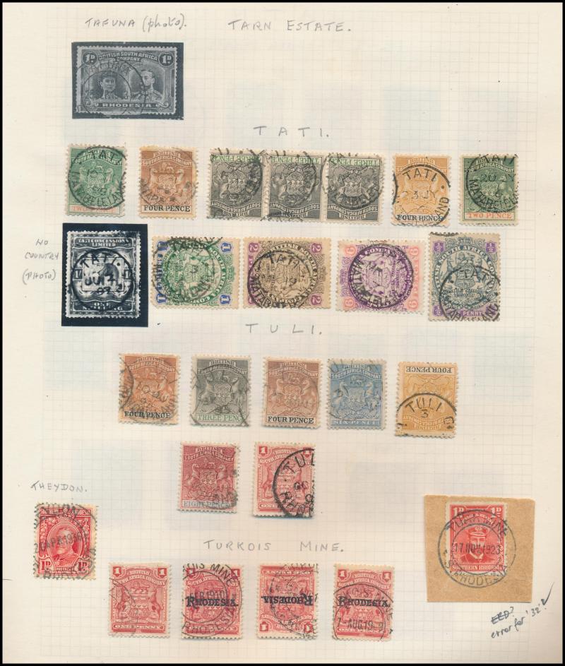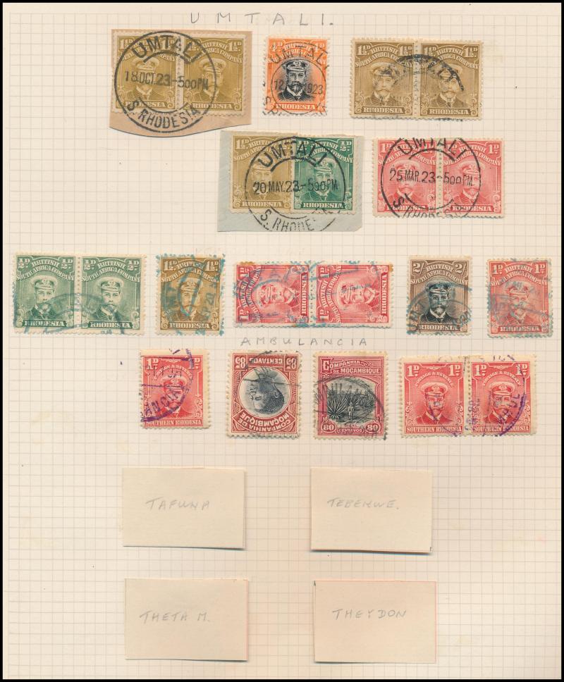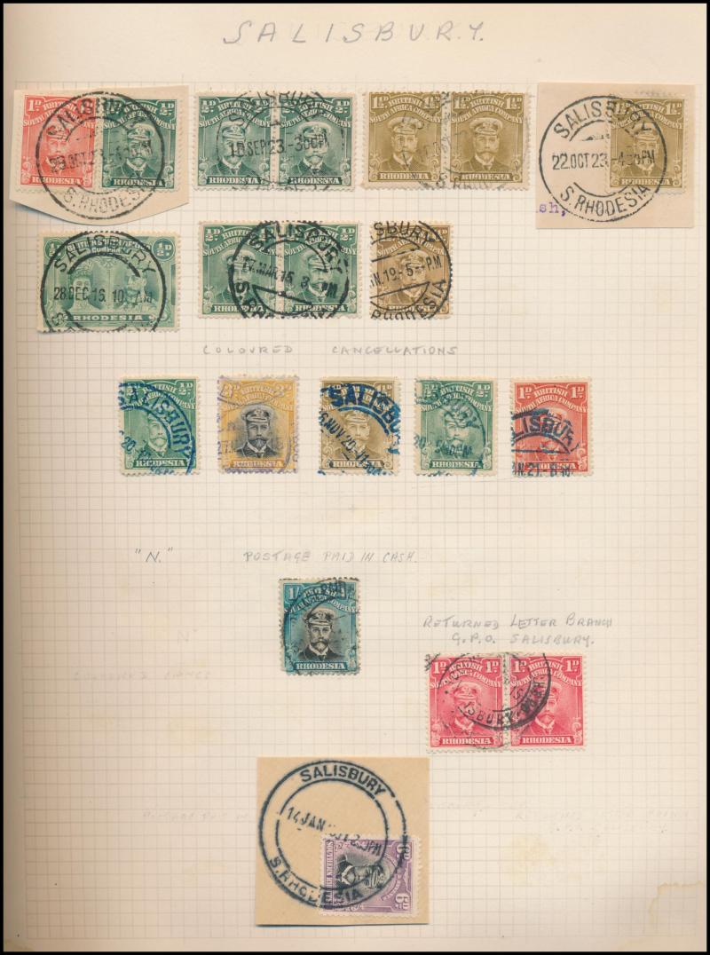 'FILABUSI' in blue, 'GATOOMA' complete on-piece, 'GOLDEN KOPJE', 'GWAAI', 'INYAZURA', 'KALEYA', 'LUNDAZI', 'MAKOWRIES', 'MKUSHI', 'MONZE', 'MOUNT DARWIN', 'MUMBWA', 'NAMWALA' on 6d black & lilac, 'NELLY MINE', 'SALISBURY N' on 1/- black & blue (used