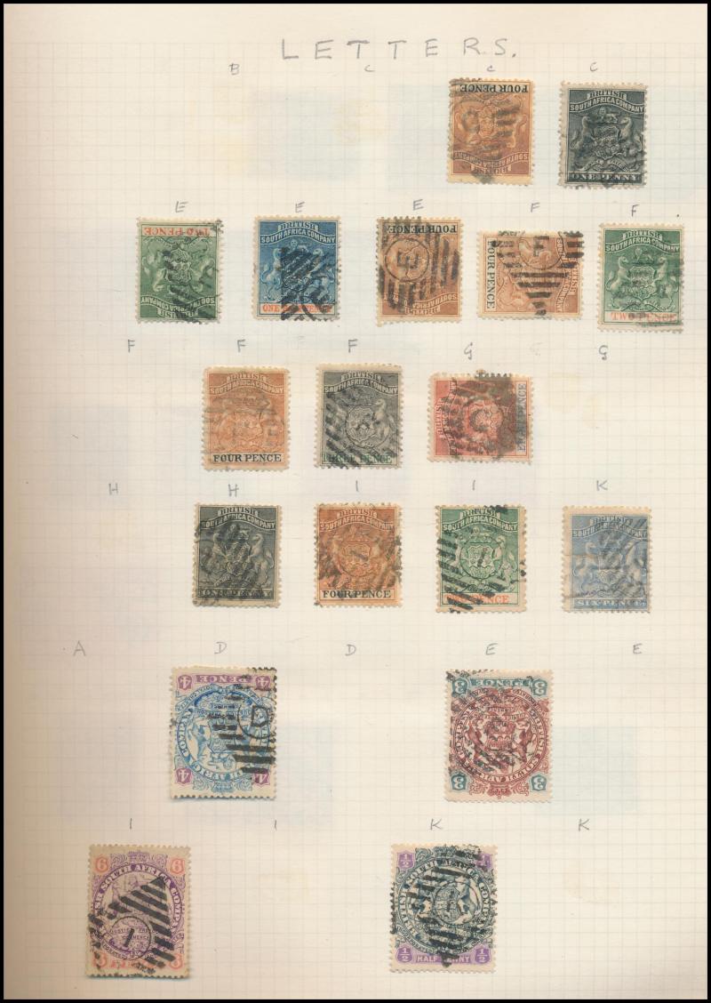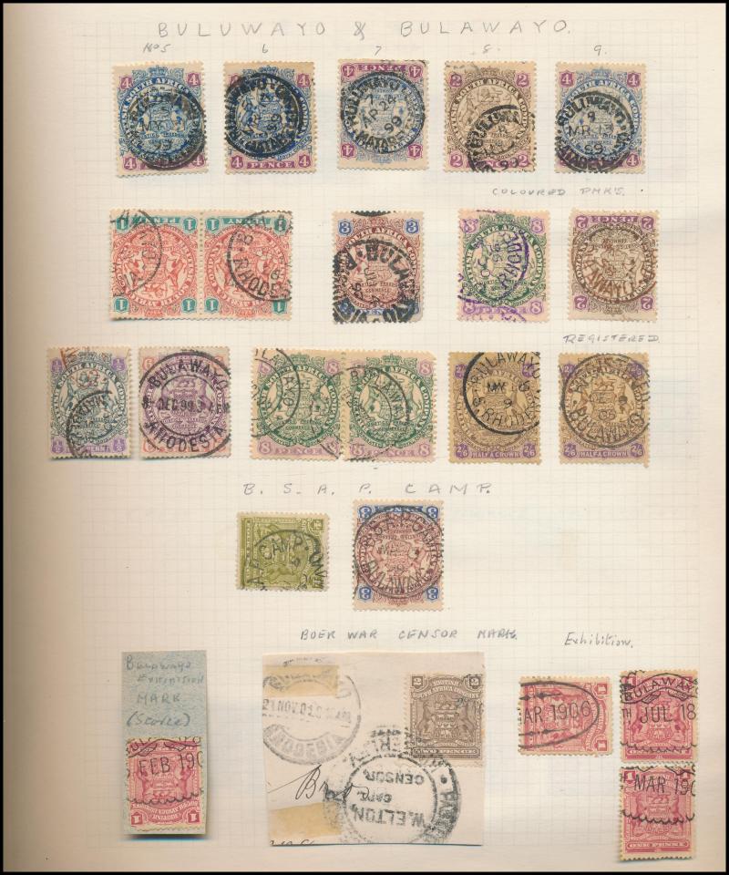 and 'BULAWAYO/MATABELELAND' & '.../RHODESIA' cds including on Arms 5/- orange single & pair (Cat £195+) and on 1898 cover to Germany, 'B.S.A.P CAMP' on Large Arms 3d and Waterworks fancy scroll fiscal on Small Arms 1d, a range of numeral, letter &