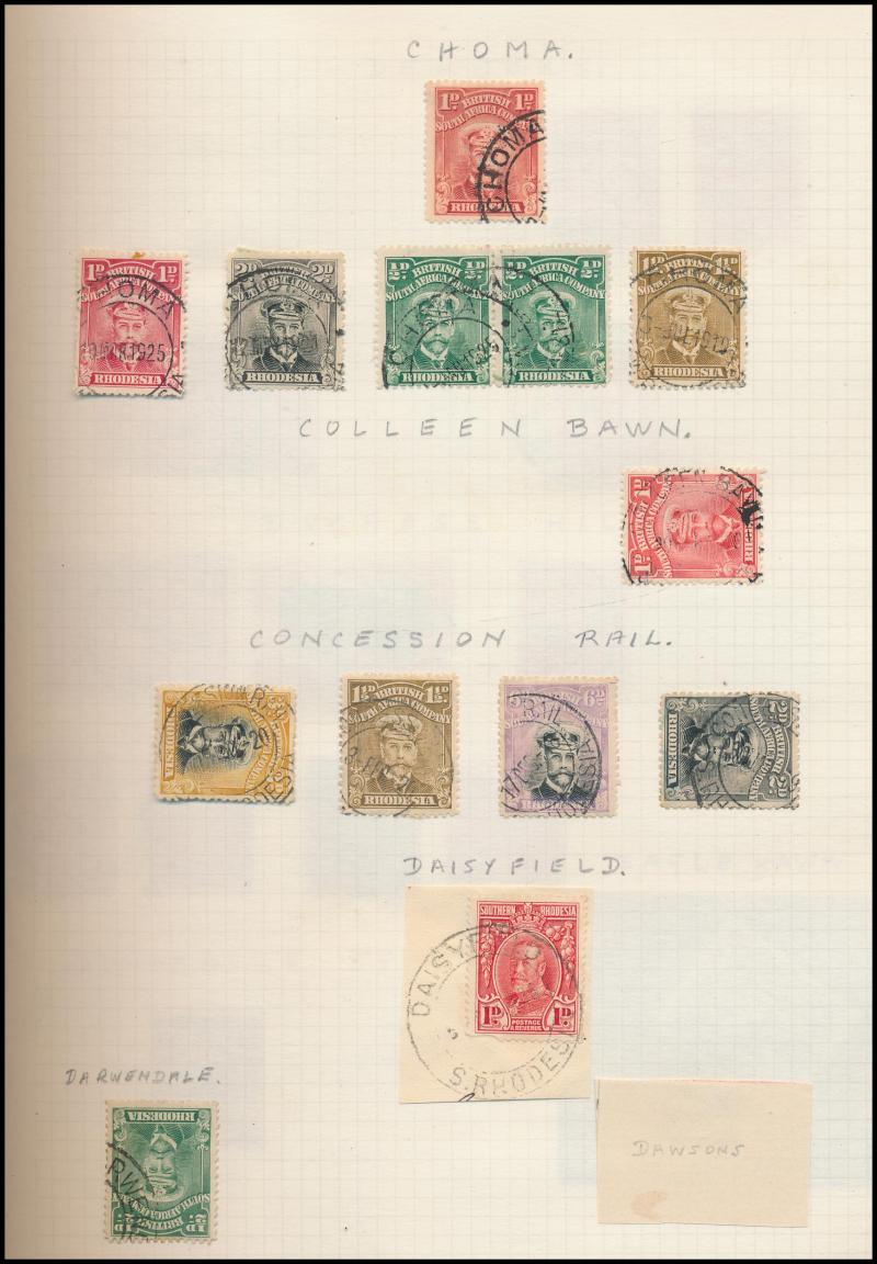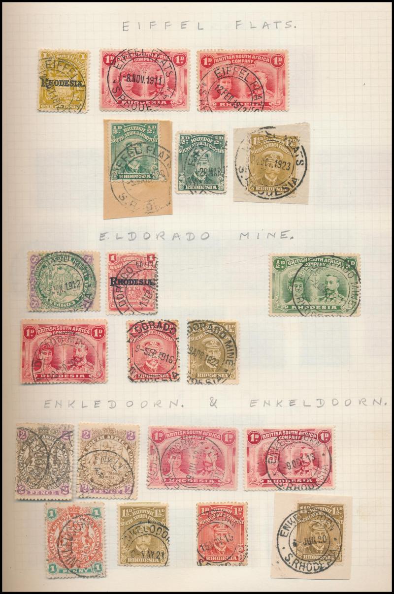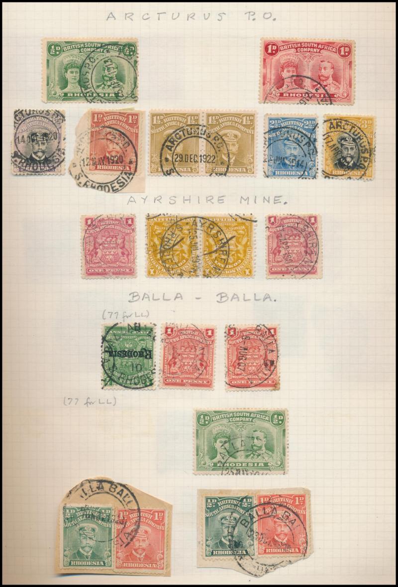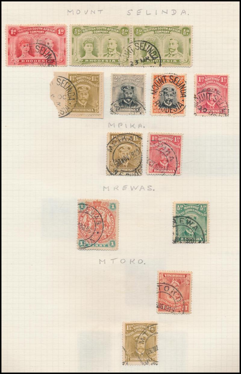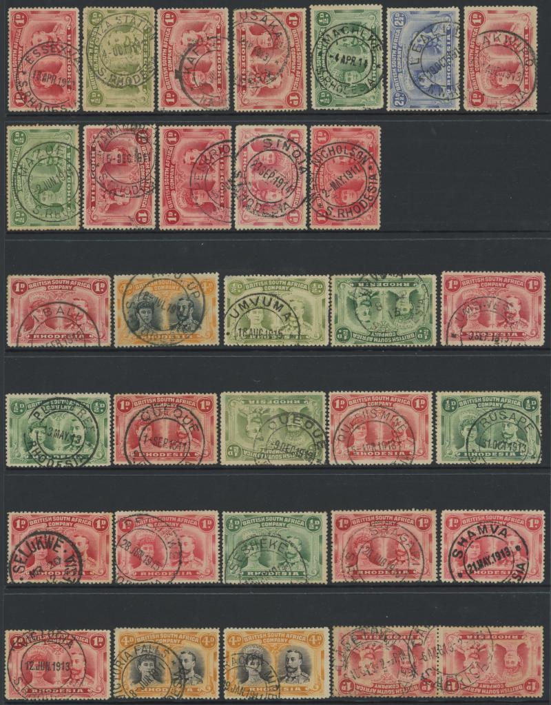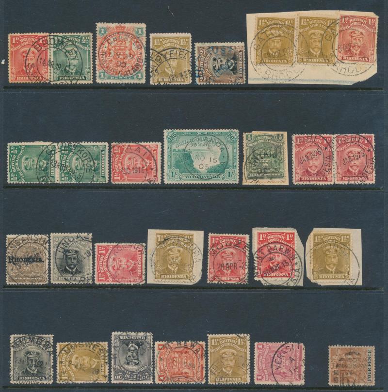 parcels cancels, then 'AYRESHIRE MINE', 'CHARTER', 'INYANGA', 'KANSANSHI' on 'RHODESIA' overprint 2d brown, 'KASEMPA' on 10/- grey-green, 'M'REWAS', 'NAWALIA' Squared-Circle, 'ORTONS DRIFT' on ½d pair, 'VERACITY', on Victoria Falls 'BELINGWE' superb