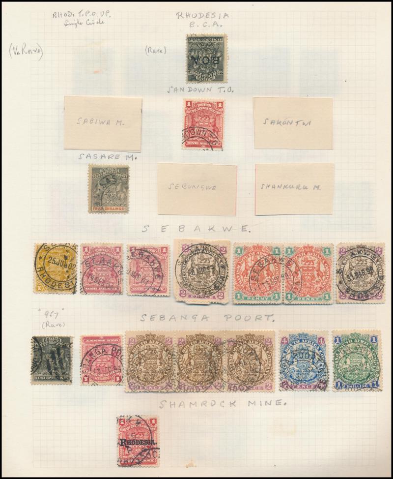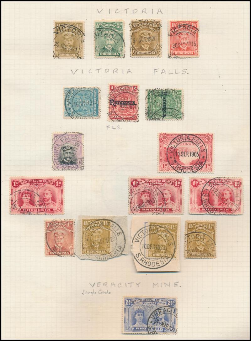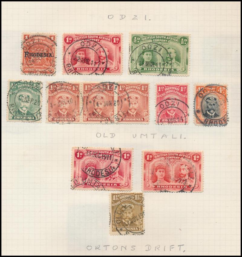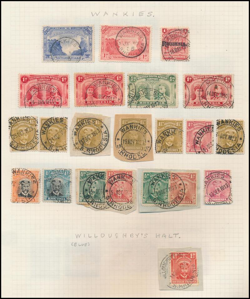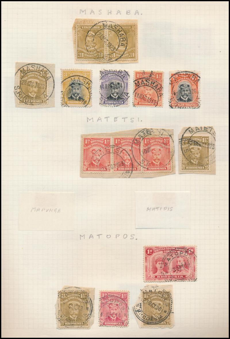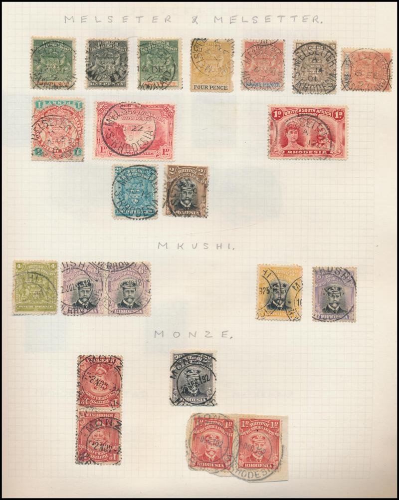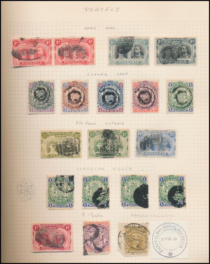 parcels cancels, then 'AYRESHIRE MINE', 'CHARTER', 'INYANGA', 'KANSANSHI' on 'RHODESIA' overprint 2d brown, 'KASEMPA' on 10/- grey-green, 'M'REWAS', 'NAWALIA' Squared-Circle, 'ORTONS DRIFT' on ½d pair, 'VERACITY', on Victoria Falls 'BELINGWE' superb