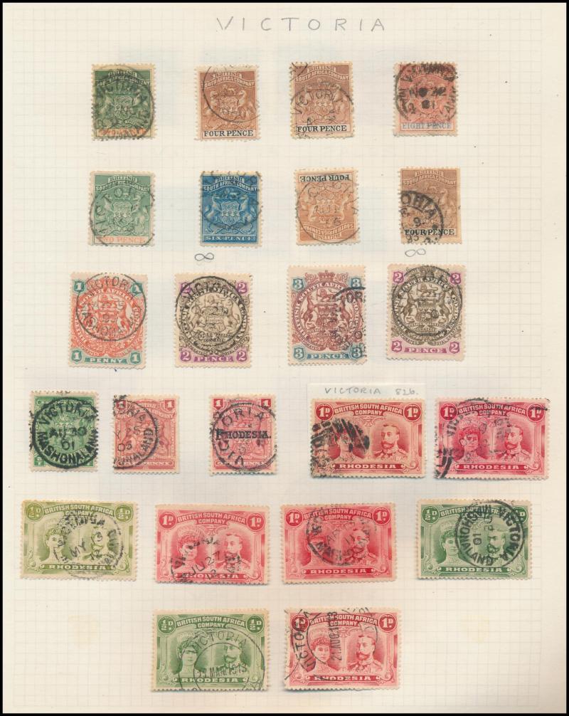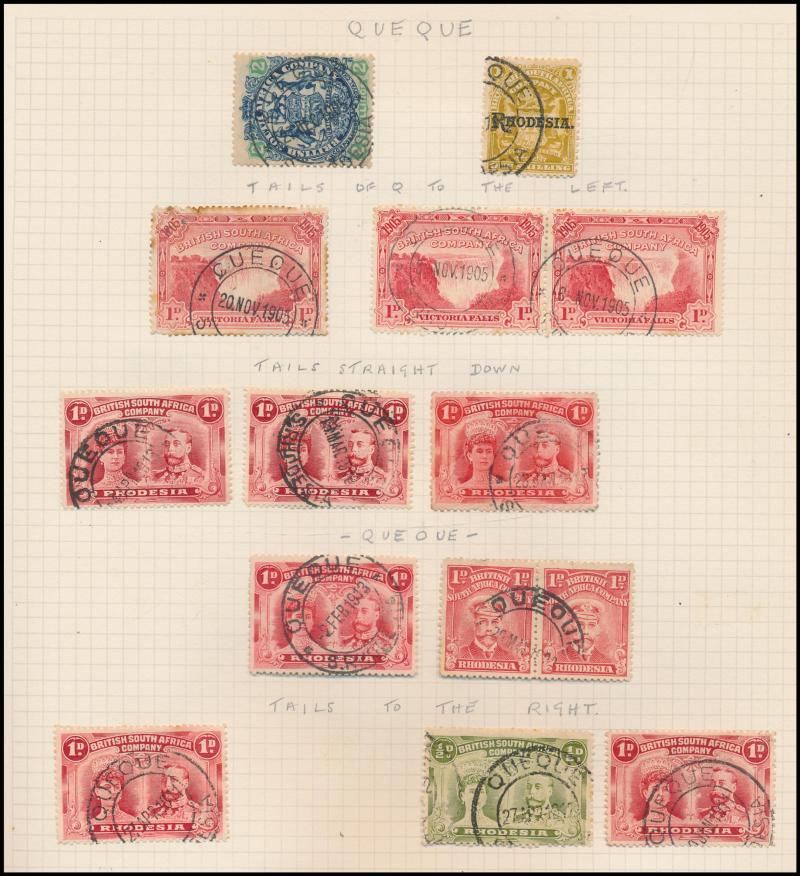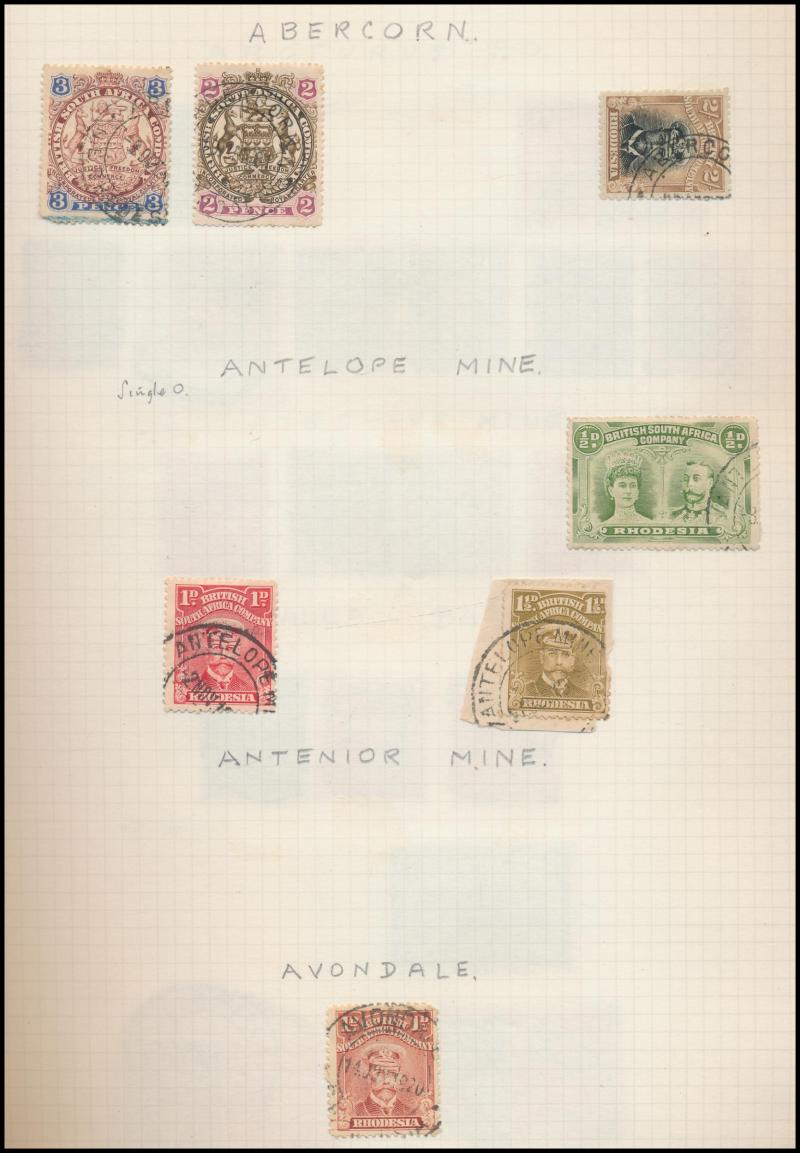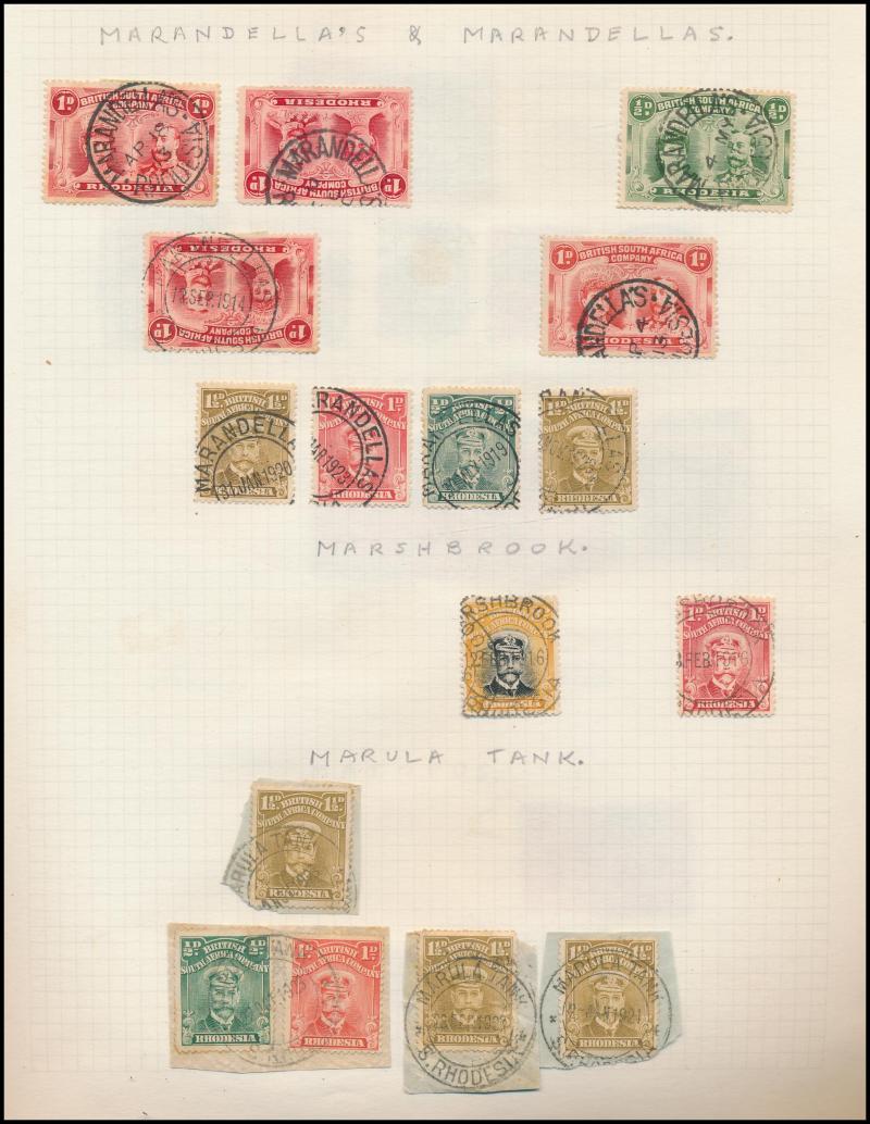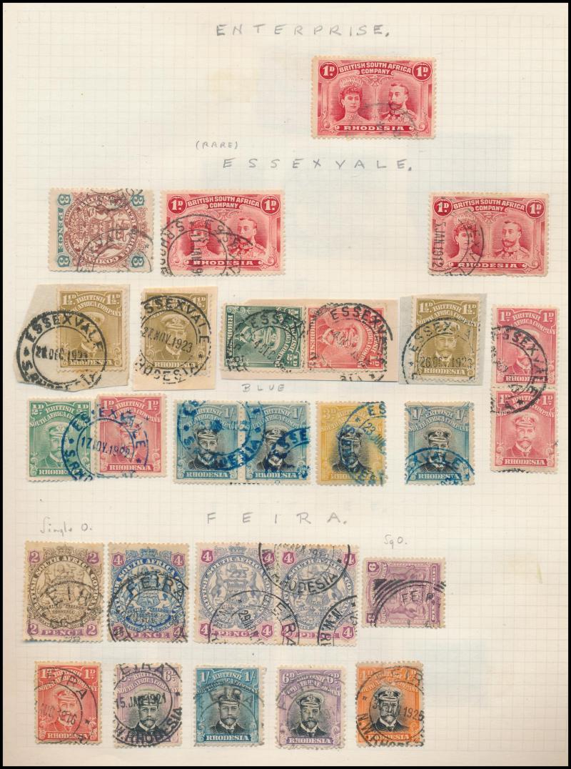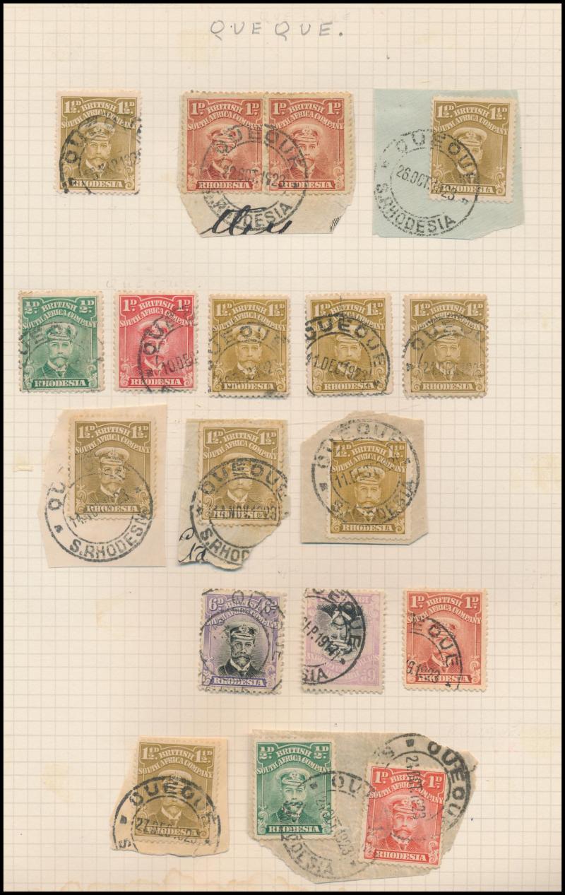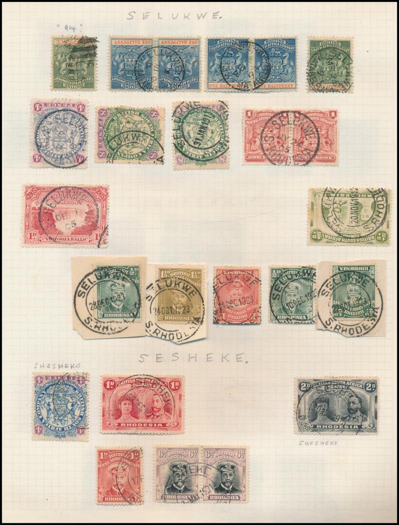 parcels cancels, then 'AYRESHIRE MINE', 'CHARTER', 'INYANGA', 'KANSANSHI' on 'RHODESIA' overprint 2d brown, 'KASEMPA' on 10/- grey-green, 'M'REWAS', 'NAWALIA' Squared-Circle, 'ORTONS DRIFT' on ½d pair, 'VERACITY', on Victoria Falls 'BELINGWE' superb