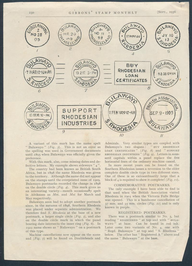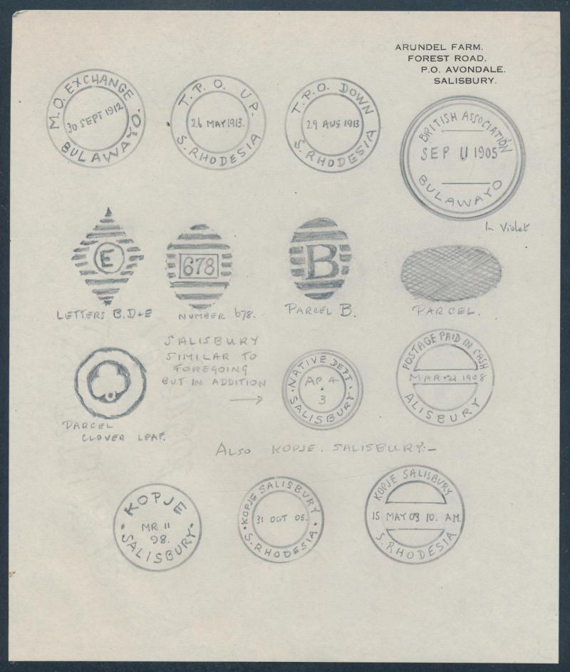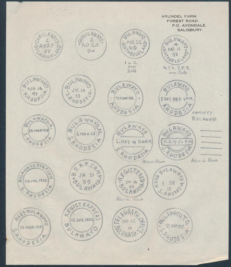 on the Native Counter; not recorded in the Handbook), 'SYRINGA', 'TARN ESTATE' and 'UMSWESWE' (two-digit year), and many more, also Bulawayo '678' numeral on Arms 4d and cds on Mashanaland Postal Card 1d with Arms ½d added, 'PAULINGTON' on Double