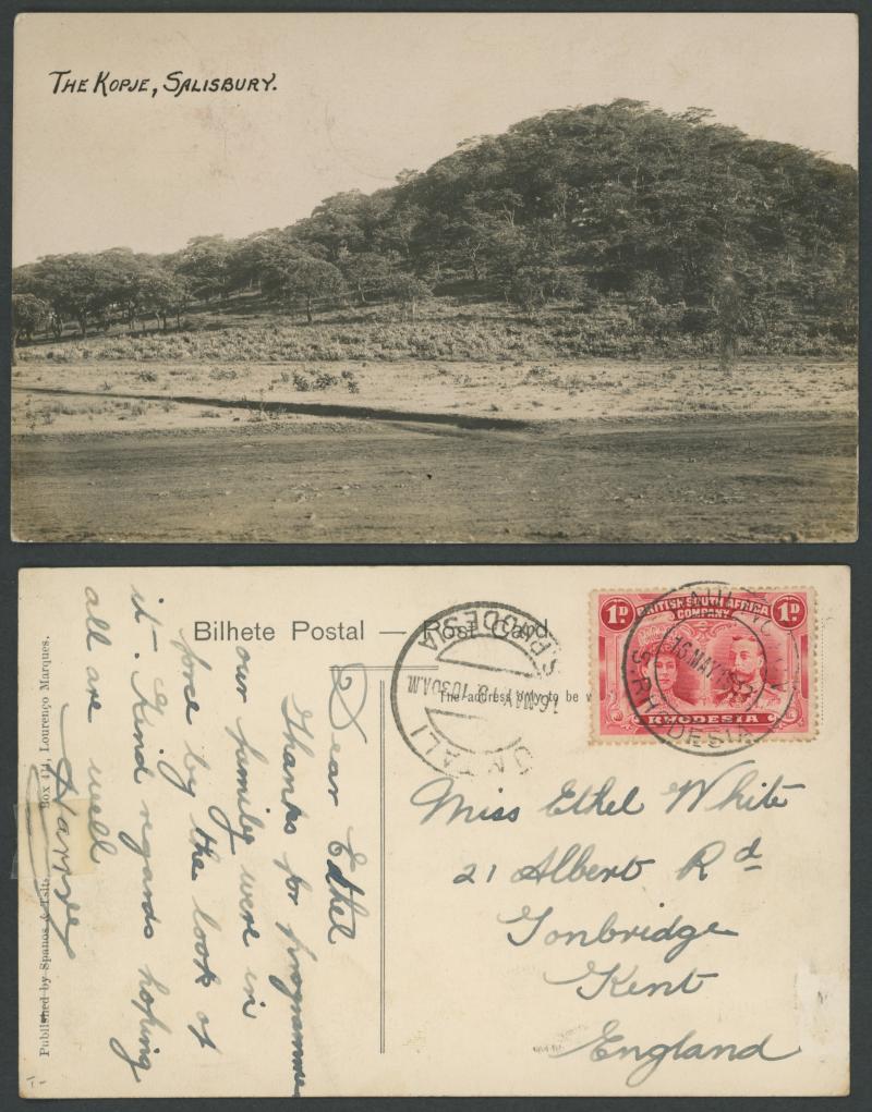 Head 1d on 'Umtali Park' picture postcard, 'KOPJE/SALISBURY' on 1899 redirected cover front (faults), and 'R SALISBURY/S.RHODESIA' boxed handstamp (unlisted by Proud) tying Arms 1d block of 4 on registered cover to USA, plus Nyasaland 'CHIROMO' &