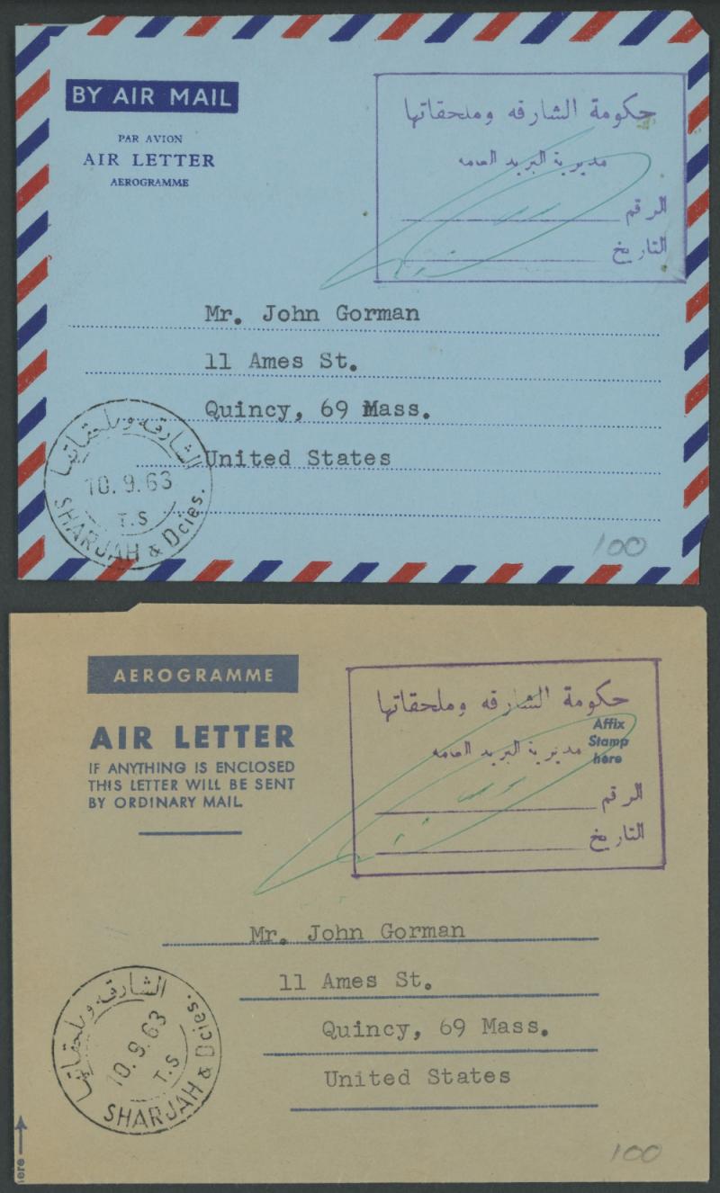 each with bi-lingual '...10.9.63/ T.S /SHARJAH & Dcies' cds & Arabic boxed Post Office (?) cachet in violet, addressed but probably not posted.