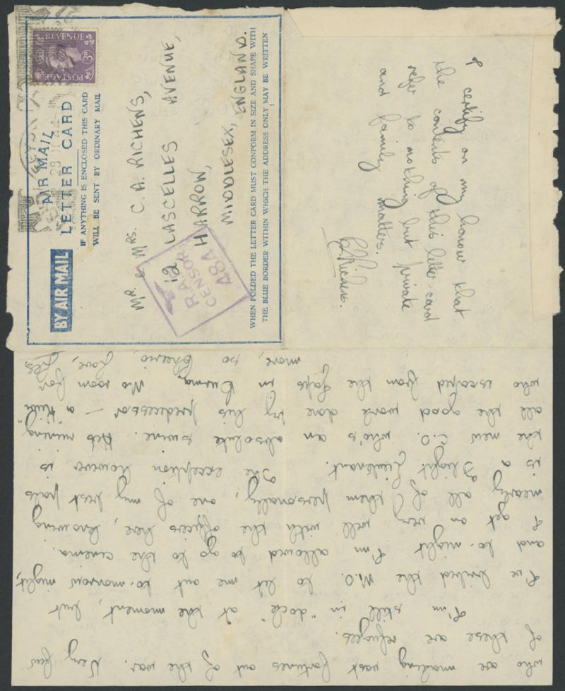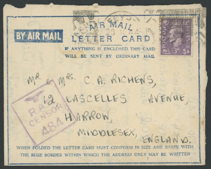 headed "No 44 Staging Post/RAF PAIFORCE/20th October 1944", to Middlesex GB with boxed 'RAF/CENSOR/484' and GB 3d tied as usual by 'EGYPT/28OC44/POSTAGE/PREPAID' machine. Persia & Iraq Force (PAIFORCE) was operational in Iraq from 1942. Staging Post