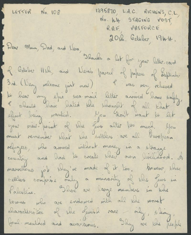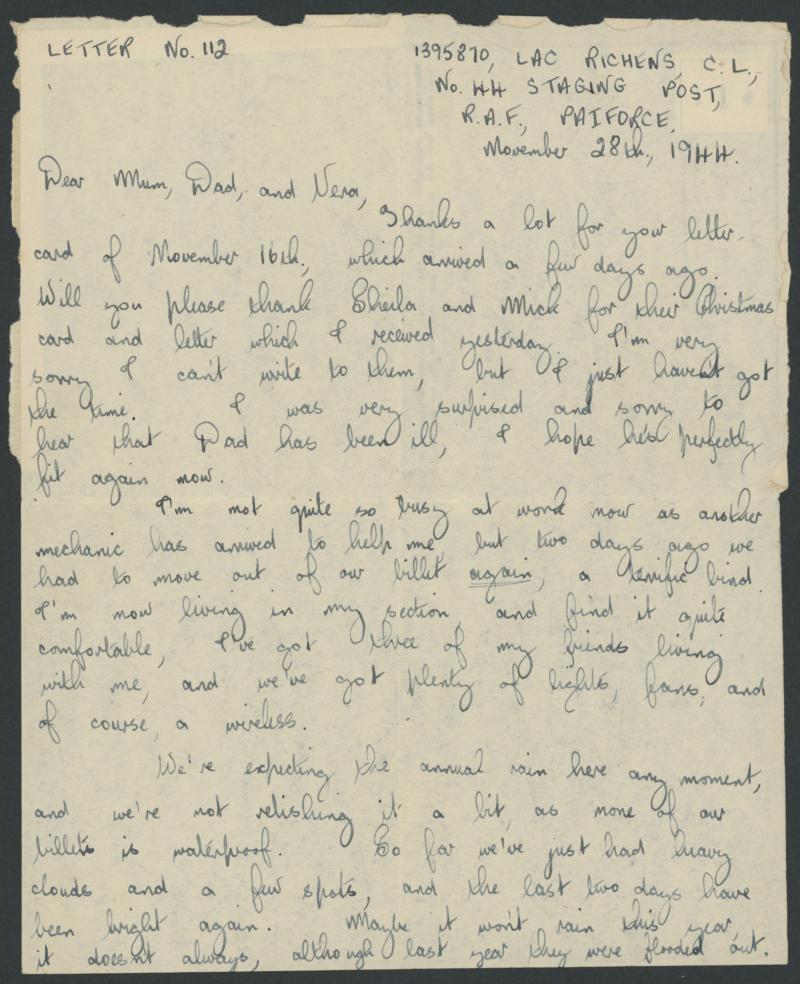 writer states: "...We're expecting the annual rain...none of our billets is waterproof...I've got so many films from the Americans that I'm having to show two every night..." (Image1) (Image2)