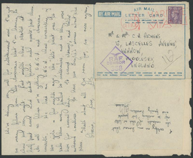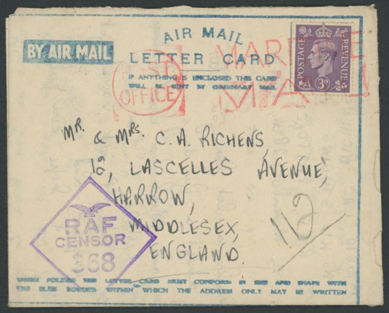headed "No 44 Staging Post/RAF PAIFORCE/November 28th 1944", to Middlesex GB with diamond 'RAF/CENSOR/368' and GB 3d tied unusually by British undated 'POST/OFFICE - MARITIME/MAIL' machine cancel in red, minor peripheral damage from opening. The