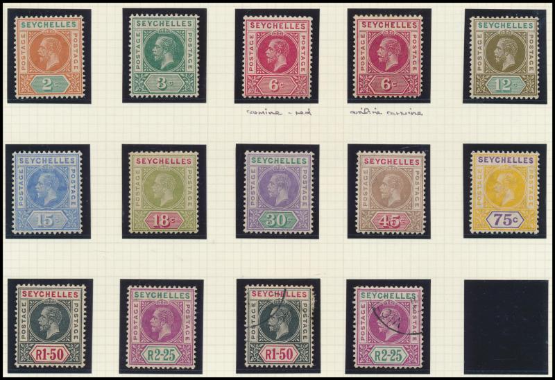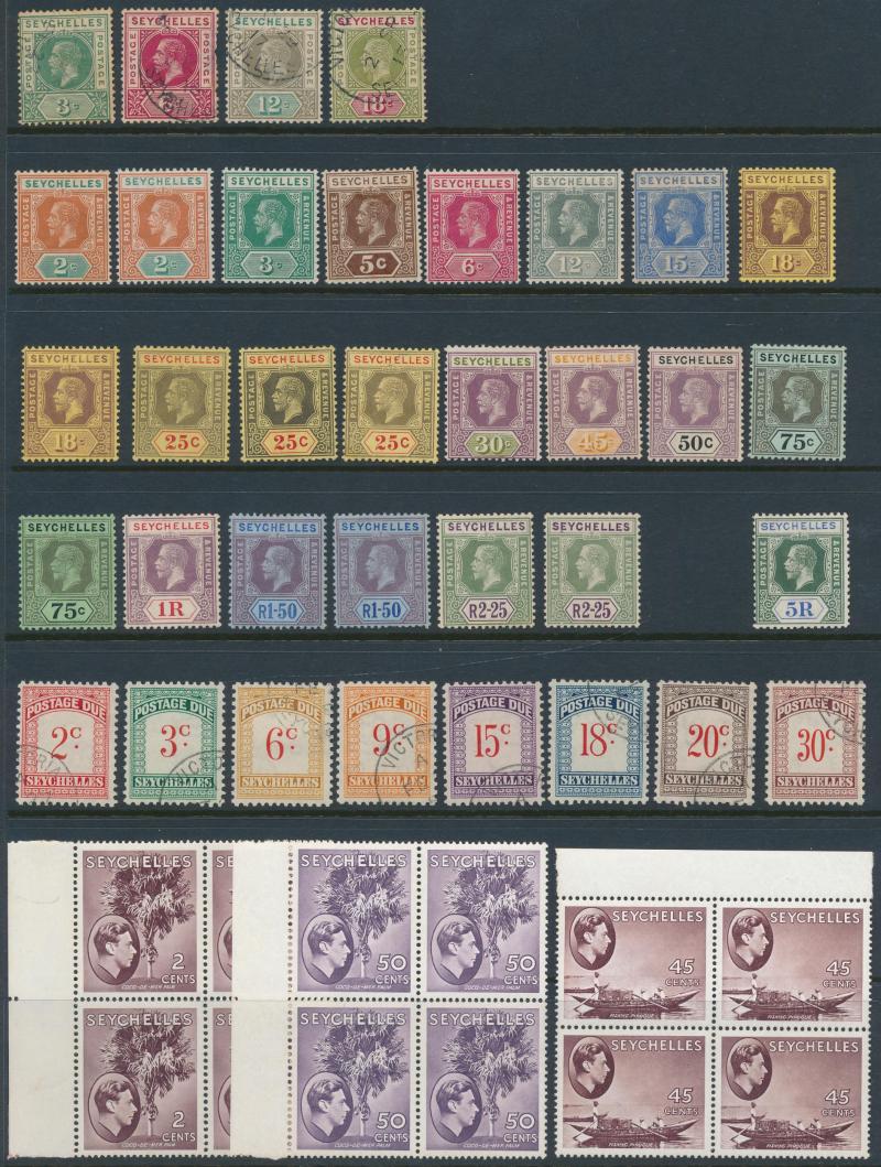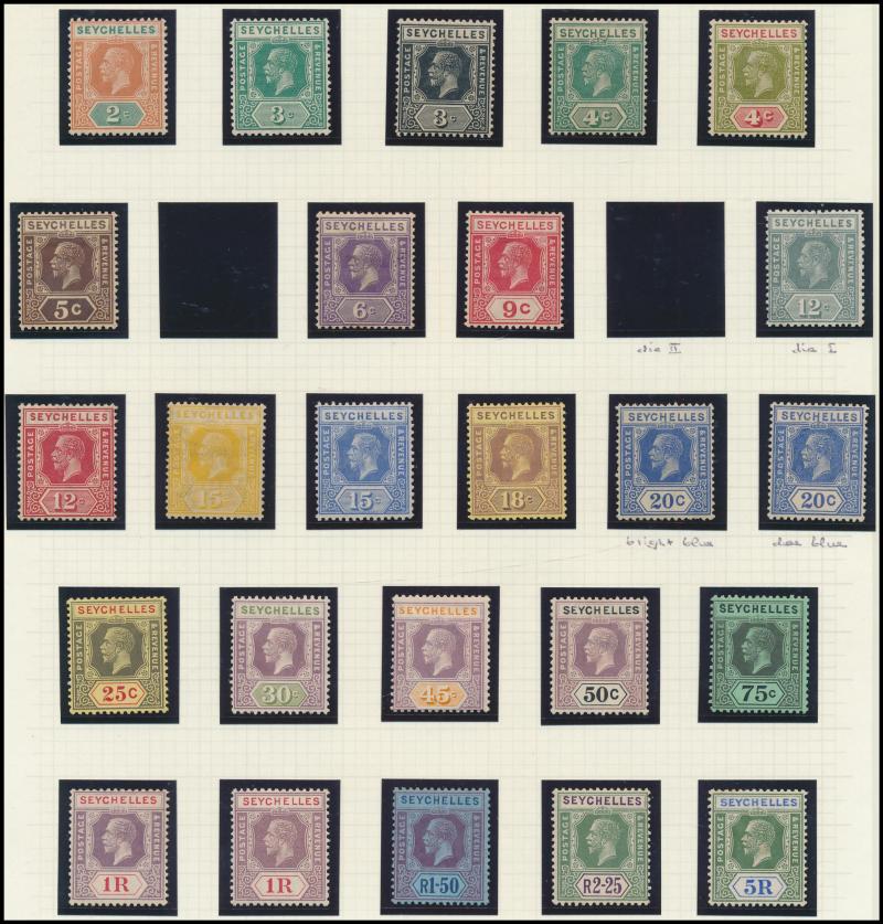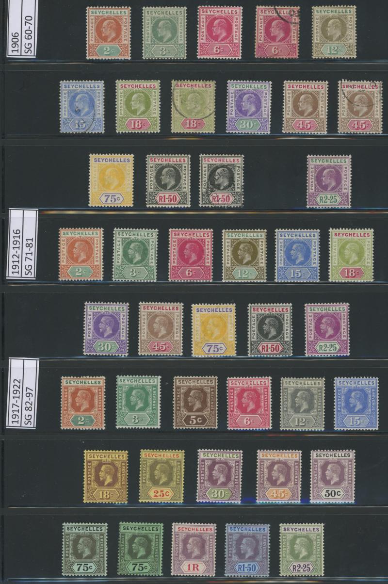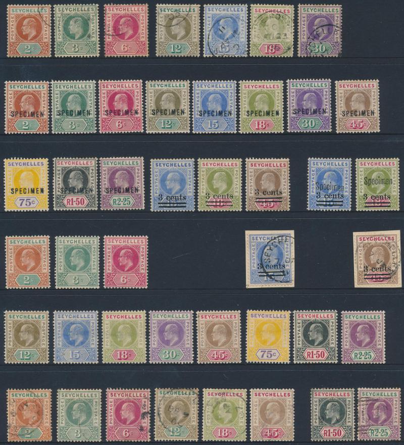 1903 KEVII Keyplates Crown CA Wmk set * & 'SPECIMEN' overprints, 1903 Local Surcharge '3 cents' on 18c used, 1906 KEVII Keyplates Multiple Crown CA Wmk set * and 1r50c & 2r25c used, 1912-16 KGV 'POSTAGE/POSTAGE' Keyplates set *, 1917-22 'POSTAGE &