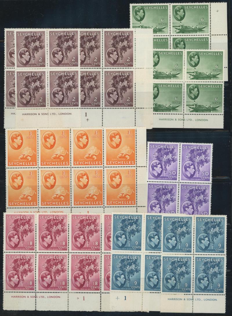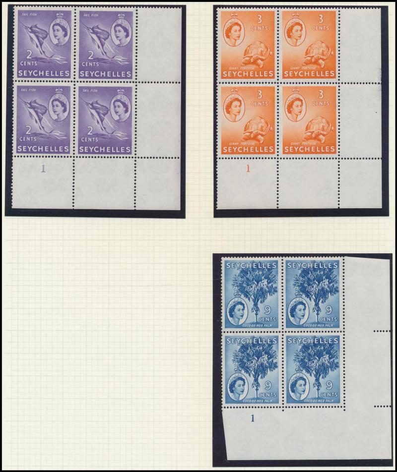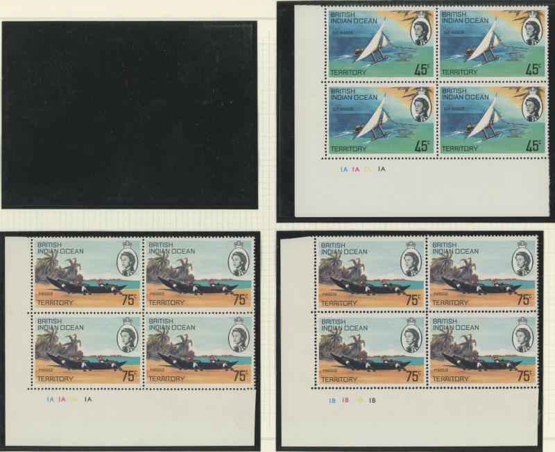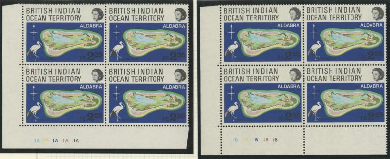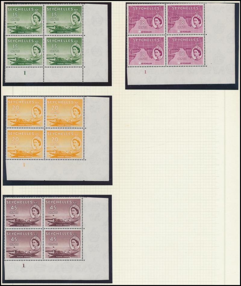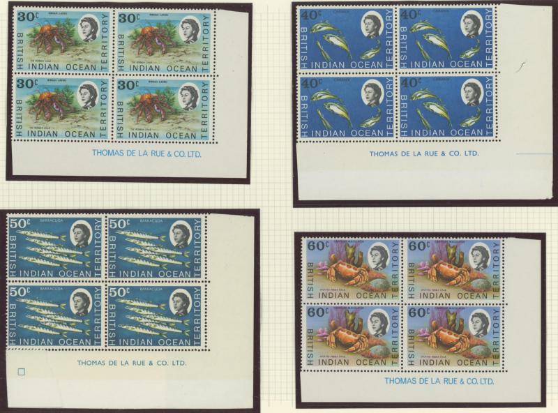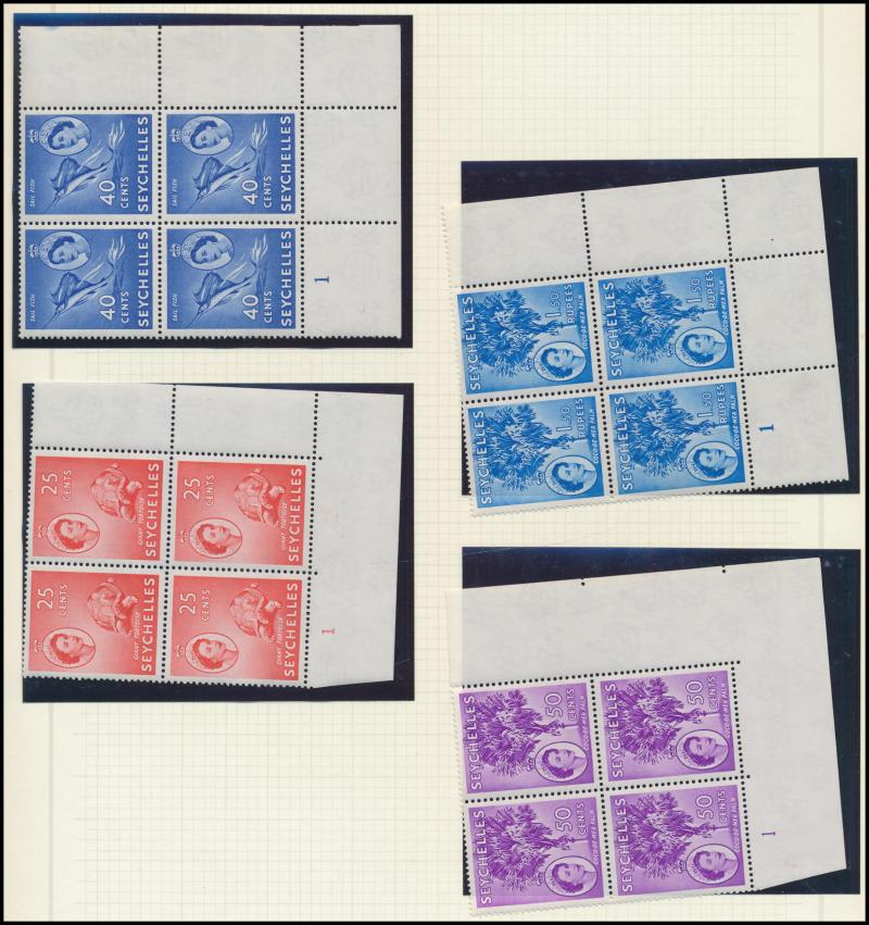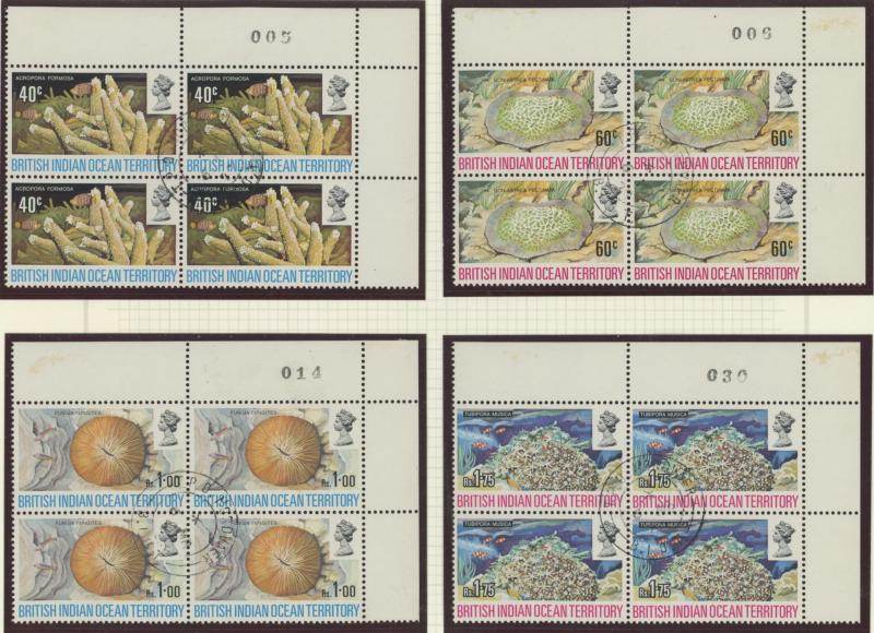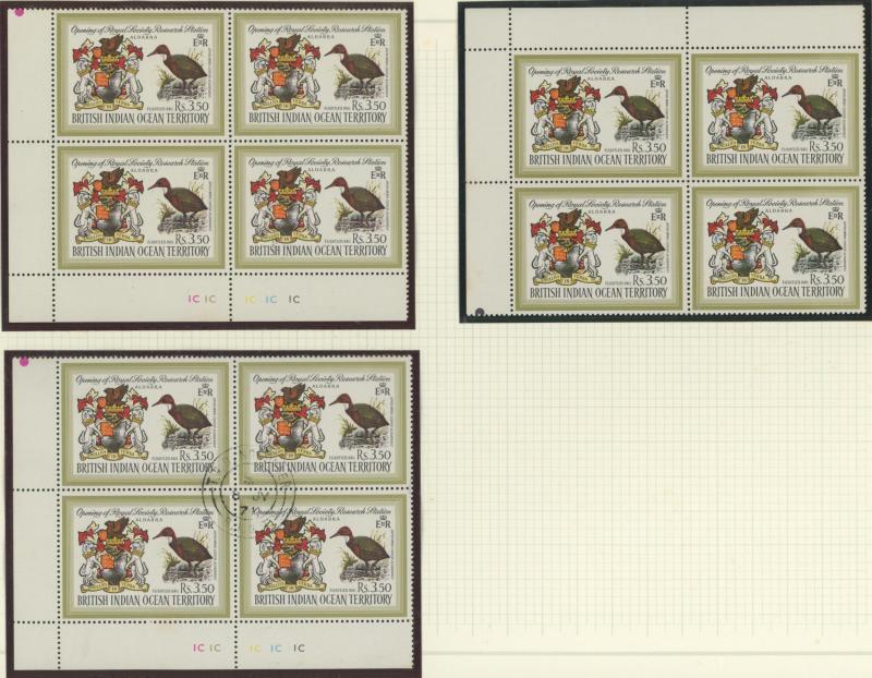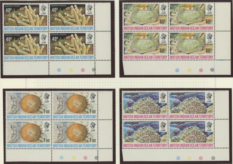 Number blocks of 4 **, 1971 Aldabra Station blocks of 4 ** x2 one with Plate Number '1C' plus block of 4 CTO, and 1972 Corals in blocks of 4 ** & CTO, condition generally very fine, Cat £800+.