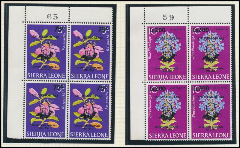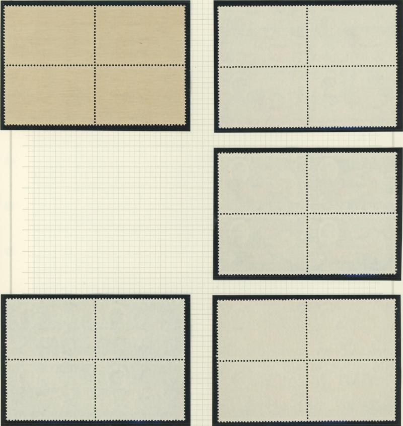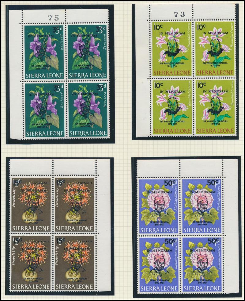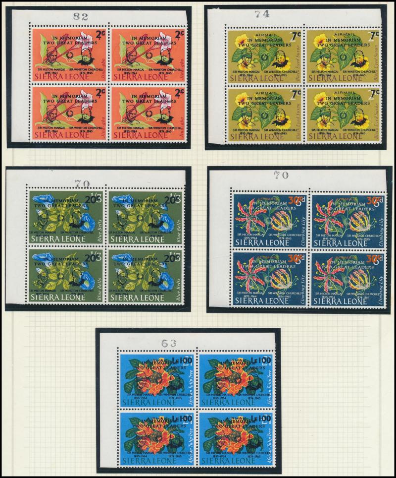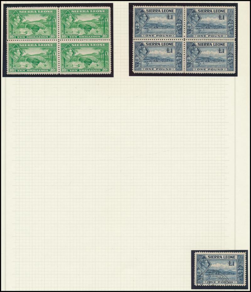 set * plus 10/- & £1 blocks of 4 ** (tropicalised gum) and £1 used, 1948 Silver Wedding £1 block of 4 **, 1953 Flowers ** & used and New Currency overprints ** & used plus 1965 Two Great Leaders overprints in blocks of 4 **, etc, condition a little