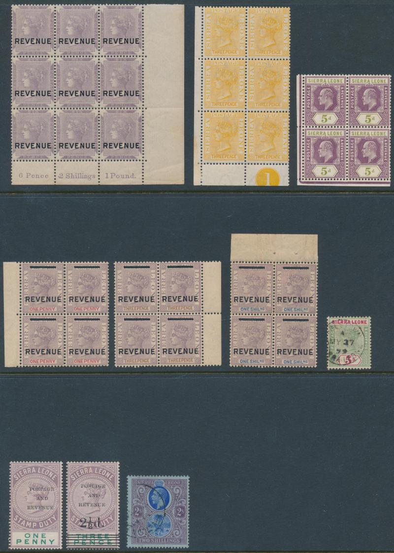 1/- brown * & used x2, 1884 'REVENUE' Overprints 6d lilac corner block of 9 ** and 1d, 3d & 1/- blocks of 4 **, 1896-97 QV Keyplates 1½d, 5/- (faded) & £1 used, 1897 Overprints on Fiscal Stamps 1d, Type 10 2½d on 3d & Type 8 2½d on 6d *, 1903 KEVII
