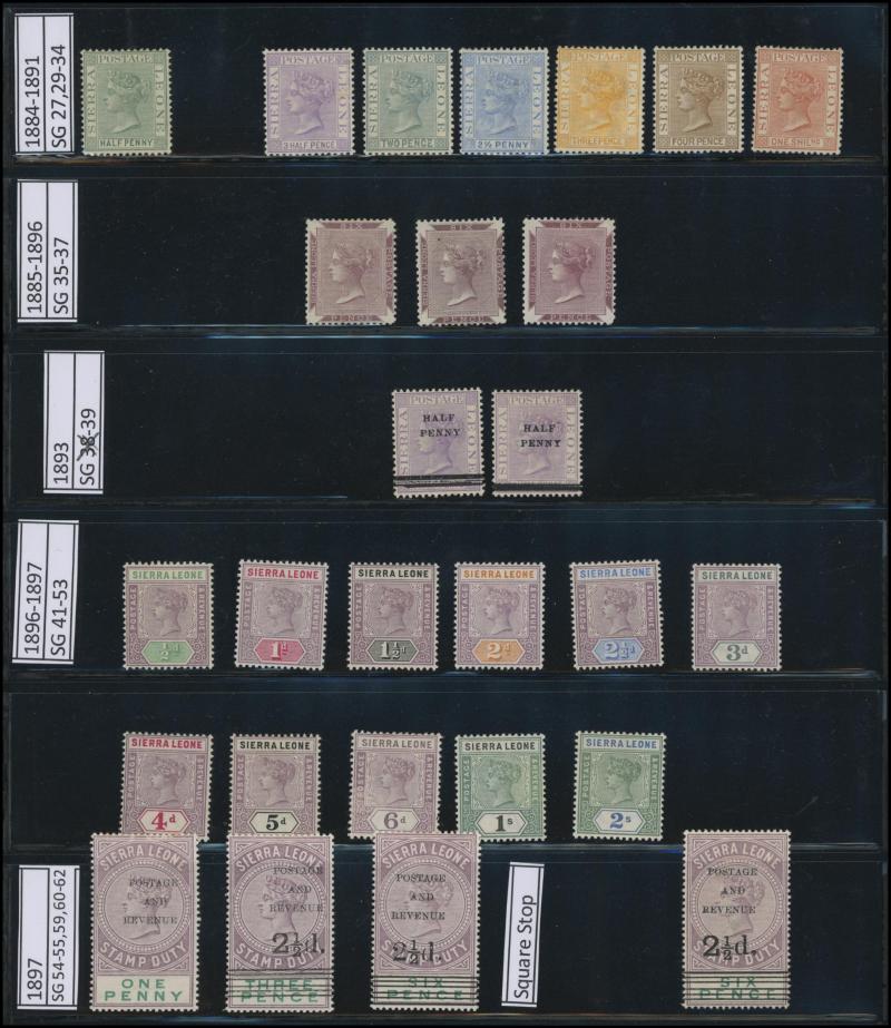 used, and Perf 14 1d rose-red & 1/- green, Crown CA Wmk ½d brown & 2d magenta, and 1884 New Colours set plus extra 2d grey, 2½d blue & 1/- brown, then 1896-97 QV Keyplates set to 5/-, 1897 Overprints on Fiscal Stamps Type 8 with Square Stop & Type 10