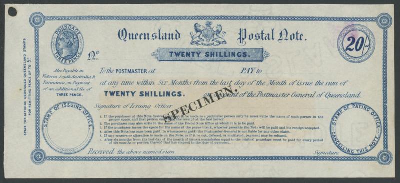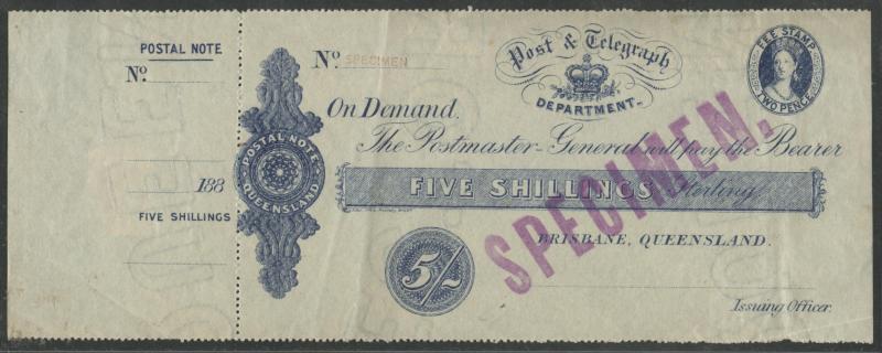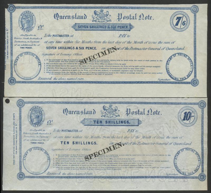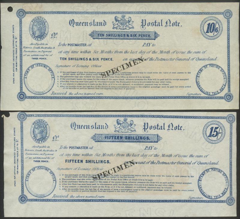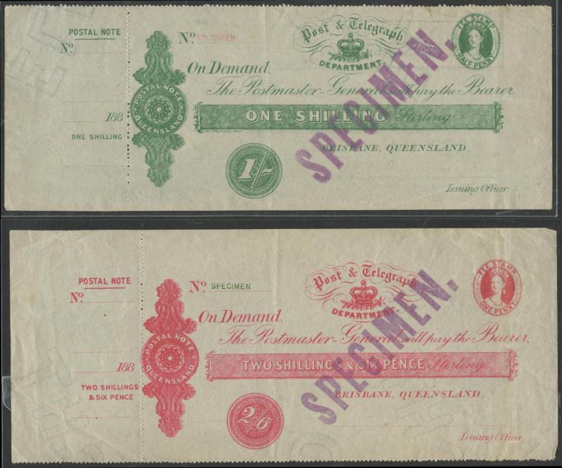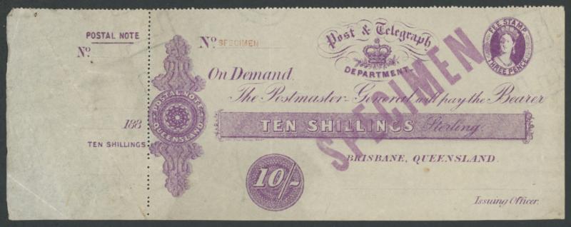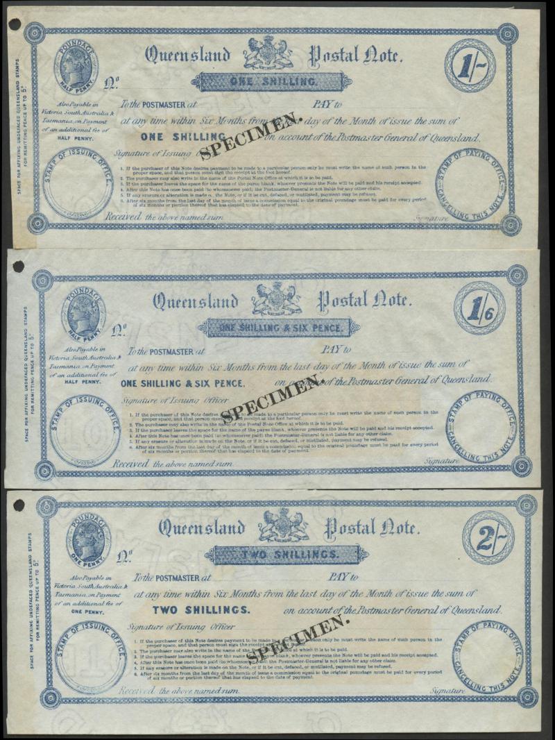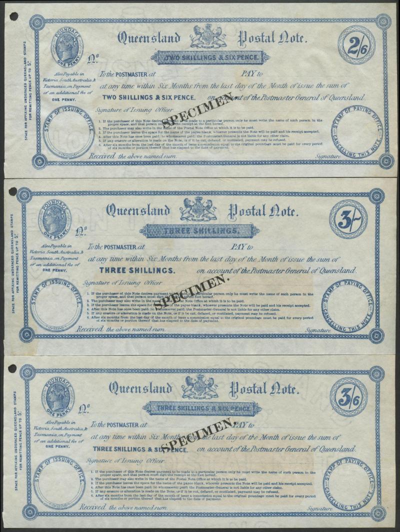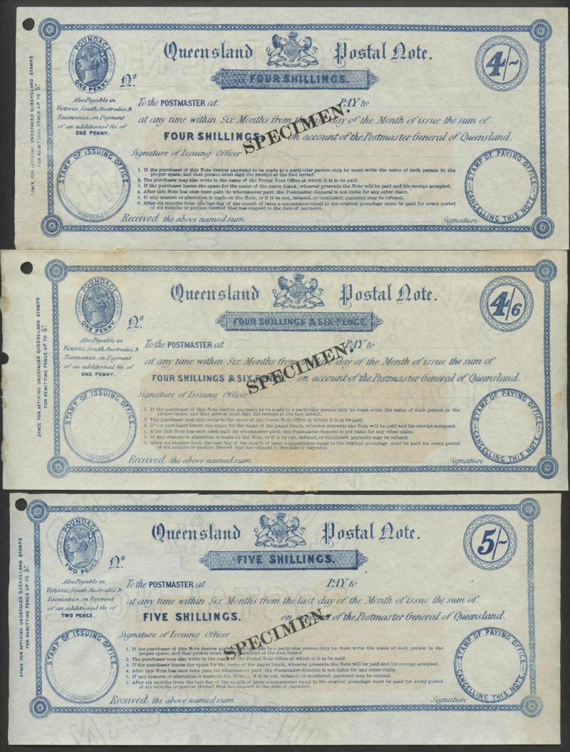 POSTAL NOTES: 1880 Wmk 'ELECTORS RIGHT/QUEENSLAND' QV 1/- green, 2/6d crimson, 5/- indigo & 10/- violet (the counterfoil creased)