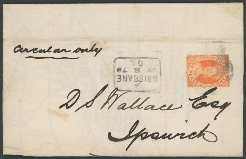 1878 entire endorsed "circular only" to Ipswich with QV Chalons 1d vermilion tied by poor cancel but with very fine strike of the