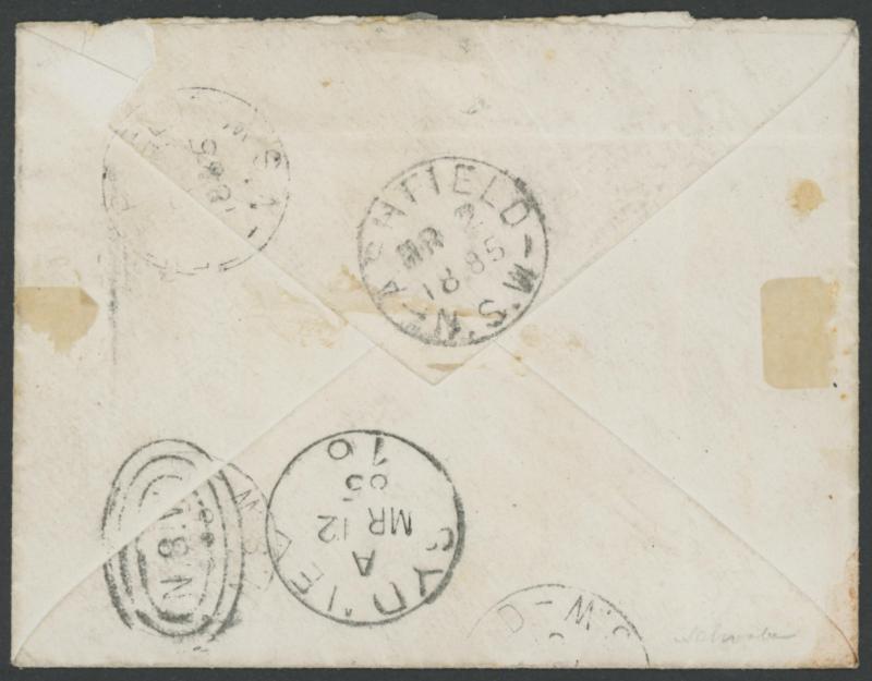 '81' Numeral-in-Rays and very fine 'WARWICK/QUEENSLAND' unframed cds with fleurons at lower-left over-struck by very fine 'INSUFFICIENTLY/PRE-PAID' rounded-boxed handstamp applied above the endorsement, Brisbane & 'PLYMOUTH/DE 5/82/SHIP-LETTER'