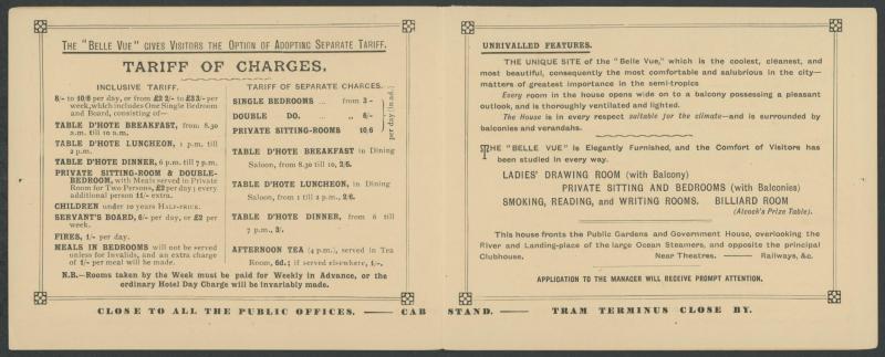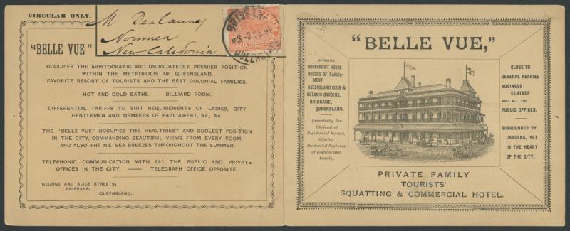 1892 illustrated fold-out advertising card for the Belle Vue Hotel in Brisbane, to New Caledonia with printed 'CIRCULAR ONLY'