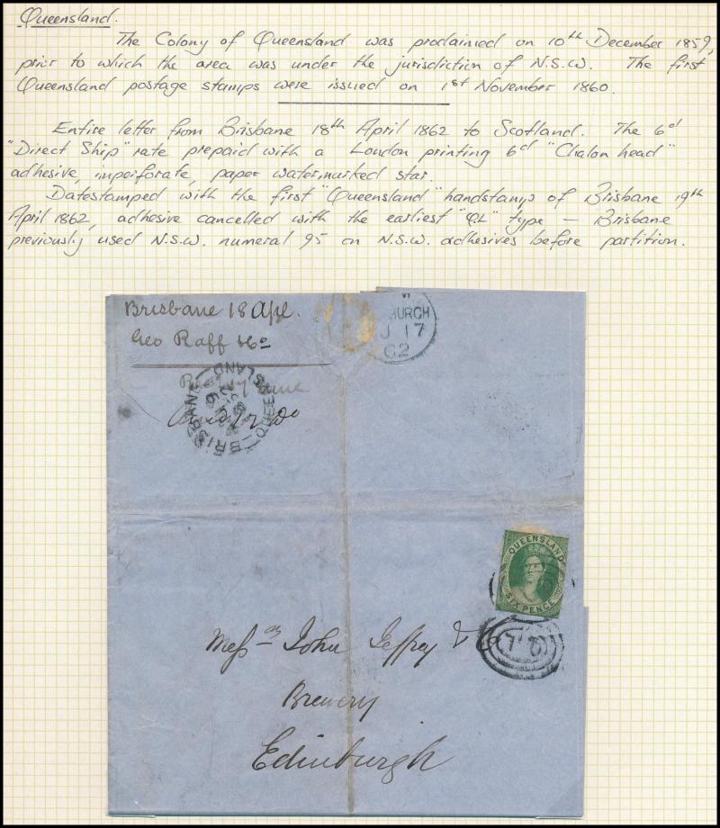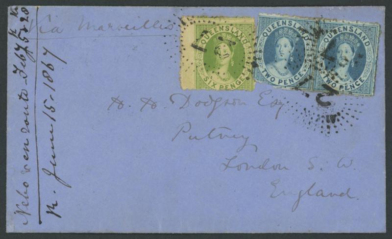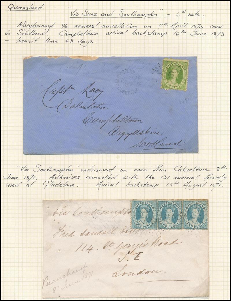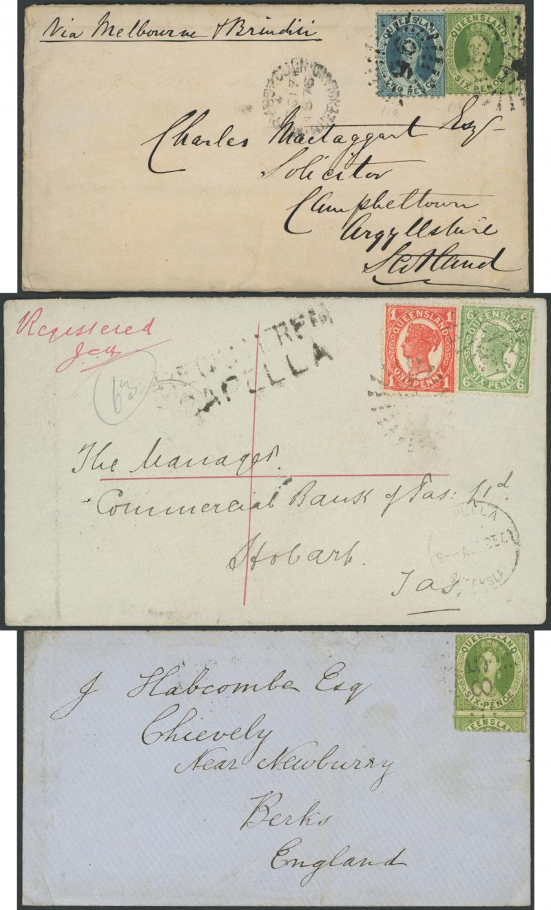 6d green (Grossly Misplaced Perfs) tied '85' Rays of Drayton, 1871 to England with Chalons 2d blue strip of 3 tied '131' Rays (RR) of Caboolture, 1876 to Scotland with Chalons 2d blue & 6d green tied '96' Rays of Maryborough, plenty of other postmark