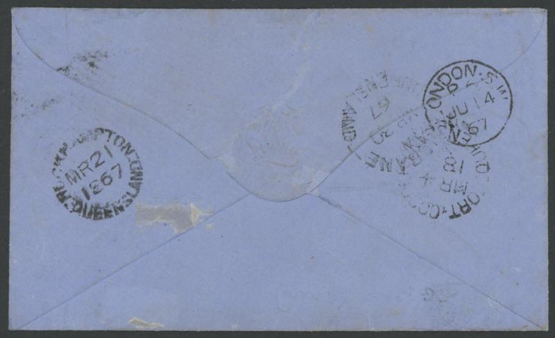 by two very fine strikes of Rays '27' (rated RRRR on Chalons), light but obvious 'FORT-COOPER' backstamp (LRD; rated RRRR) plus transits of Rockhampton & Brisbane and London arrival backstamp of 'JU14/67'. PO 1.1.1863; replaced by Nebo early-1864 but