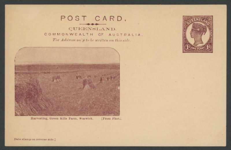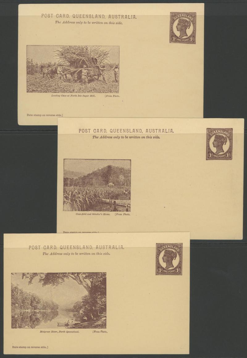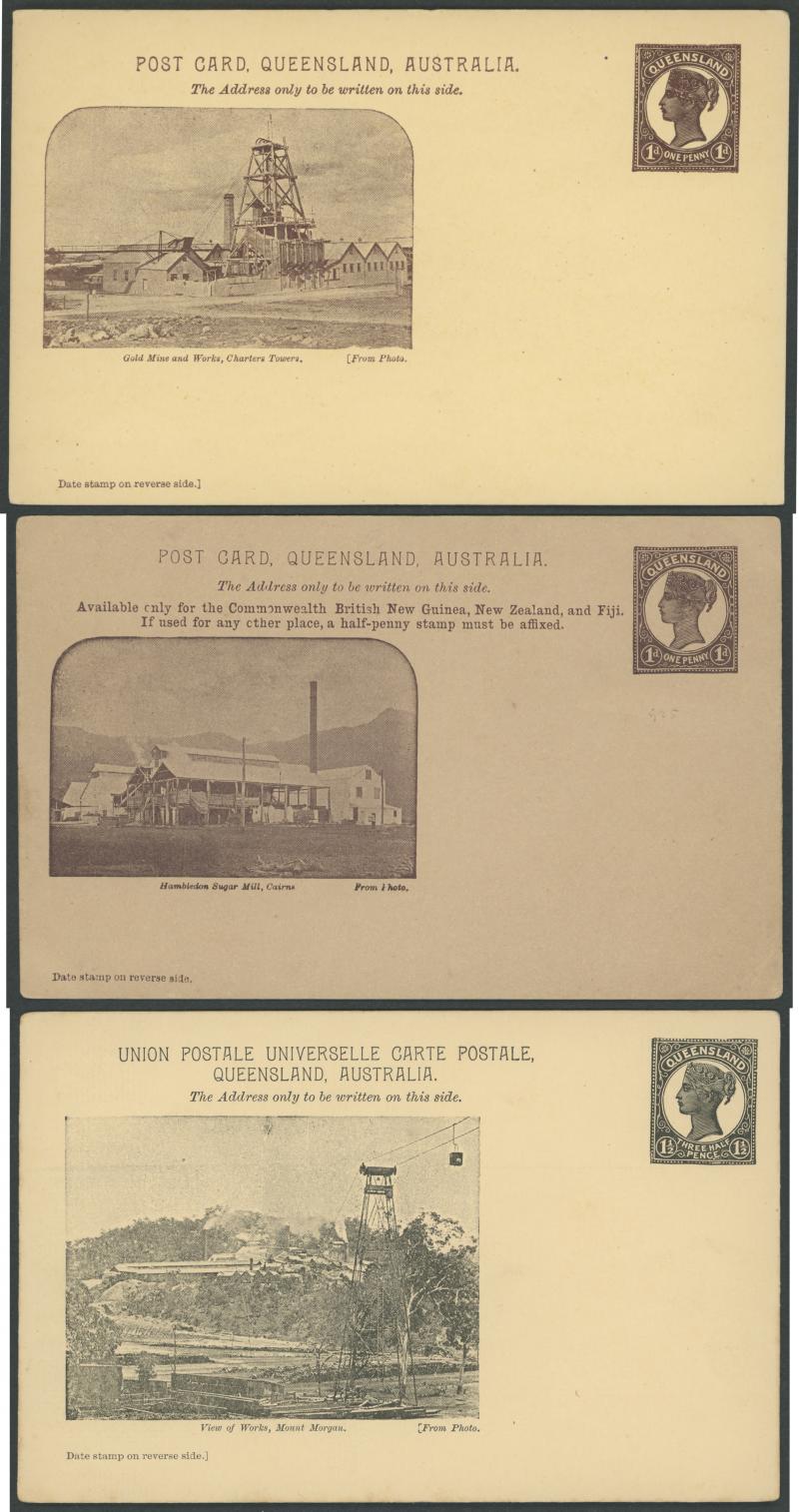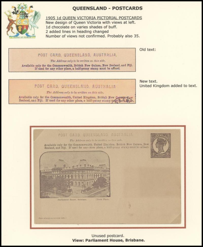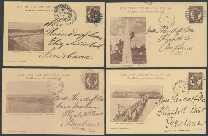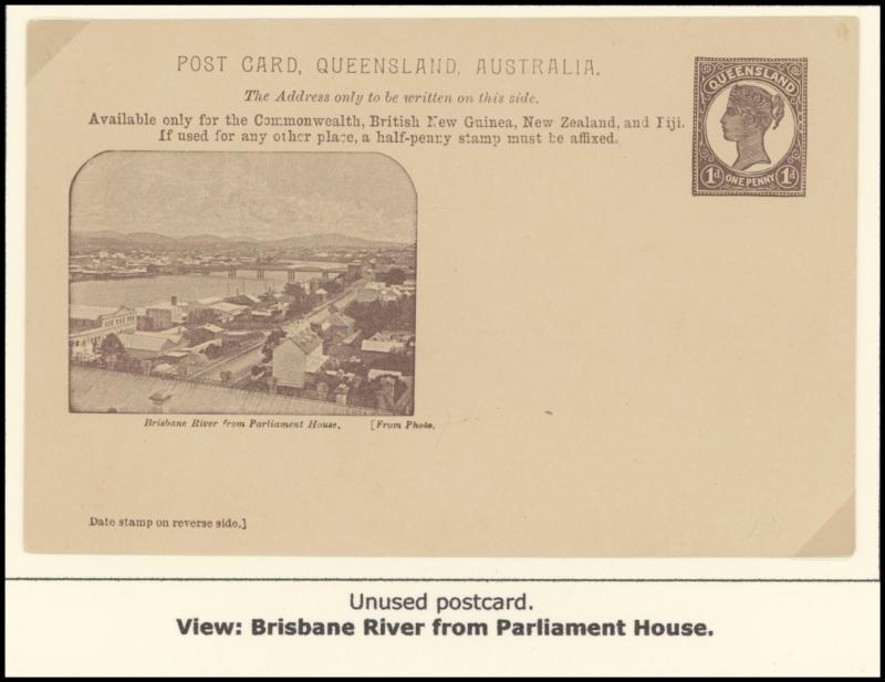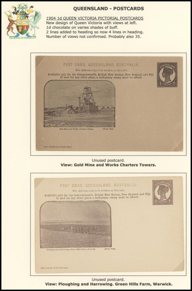 and Works, Charters Towers', 'Plowing and Harrowing, Green Hills Farm, Warwick, ' Hambledon Sugar Mill, Cairns' & 'Brisbane River from Parliament House' (Alan Griffiths: "This card [issue] is among the more scarce items ..."), 1905 QV 1d brown with