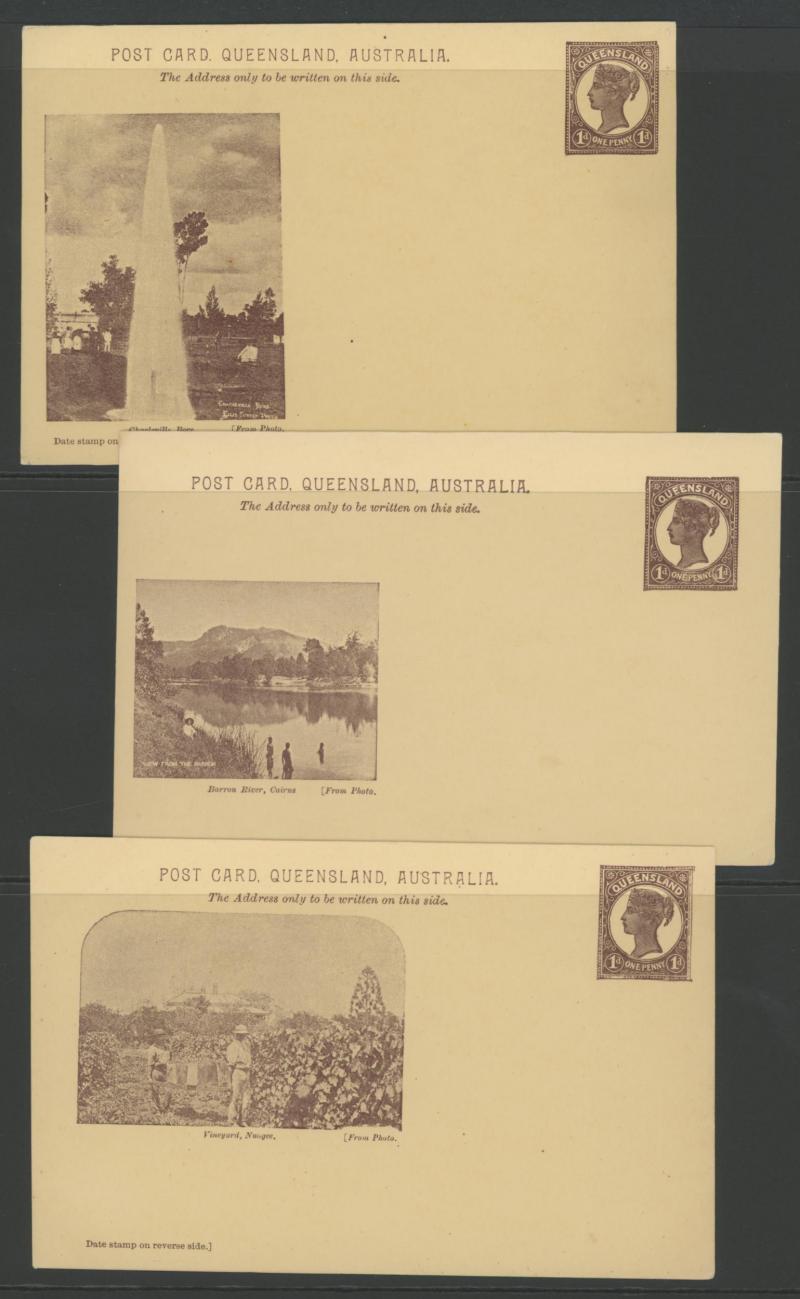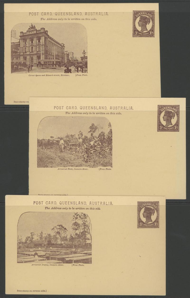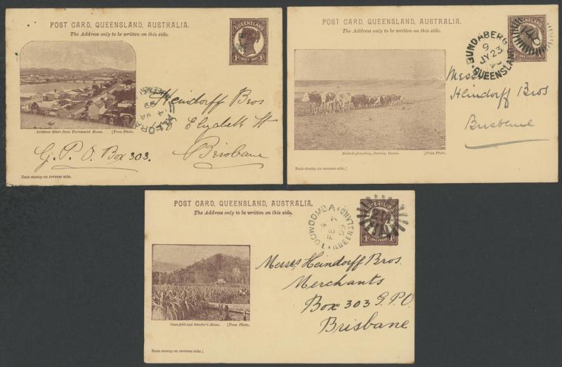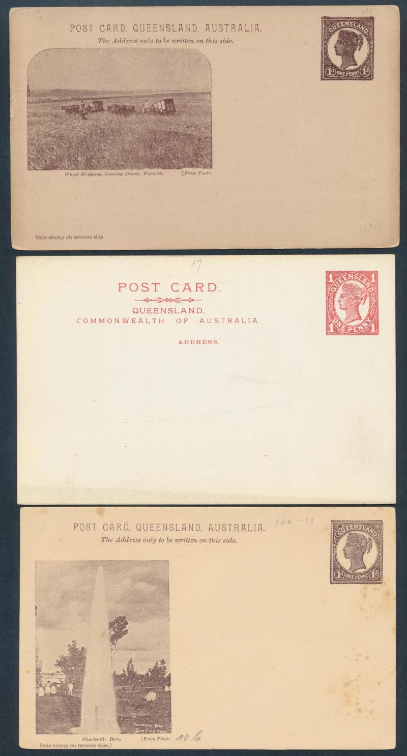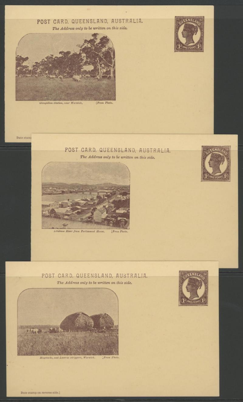 and Works, Charters Towers', 'Plowing and Harrowing, Green Hills Farm, Warwick, ' Hambledon Sugar Mill, Cairns' & 'Brisbane River from Parliament House' (Alan Griffiths: "This card [issue] is among the more scarce items ..."), 1905 QV 1d brown with